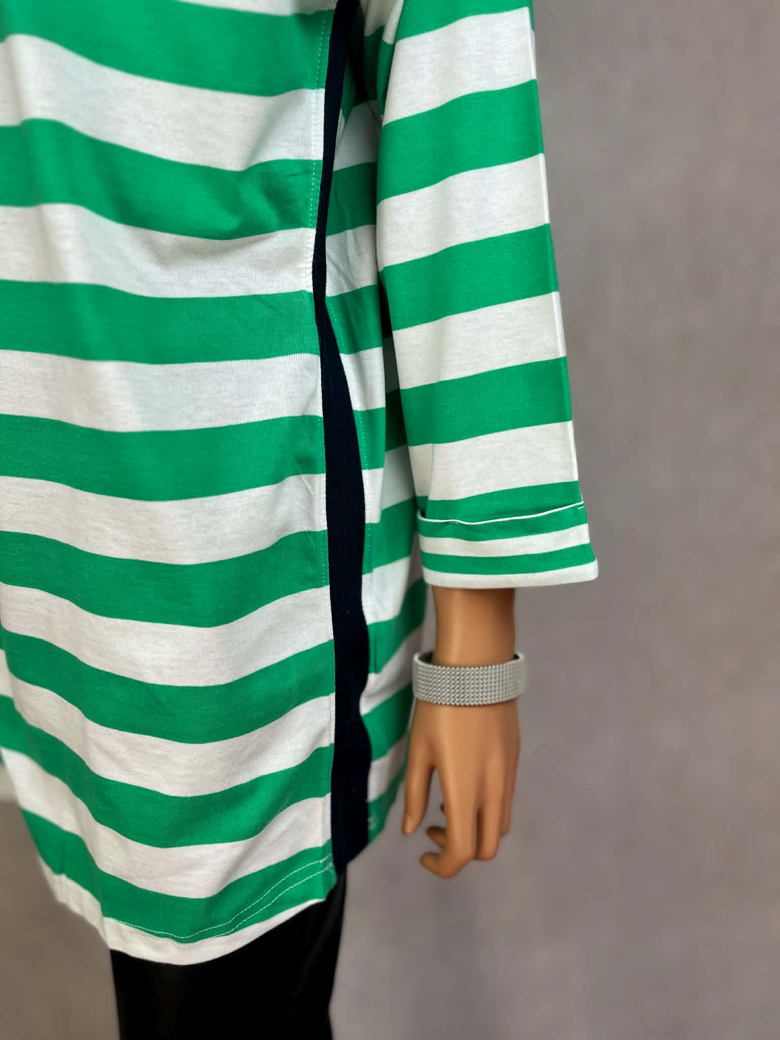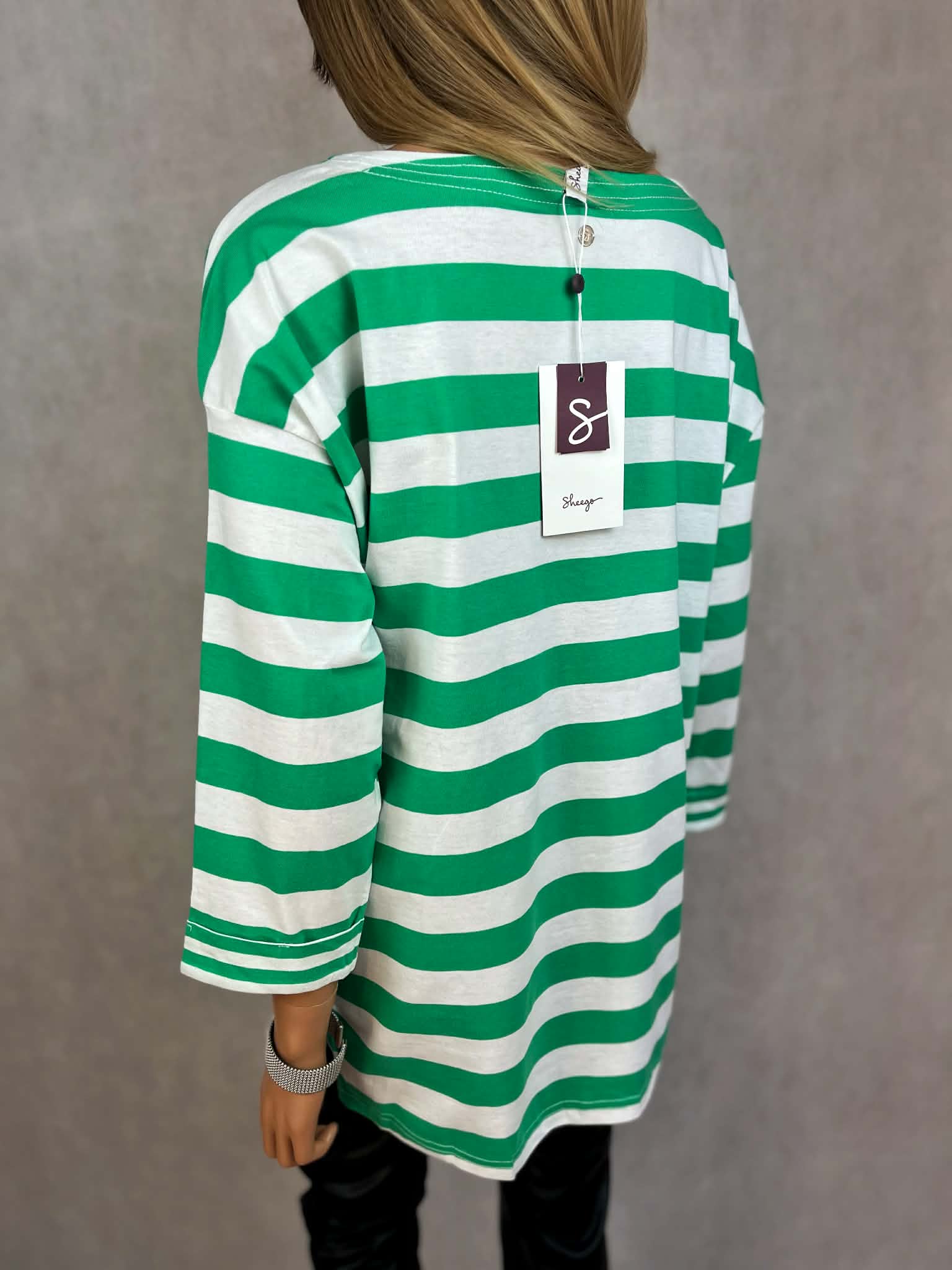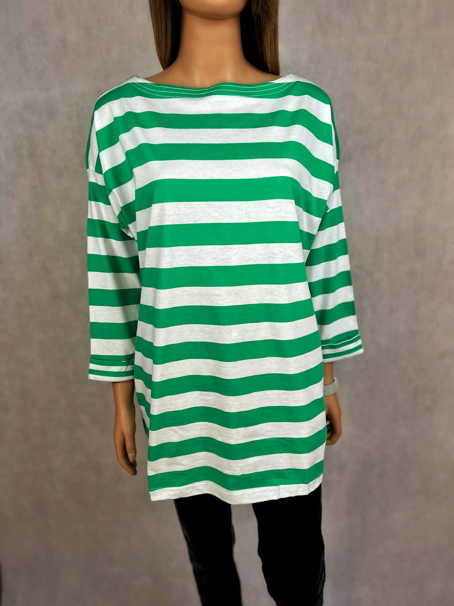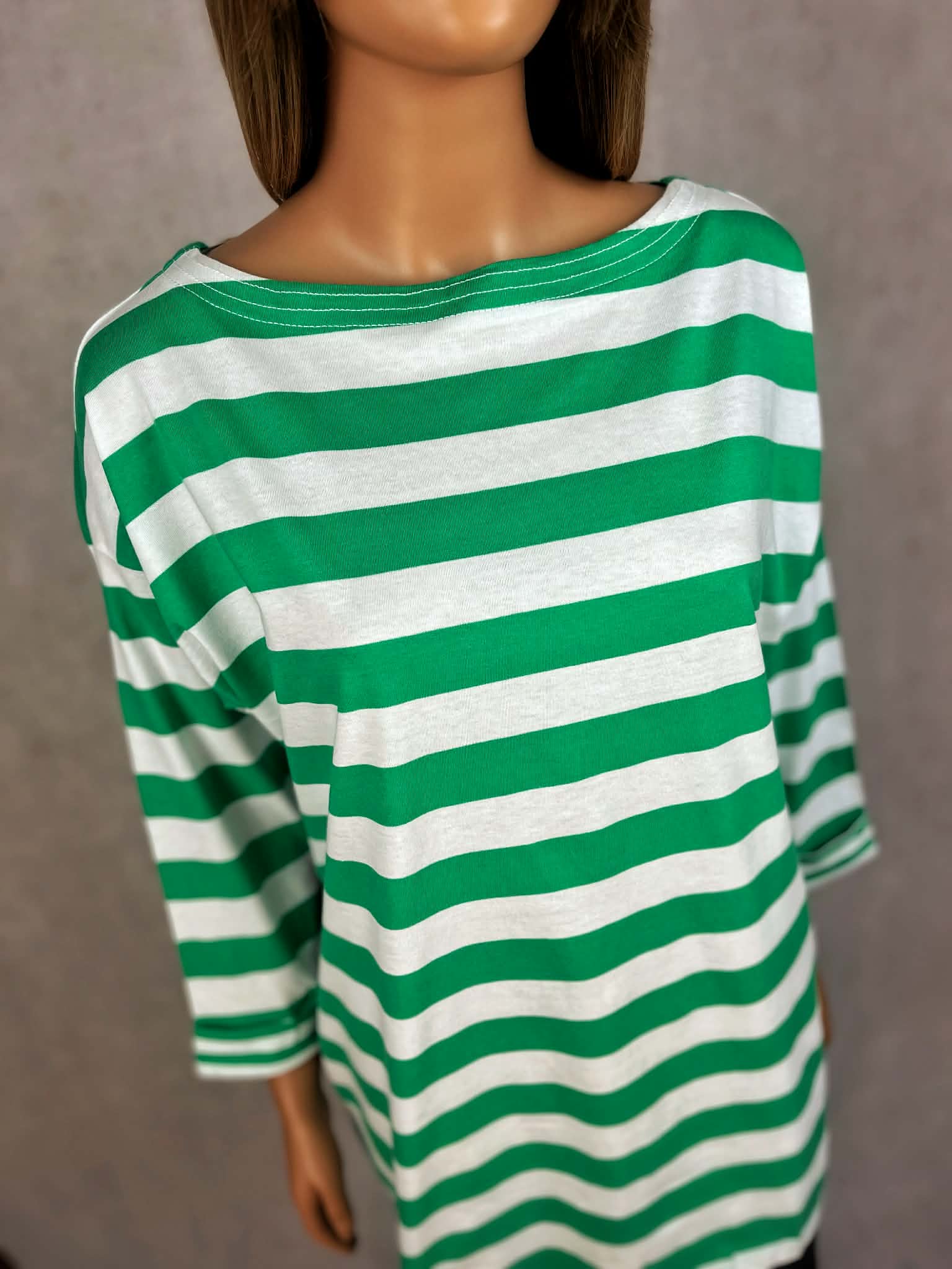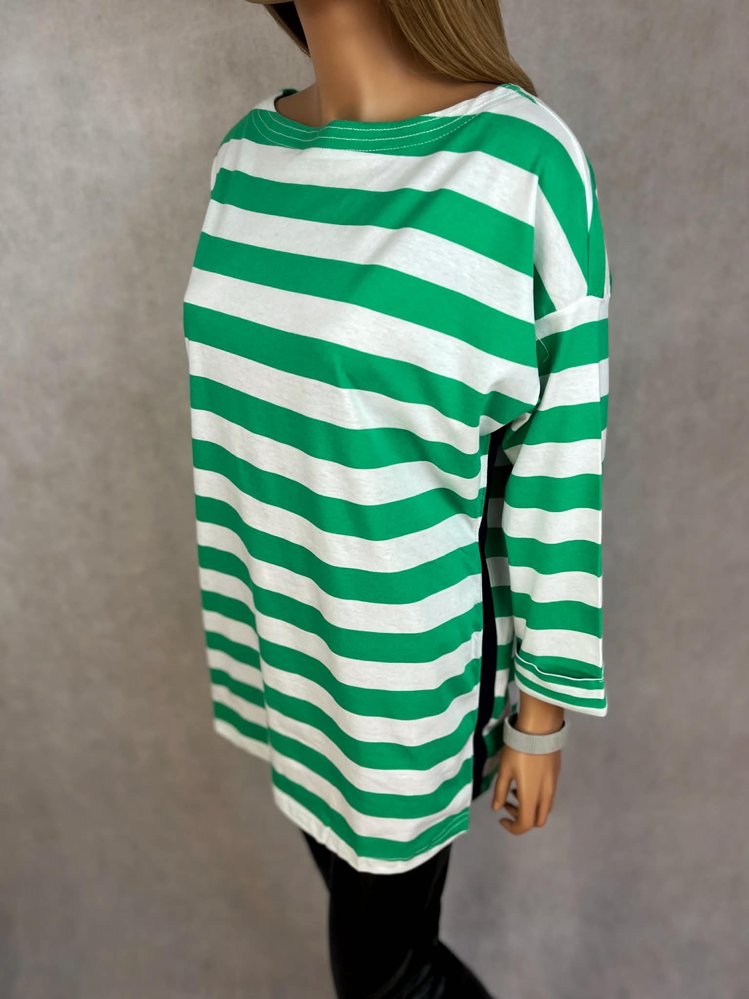Bawełniana bluzka damska oversize w zielono-białe paskiBawełniana bluzka damska oversize w zielono-białe paski