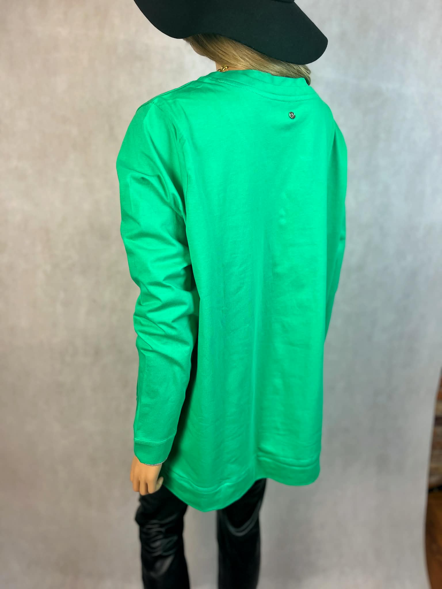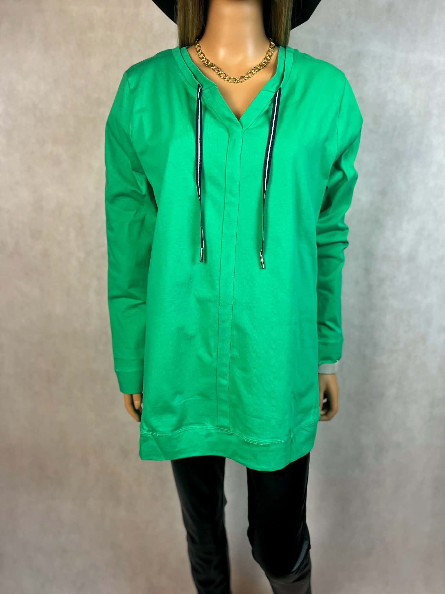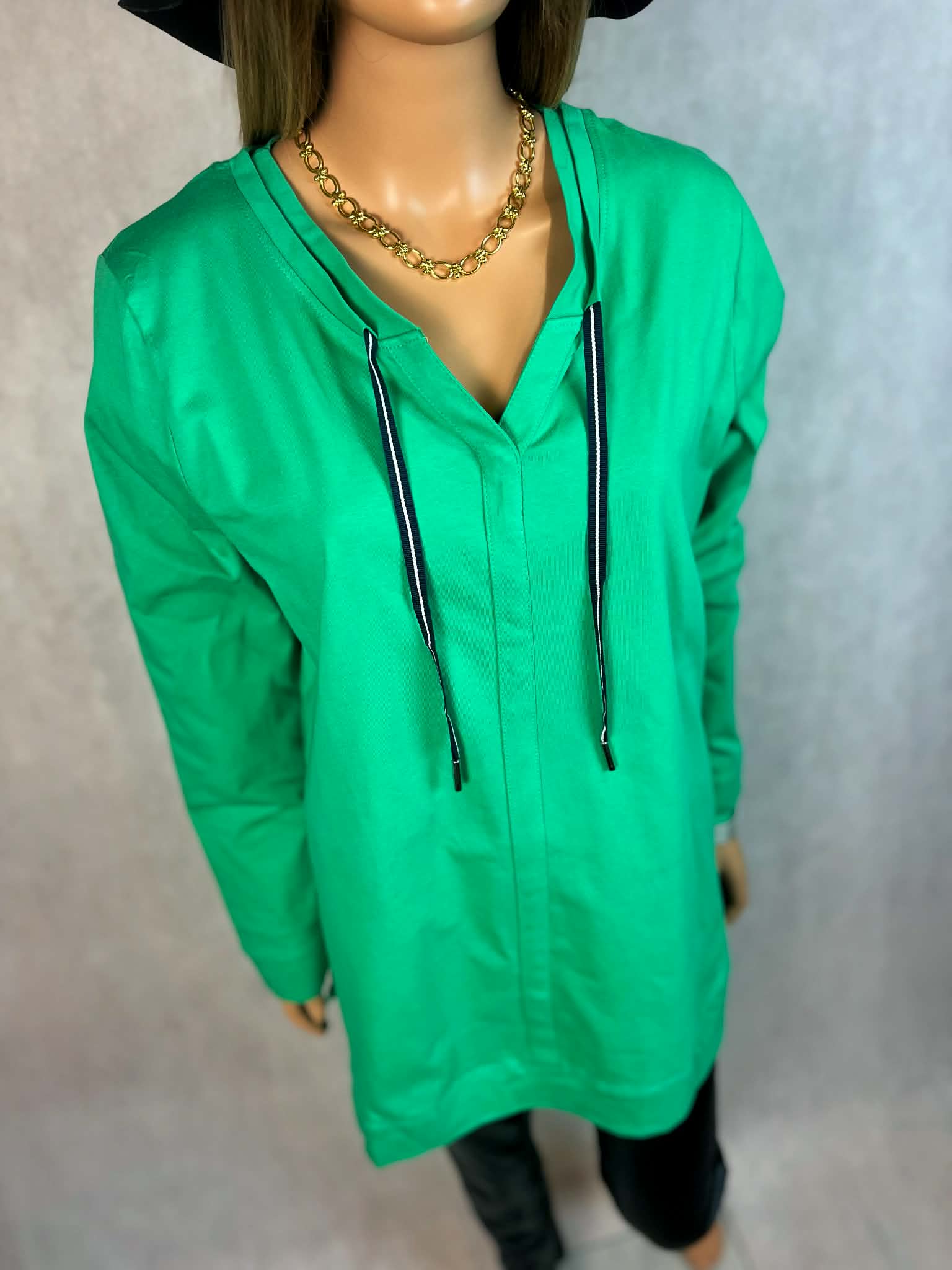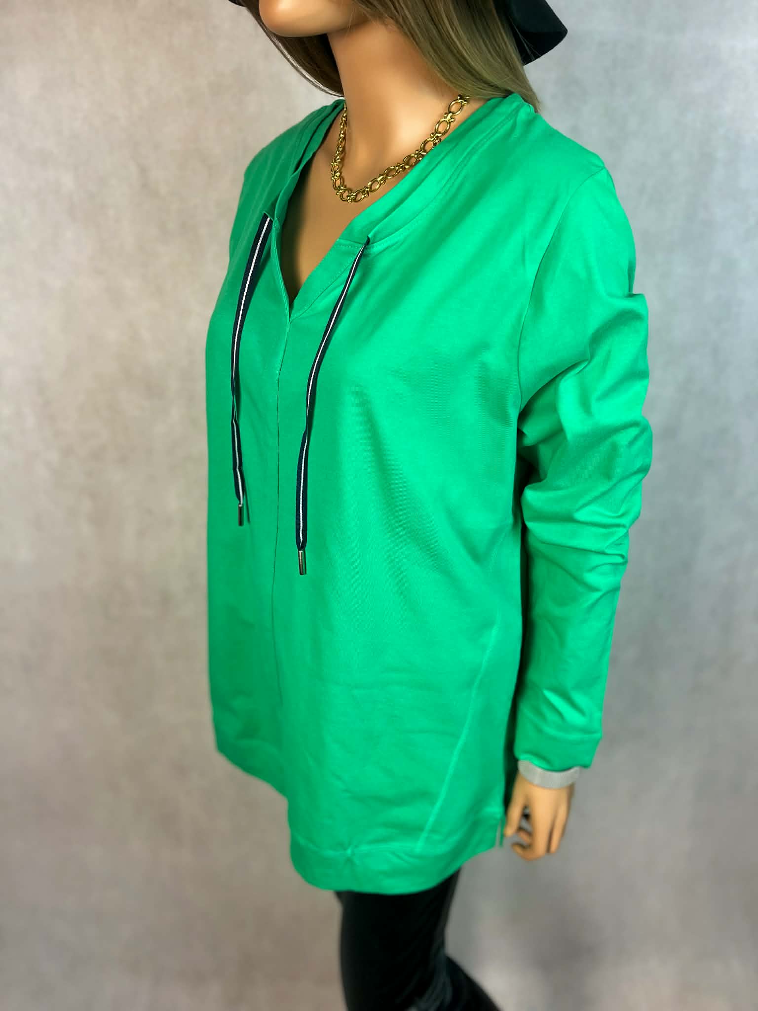 Bluzka w intensywnej, świeżej zieleni, która pięknie ożywia stylizację i dodaje jej energii. Model z subtelnym dekoltem V wykończonym dekoracyjnym wiązaniem, które nadaje całości nowoczesnego, lekko sportowego charakteru.