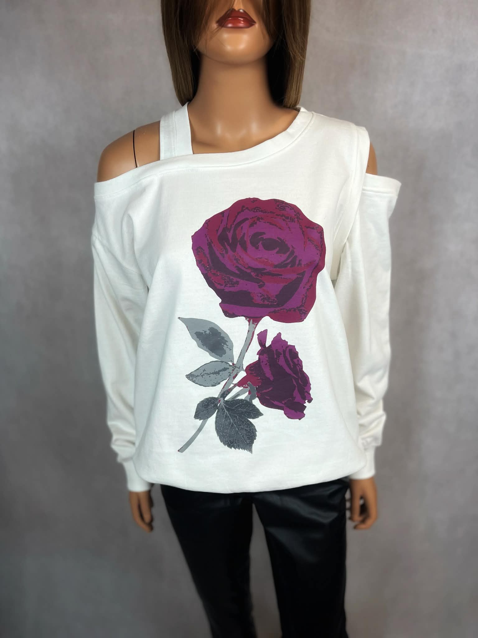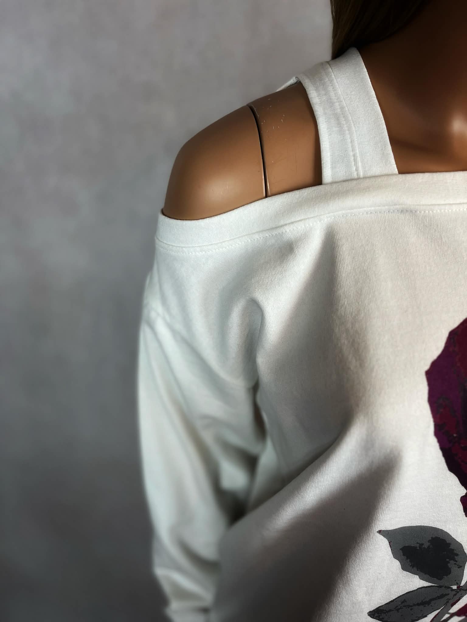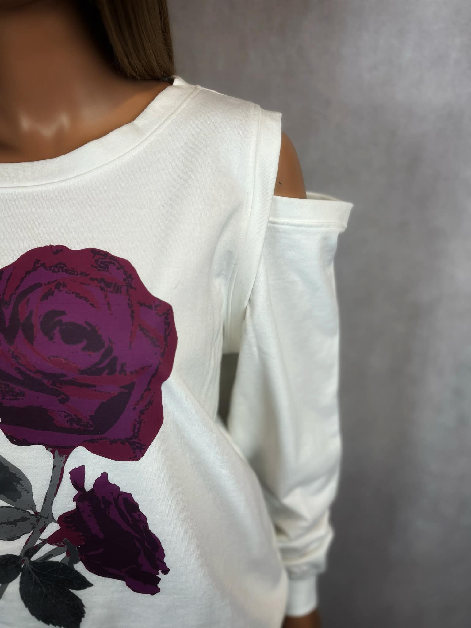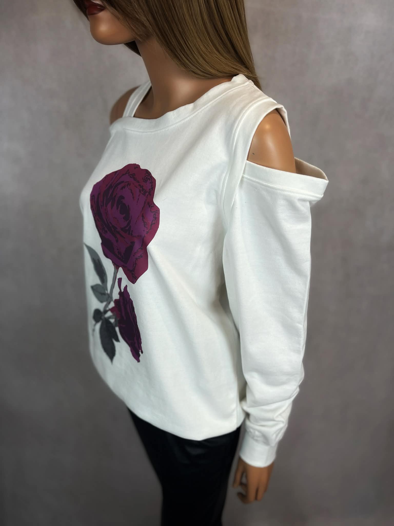 Stylowa bluza w odcieniu ecru z wyrazistym printem róży w tonacji bordo i śliwki. Model z efektownymi wycięciami na ramionach, które nadają całości nowoczesnego, lekko zmysłowego charakteru.