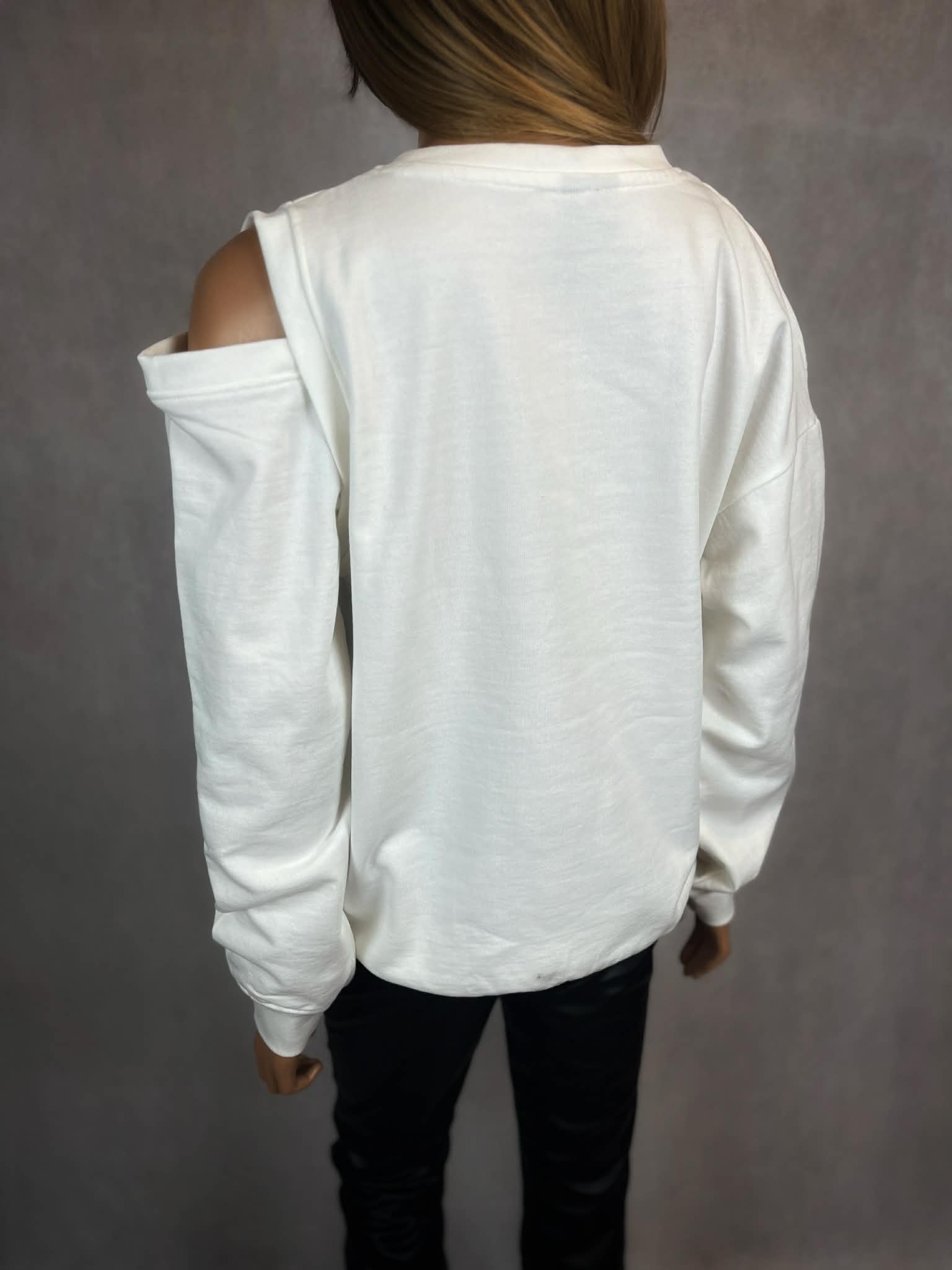 Luźniejszy fason zapewnia komfort noszenia, a miękka dzianina przyjemnie układa się na sylwetce. Długi rękaw oraz klasyczny, zabudowany dekolt równoważą odkryte ramiona, tworząc spójną i modną formę.
