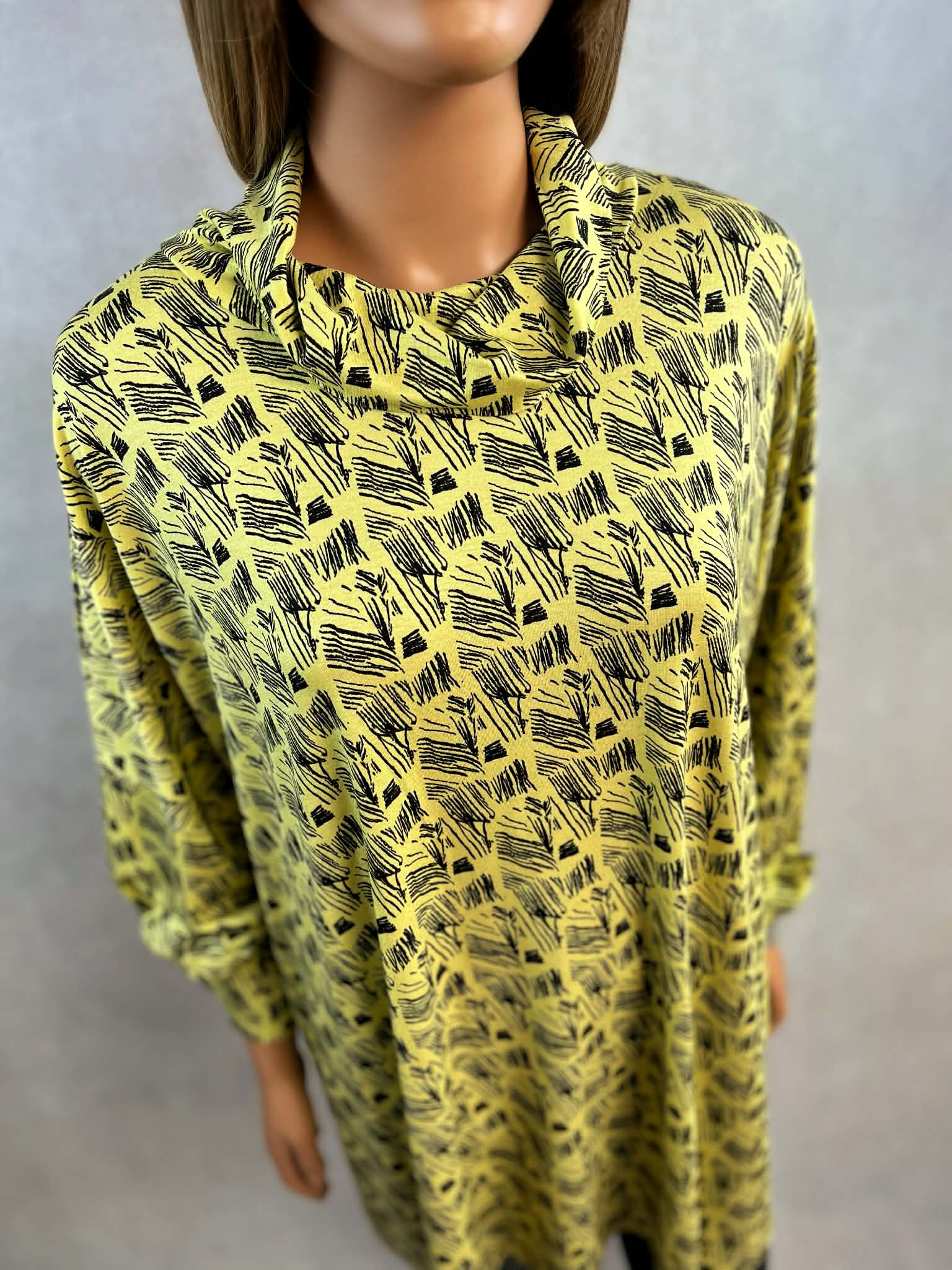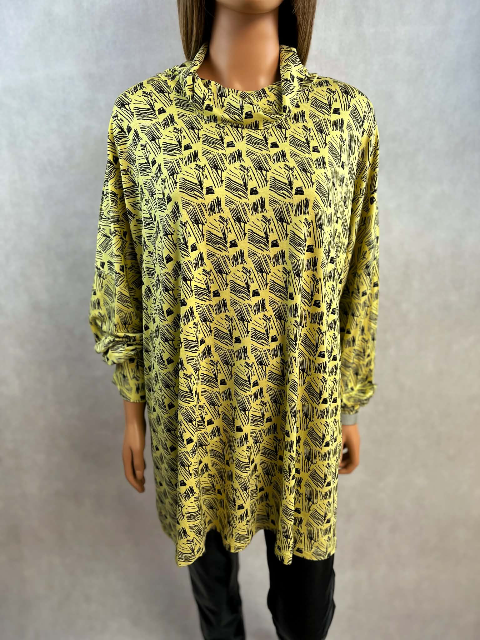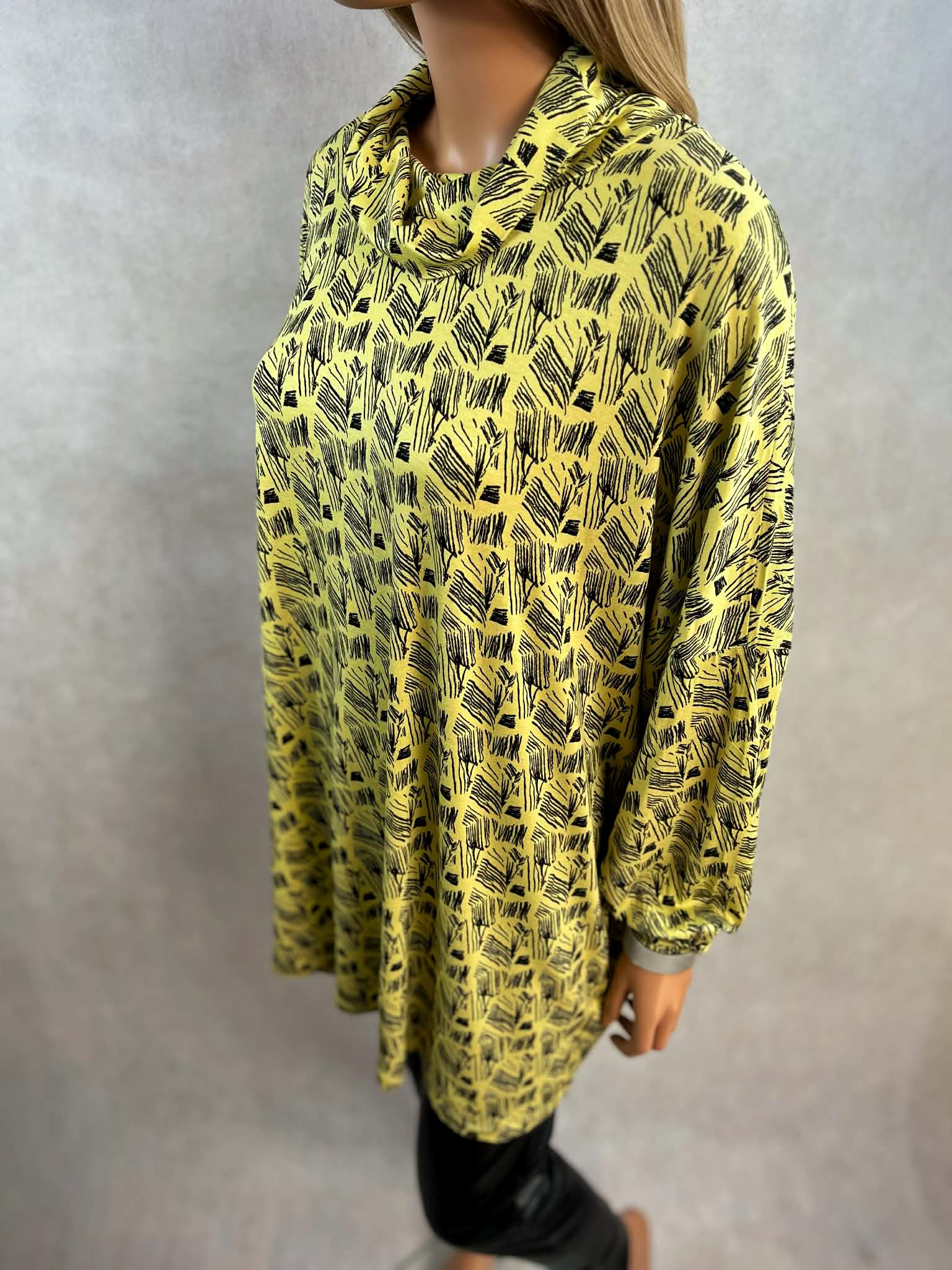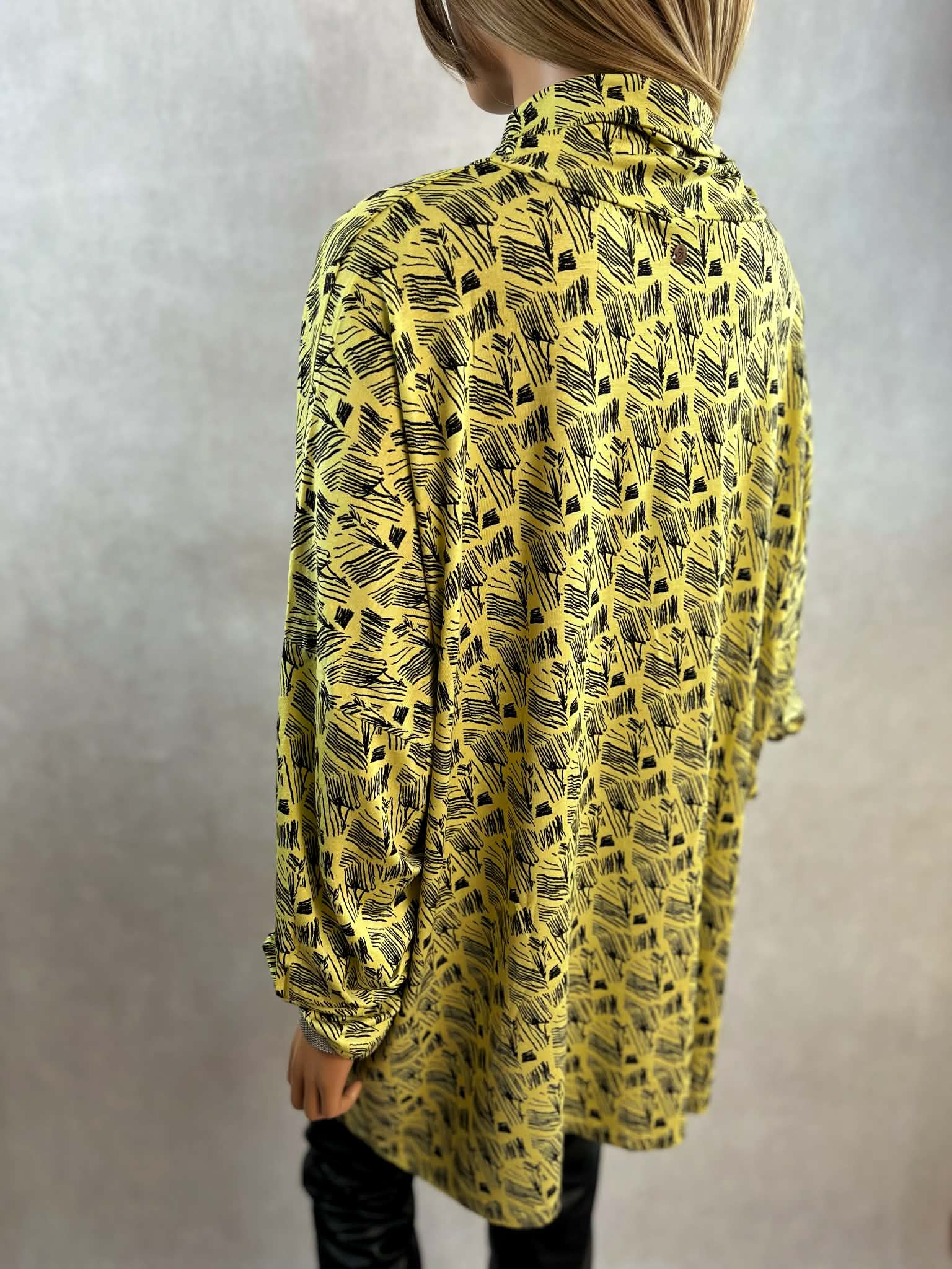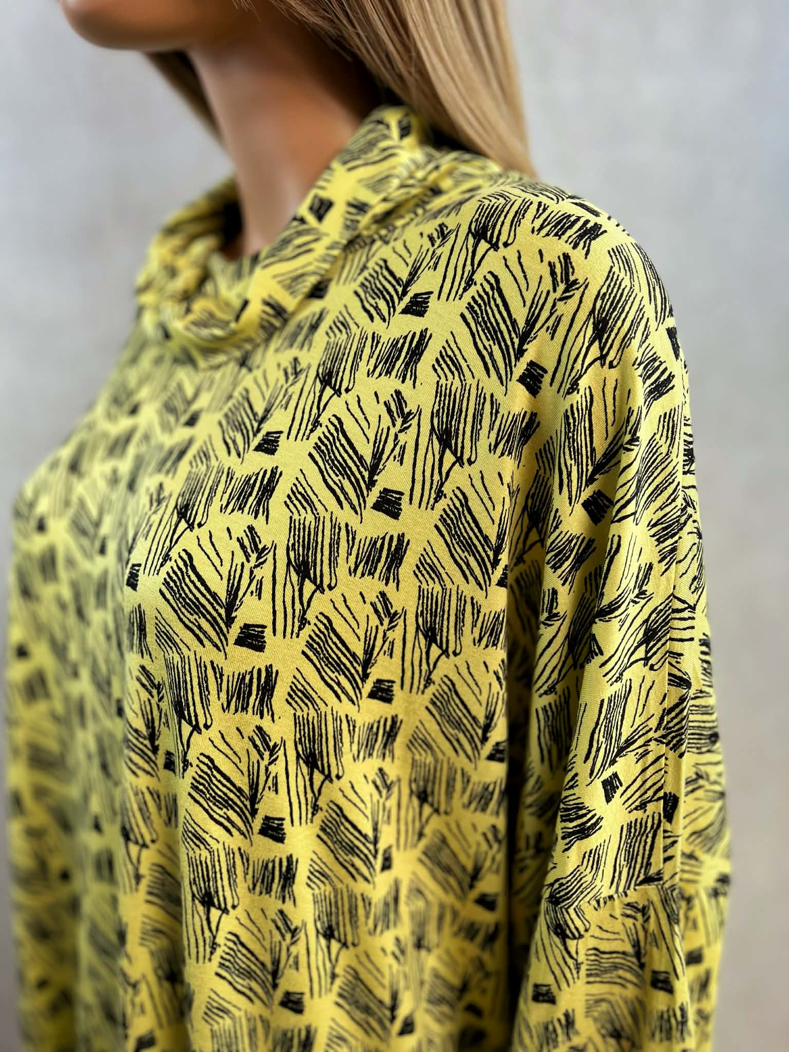 Model w intensywnym żółtym kolorze z czarnym, graficznym printem. Luźny golf miękko układa się przy szyi i nadaje całości nowoczesnego charakteru. Rękawy długie, wykończone mankietem.