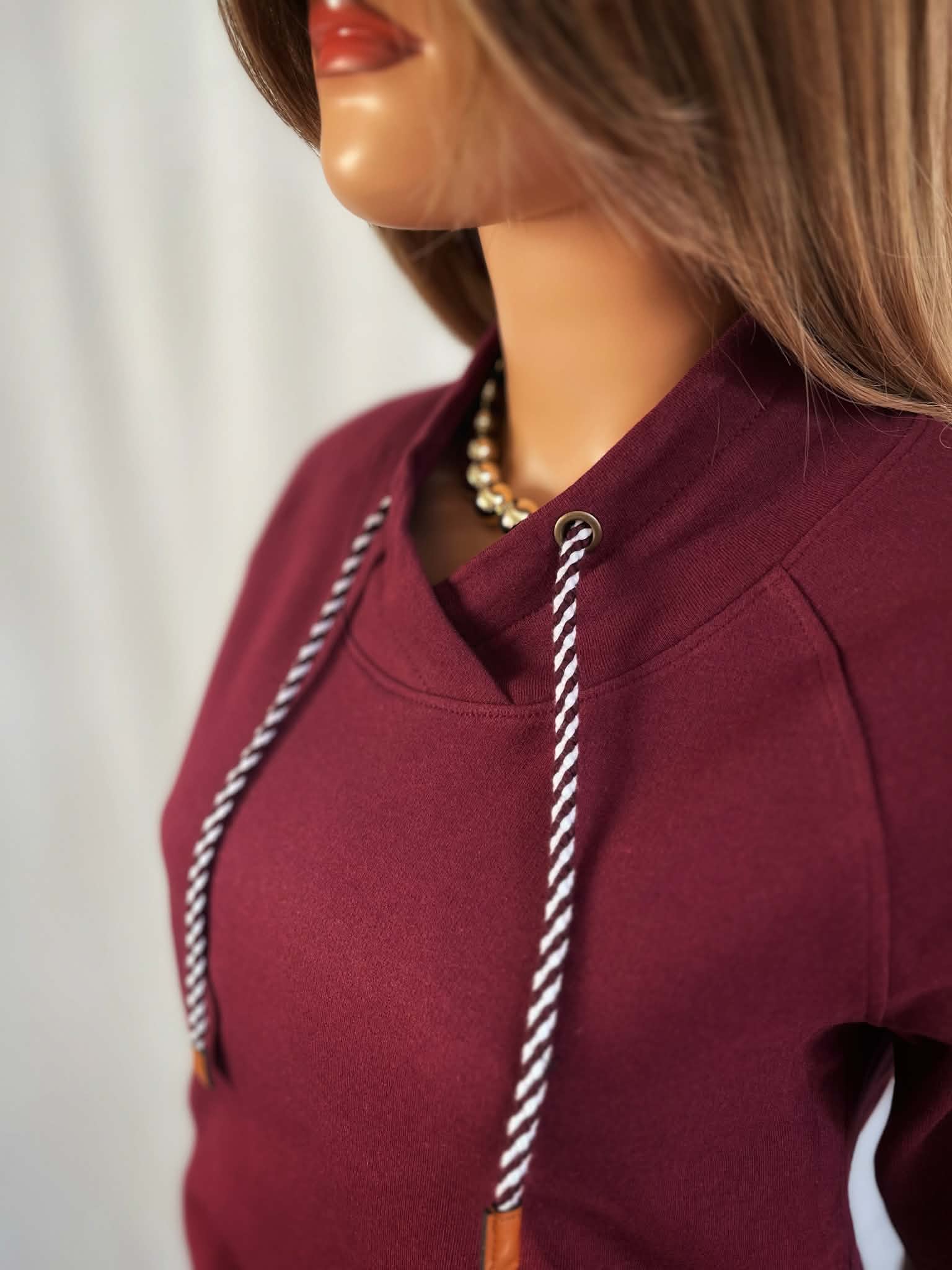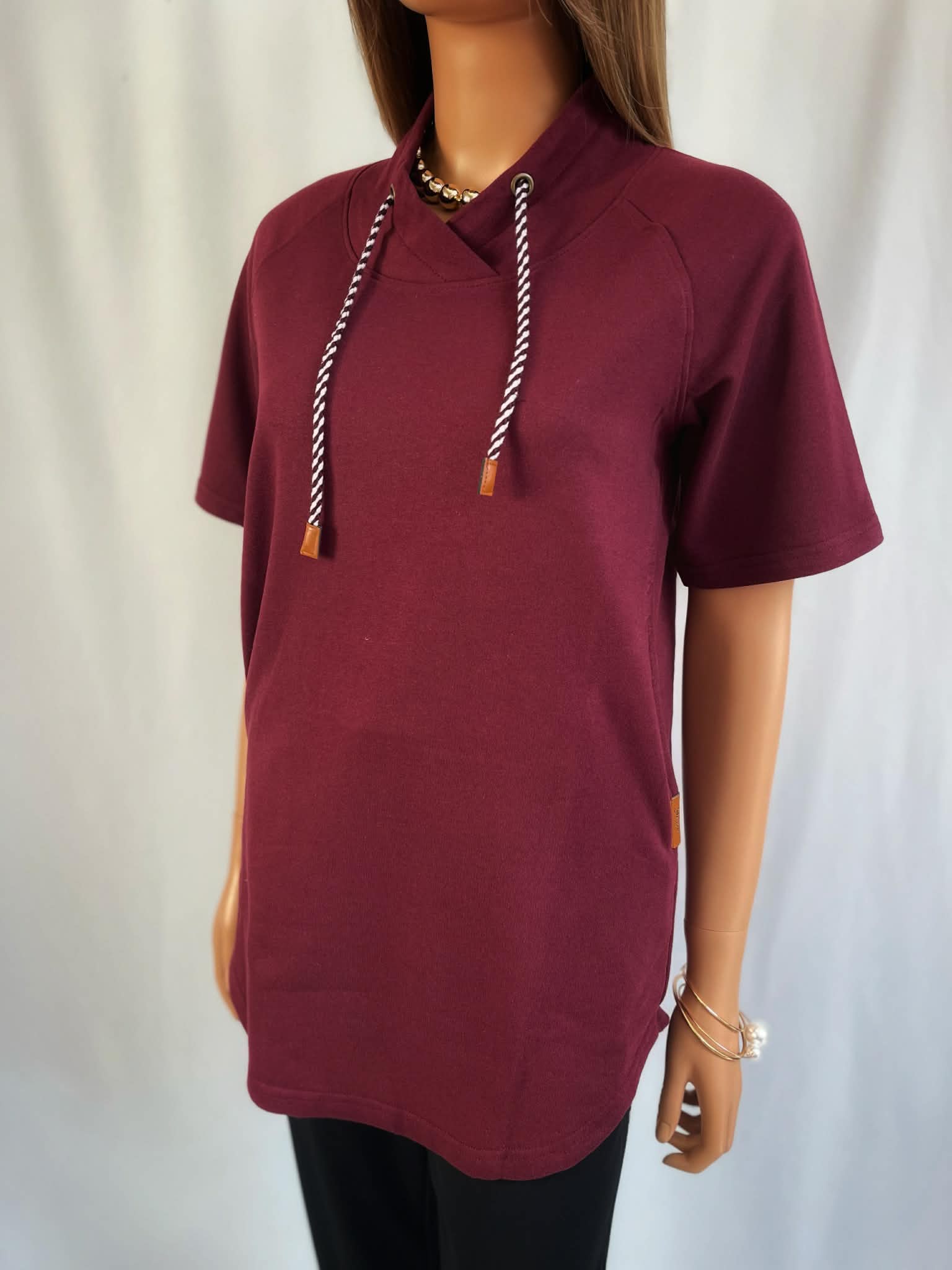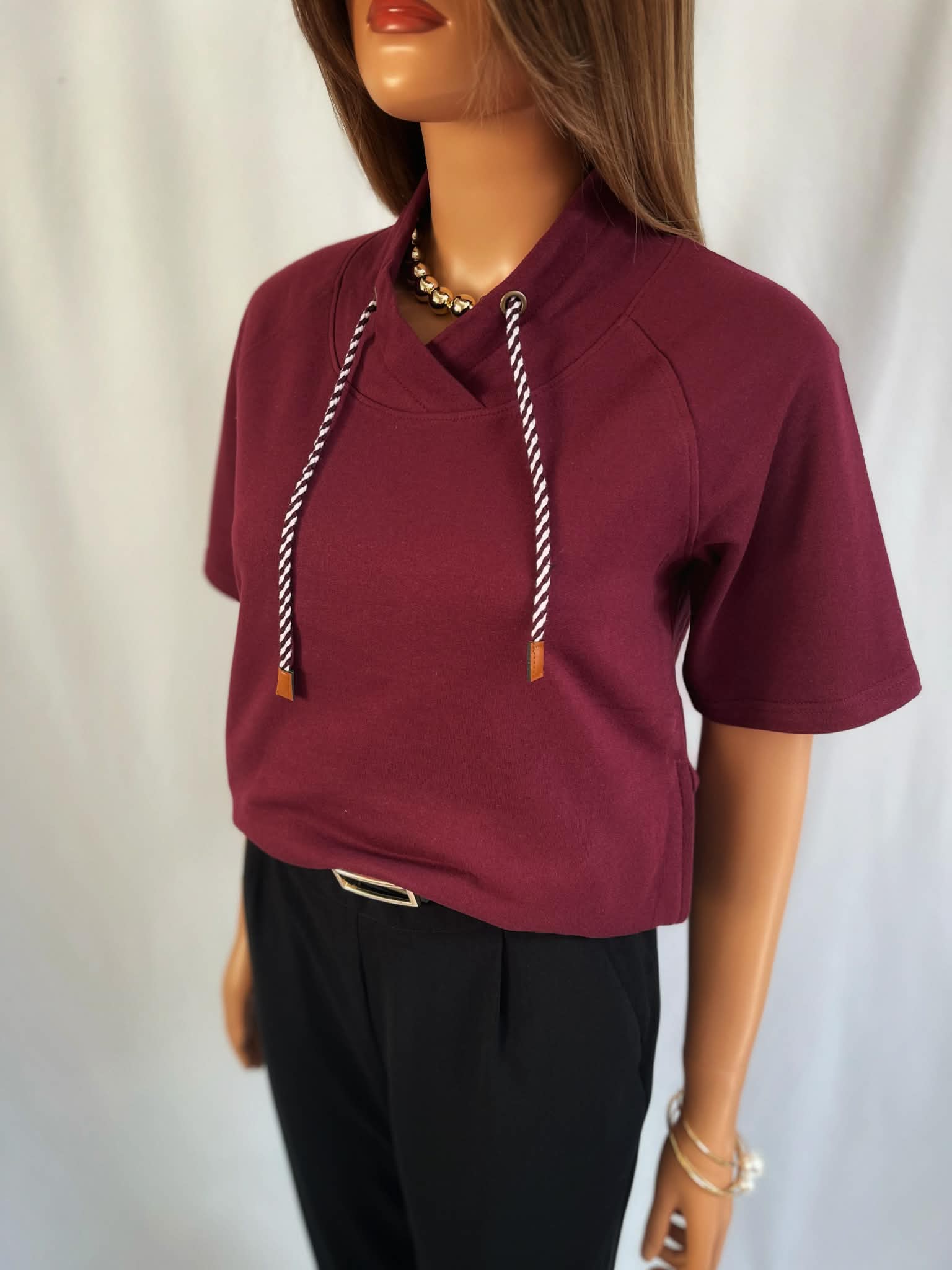 Bordowa bluza o luźnym, wygodnym kroju, wykonana z miękkiej dzianiny. Model z krótkim rękawem i ozdobnym wiązaniem przy dekolcie, które nadaje jej sportowo-miejskiego charakteru. Sznurki zakończone subtelnymi detalami dodają całości nowoczesnego wyglądu.