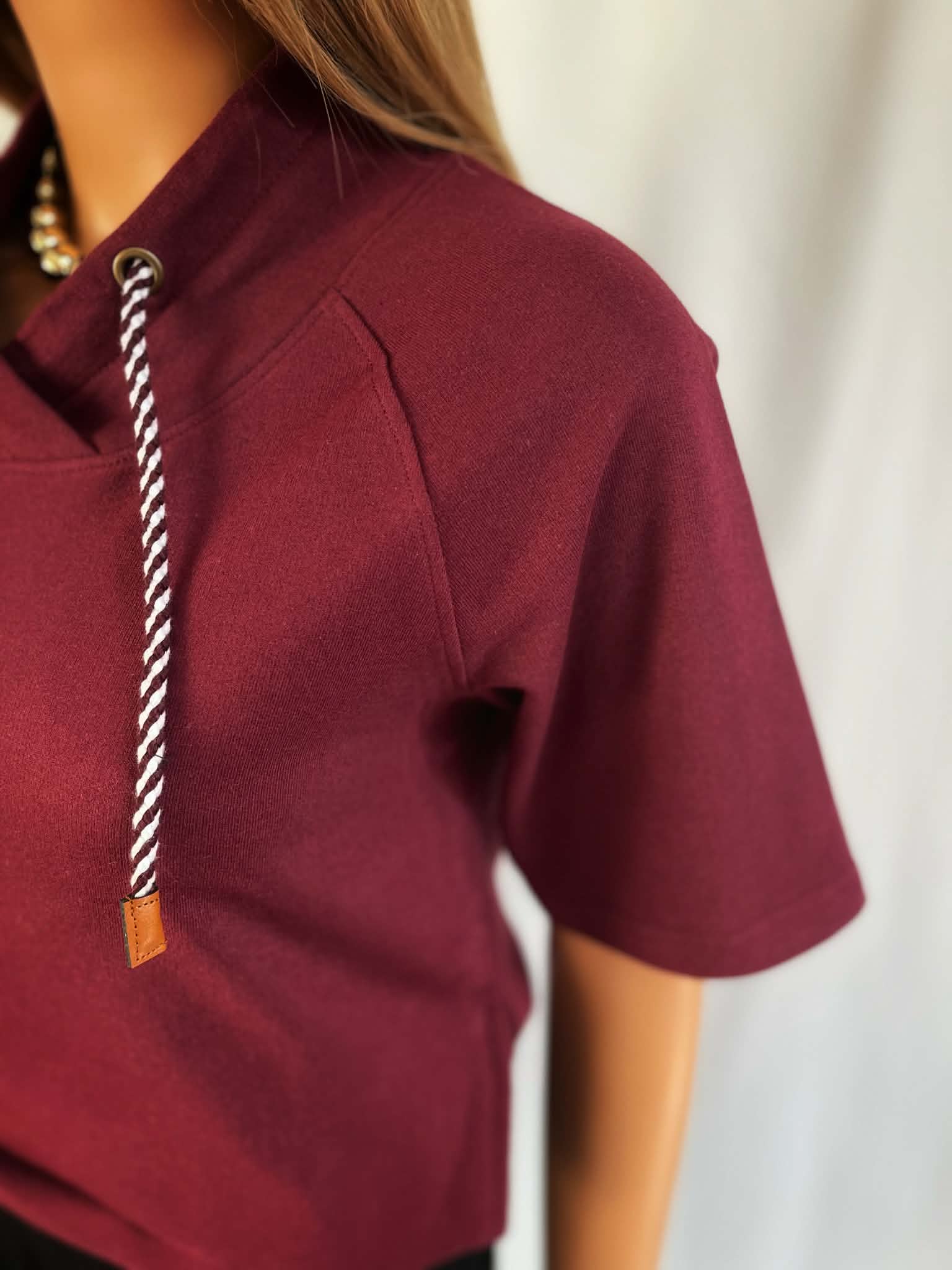 Bordowa bluza z krótkim rękawem i wiązaniem przy dekolcie