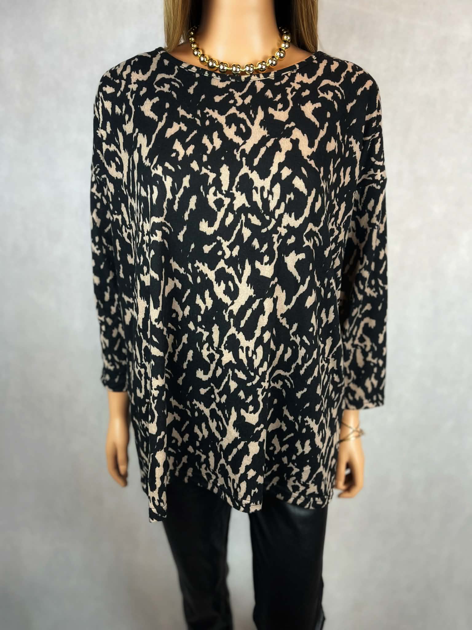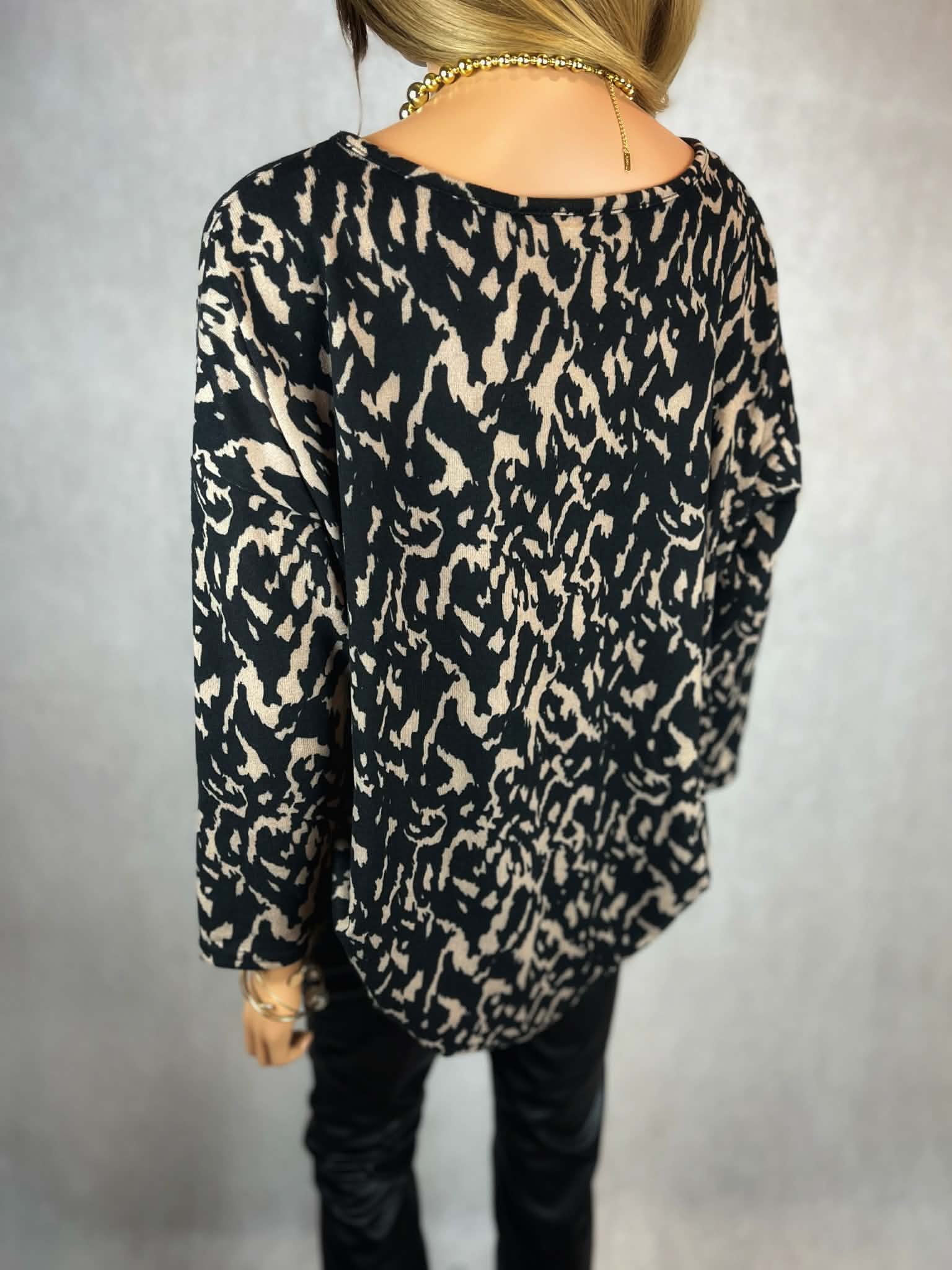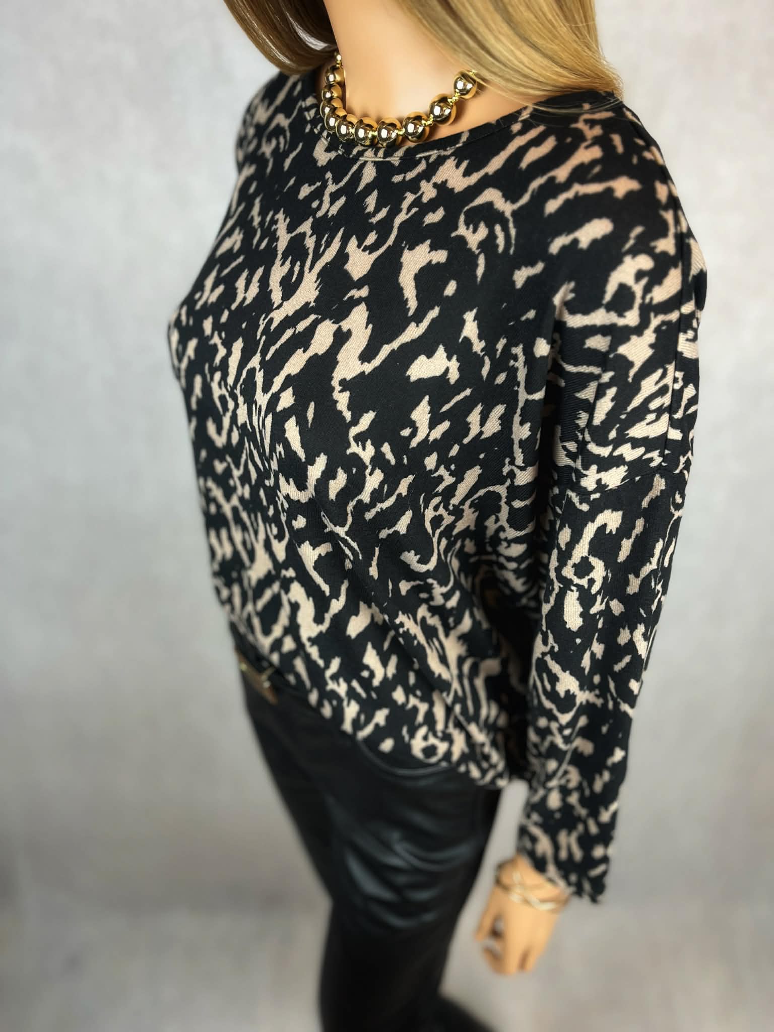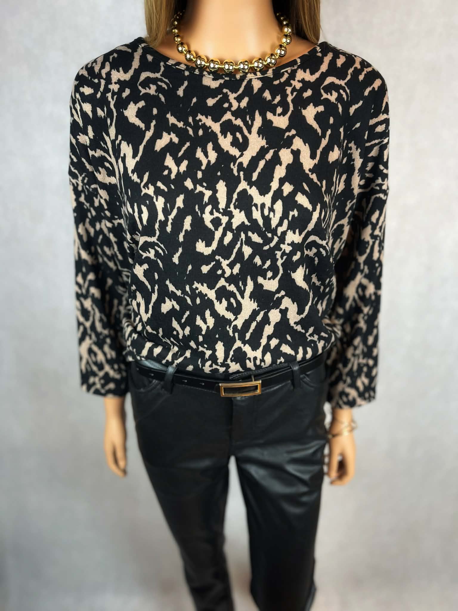 Lekki, cienki sweter w efektowny czarno-beżowy print. Model wykonany z miękkiej, elastycznej dzianiny, która dobrze układa się na sylwetce i zapewnia komfort noszenia.