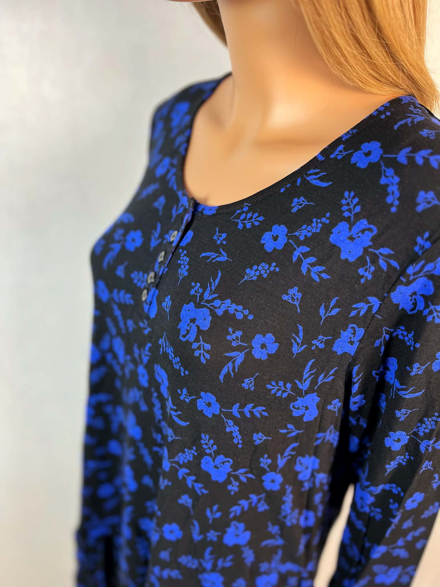 Granatowa baza w połączeniu z kwiatowym wzorem tworzy ponadczasowy, kobiecy efekt, który łatwo dopasować do wielu elementów garderoby.