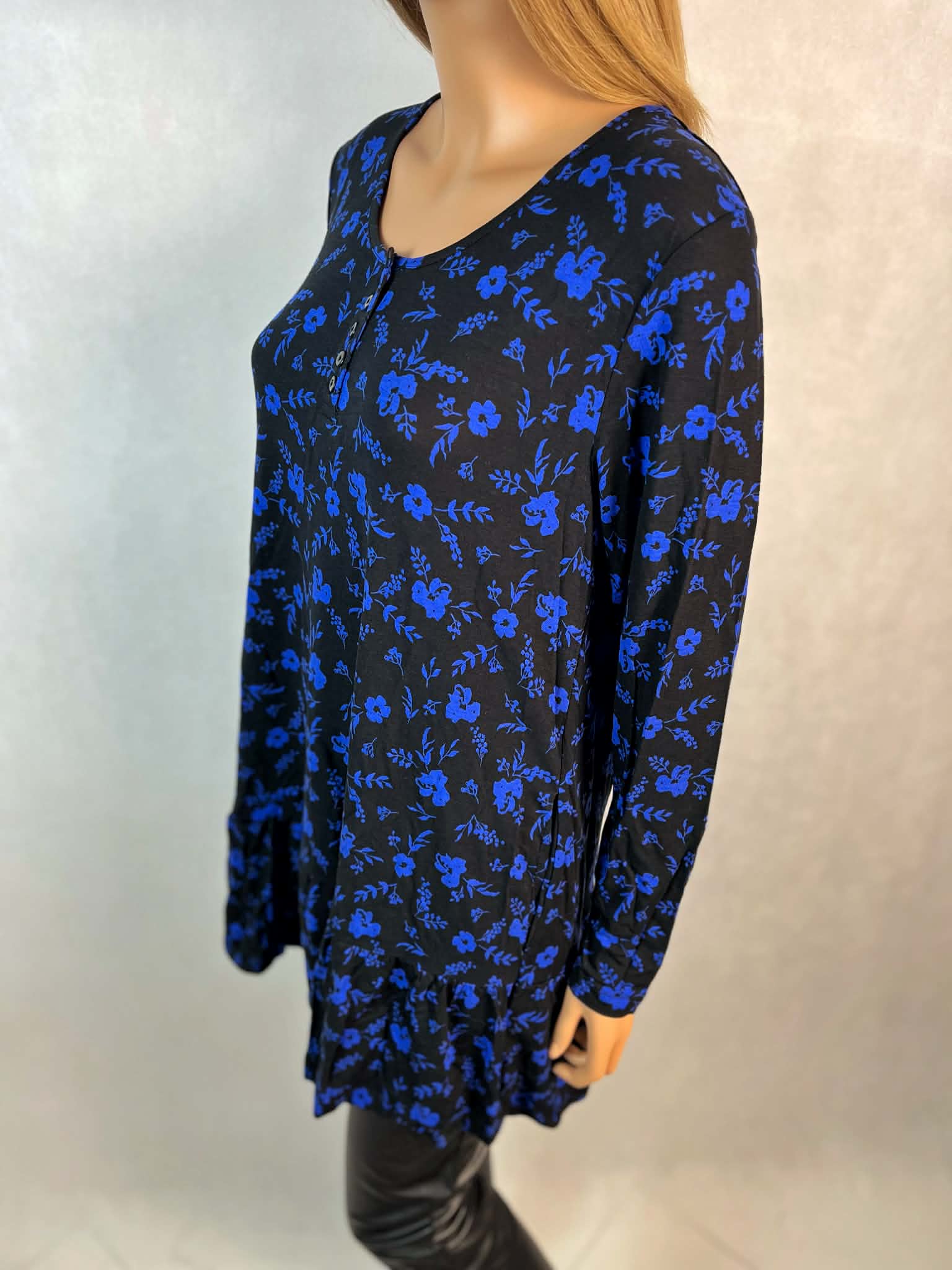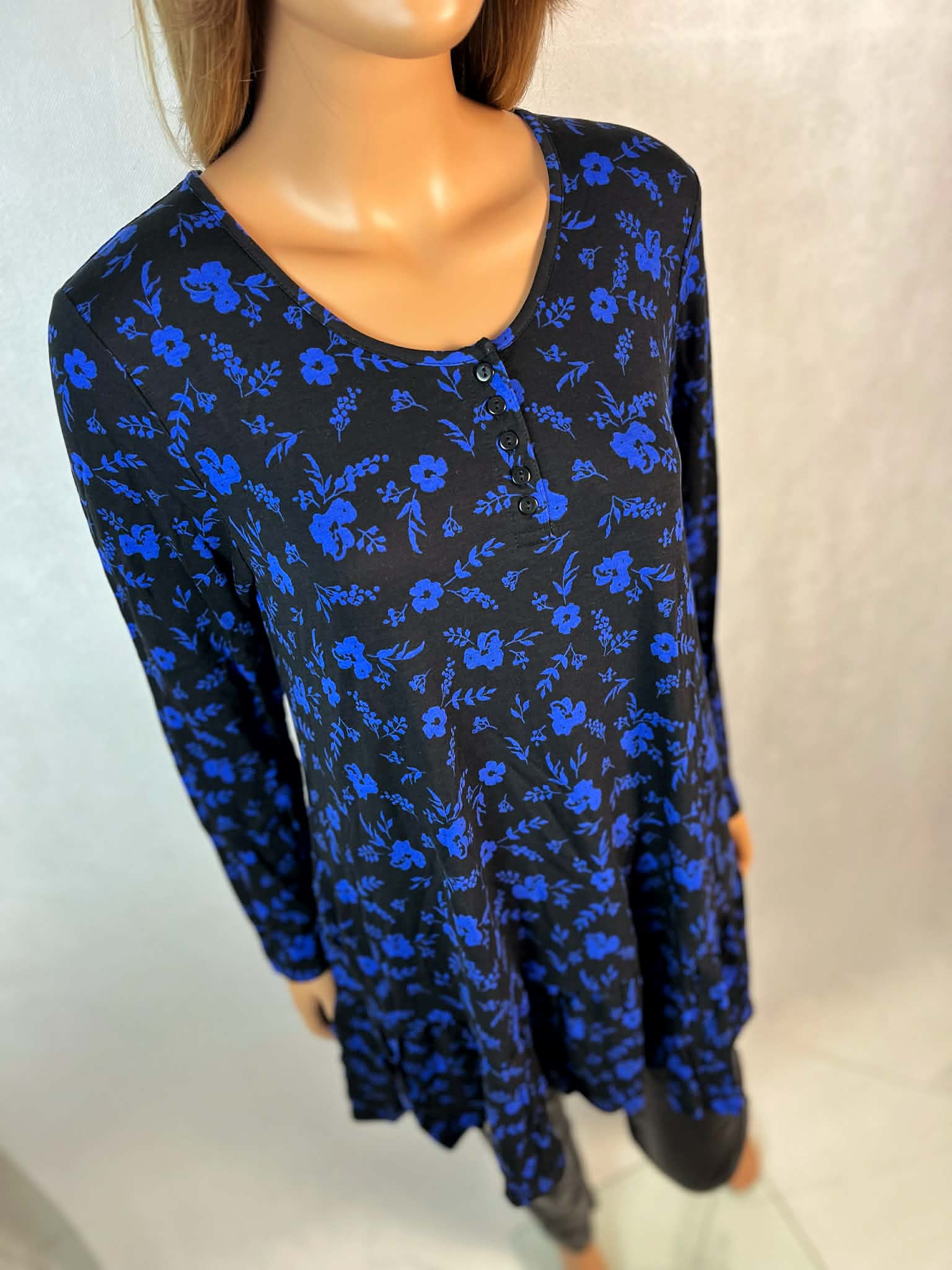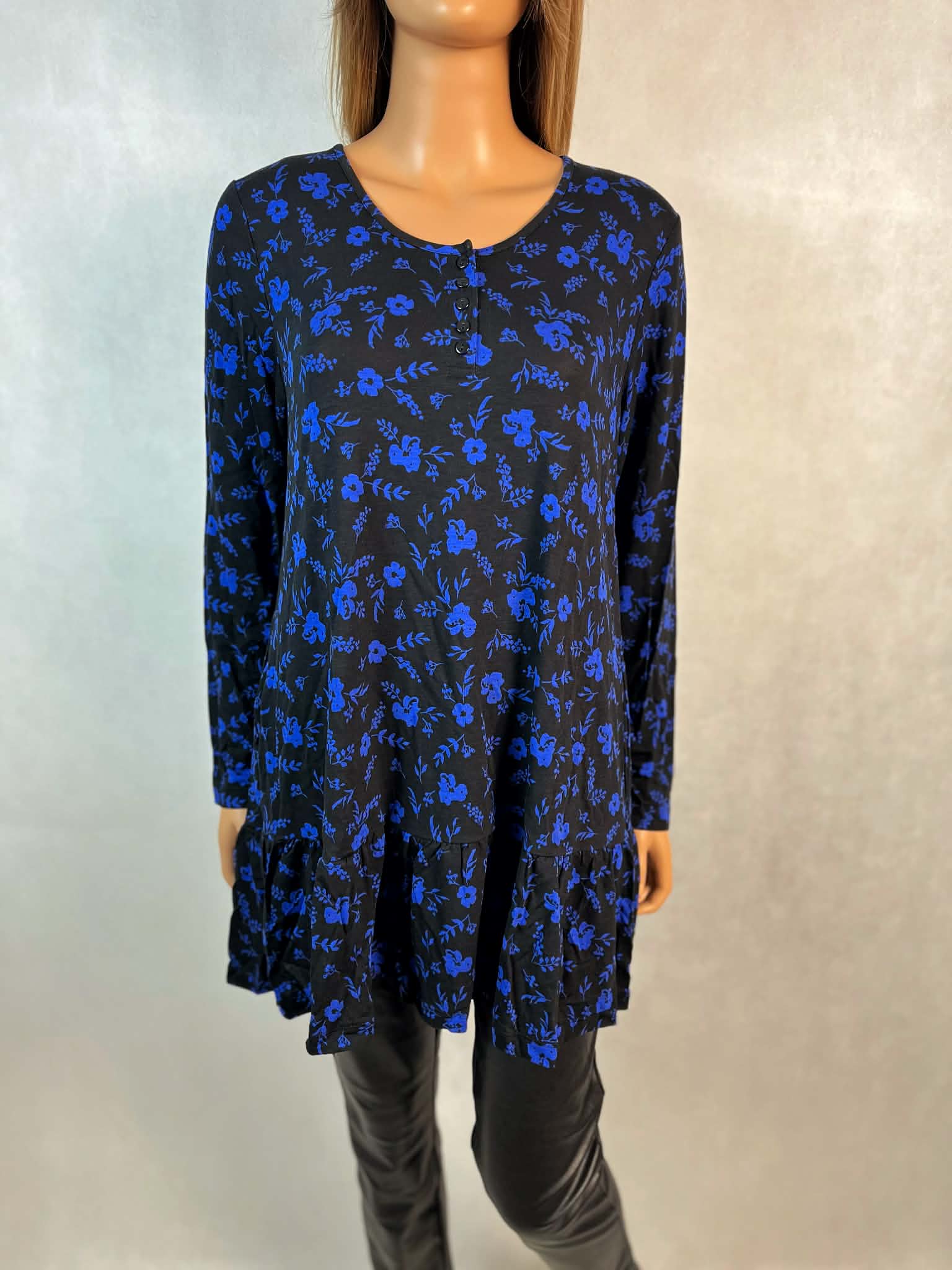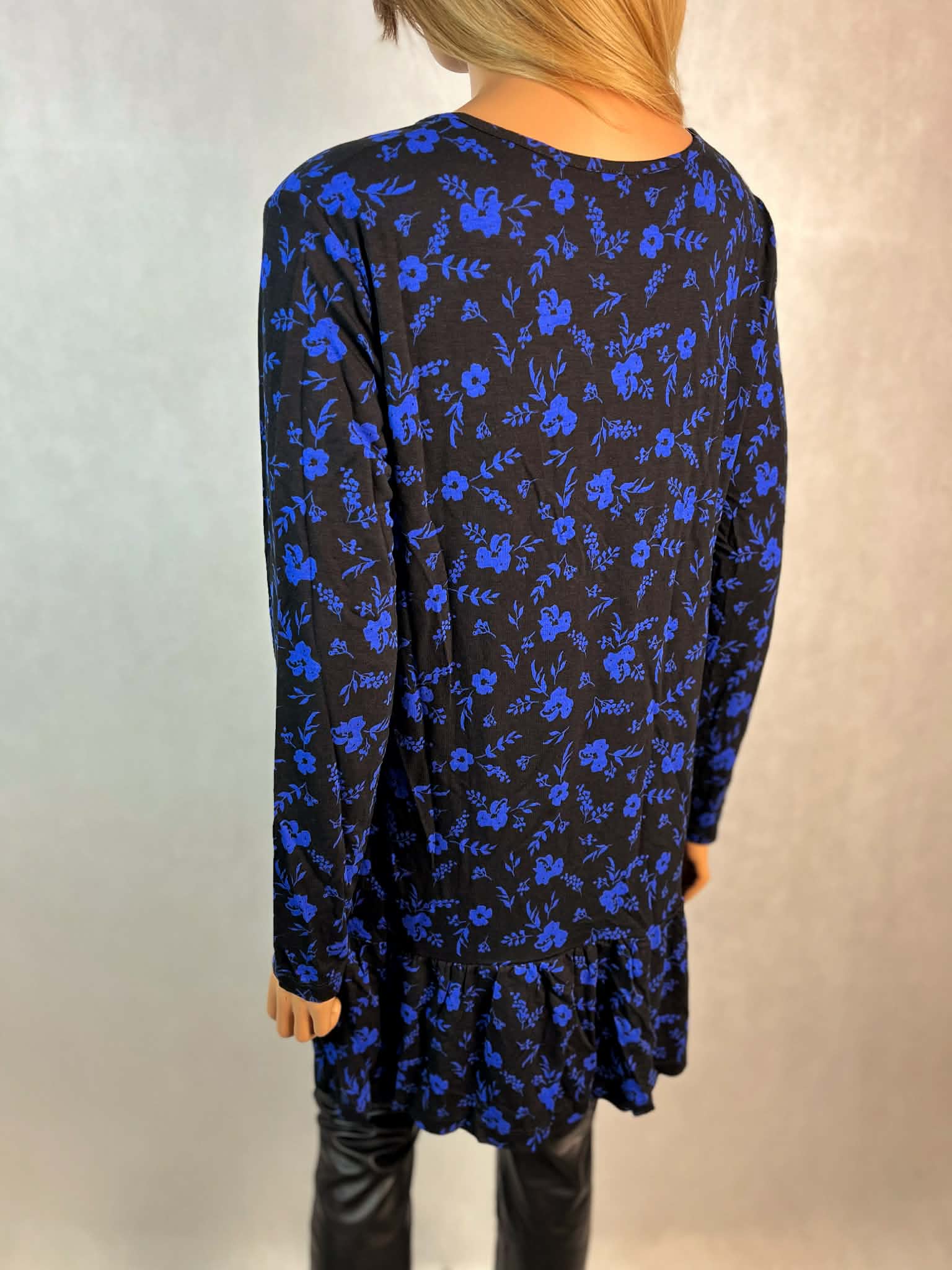 Granatowa tunika w kwiaty to wygodna i kobieca propozycja, która łączy lekkość materiału z eleganckim wyglądem.