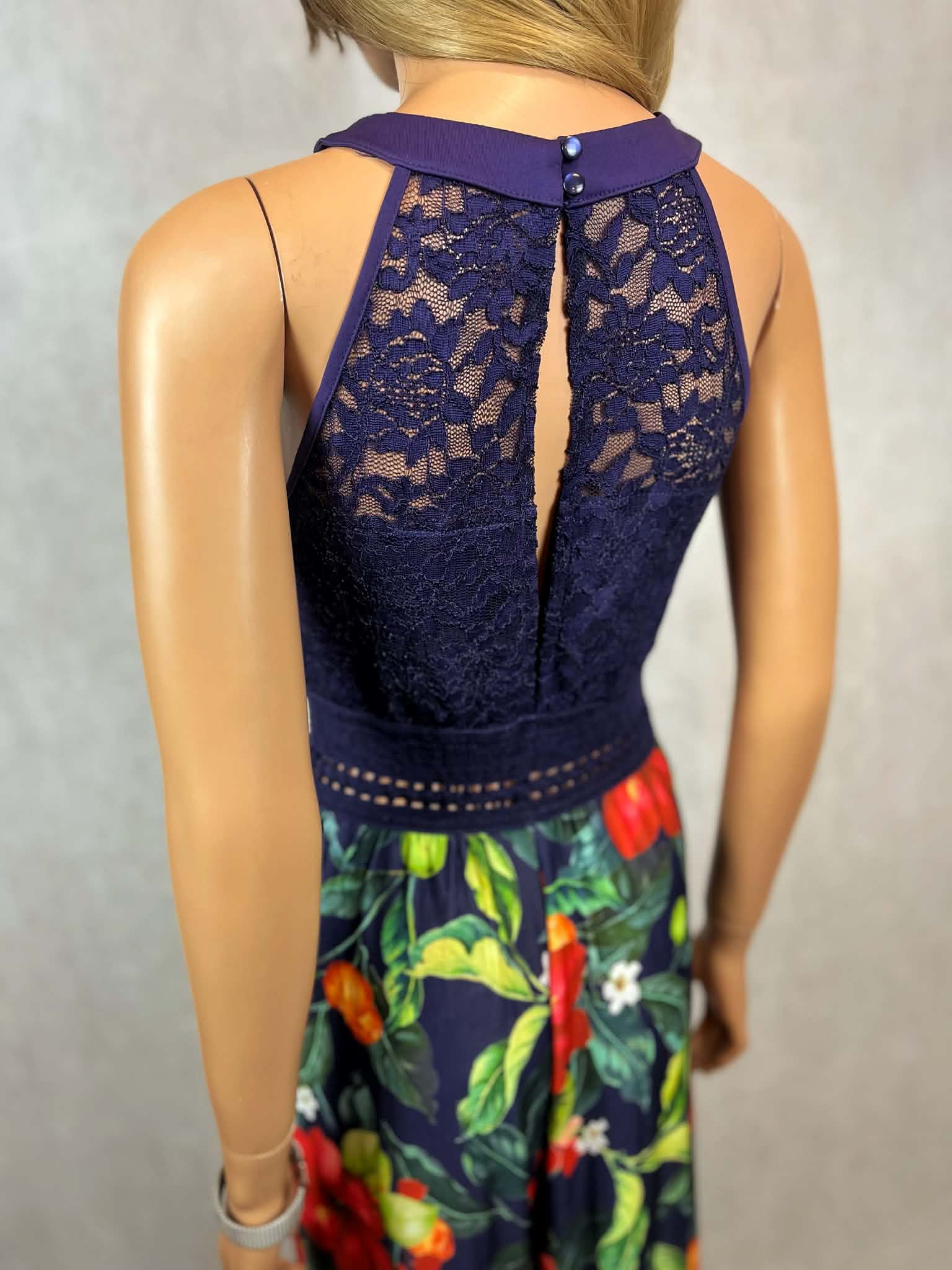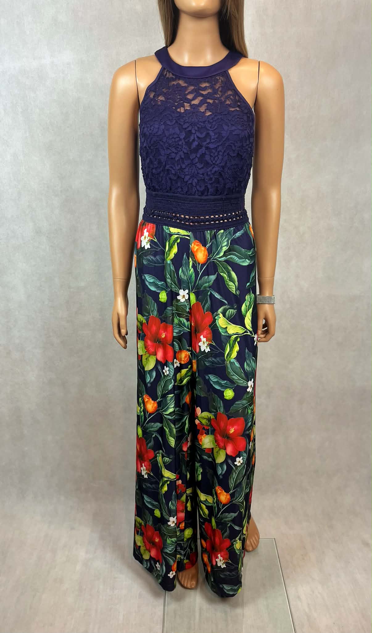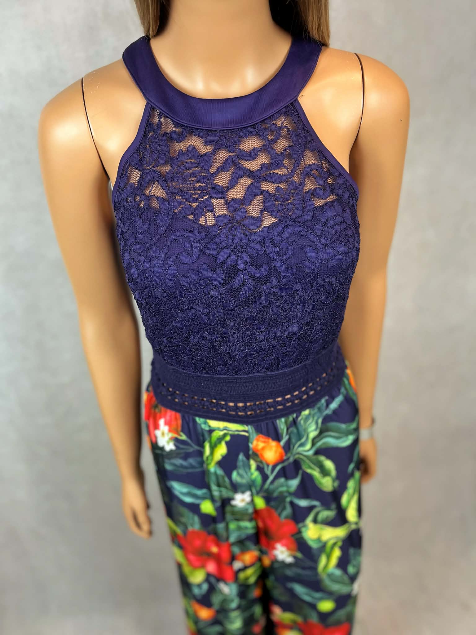 Granatowy kombinezon z koronkową górą i kwiatowym printem