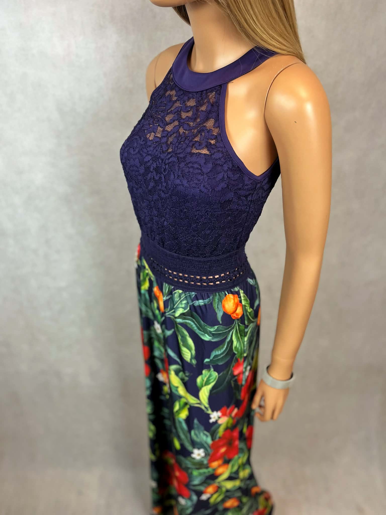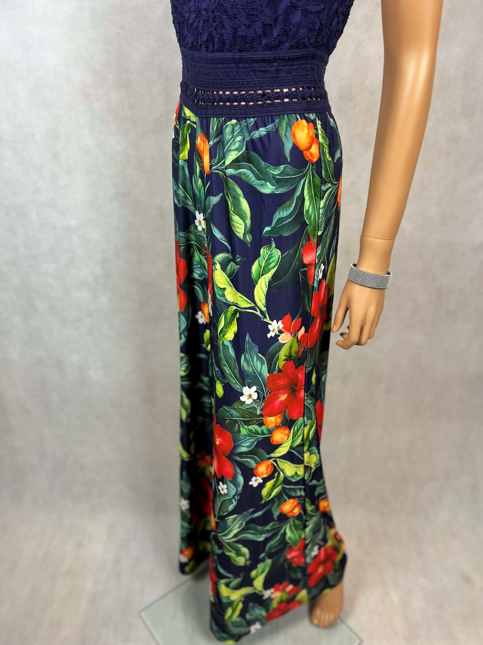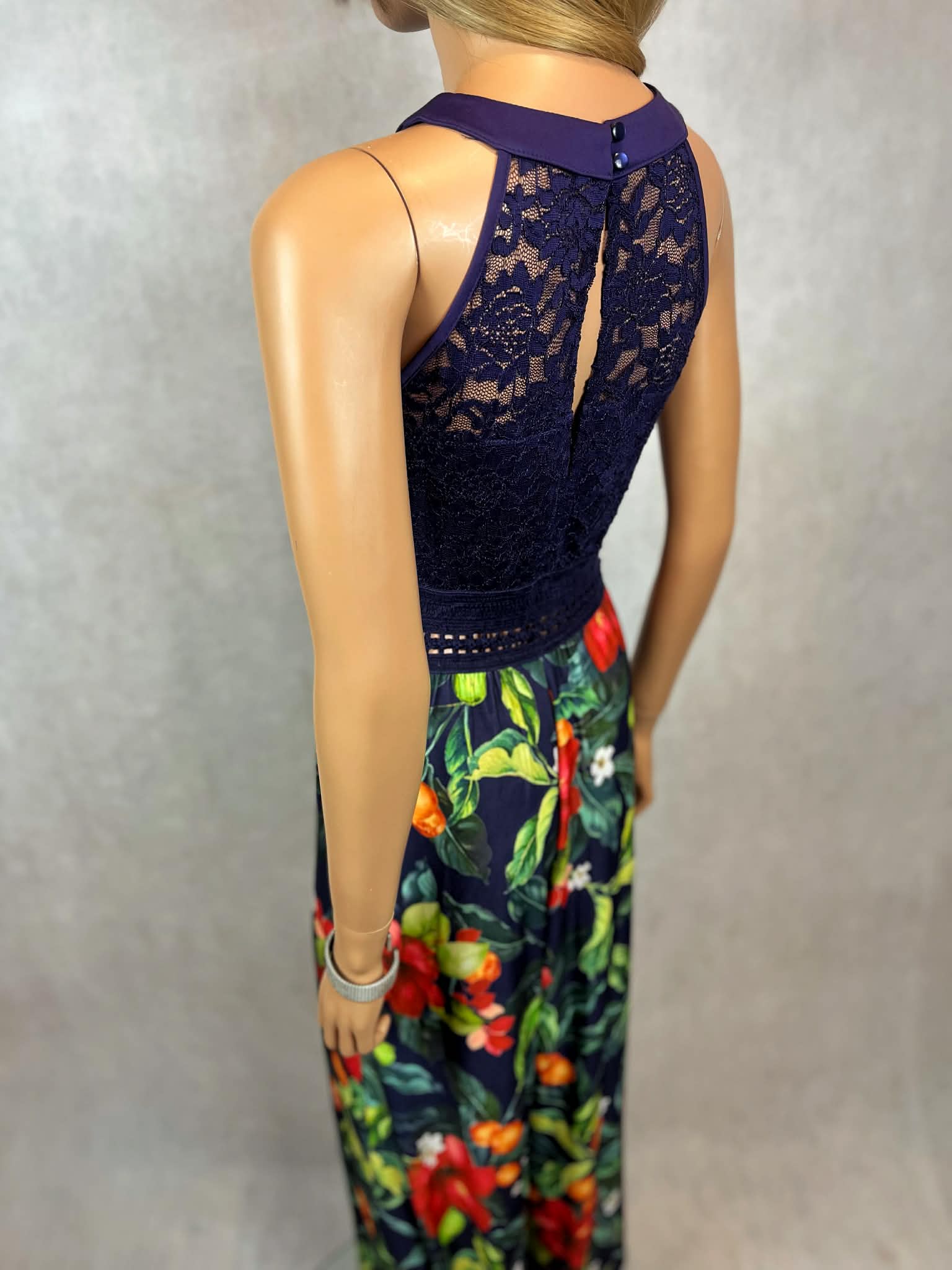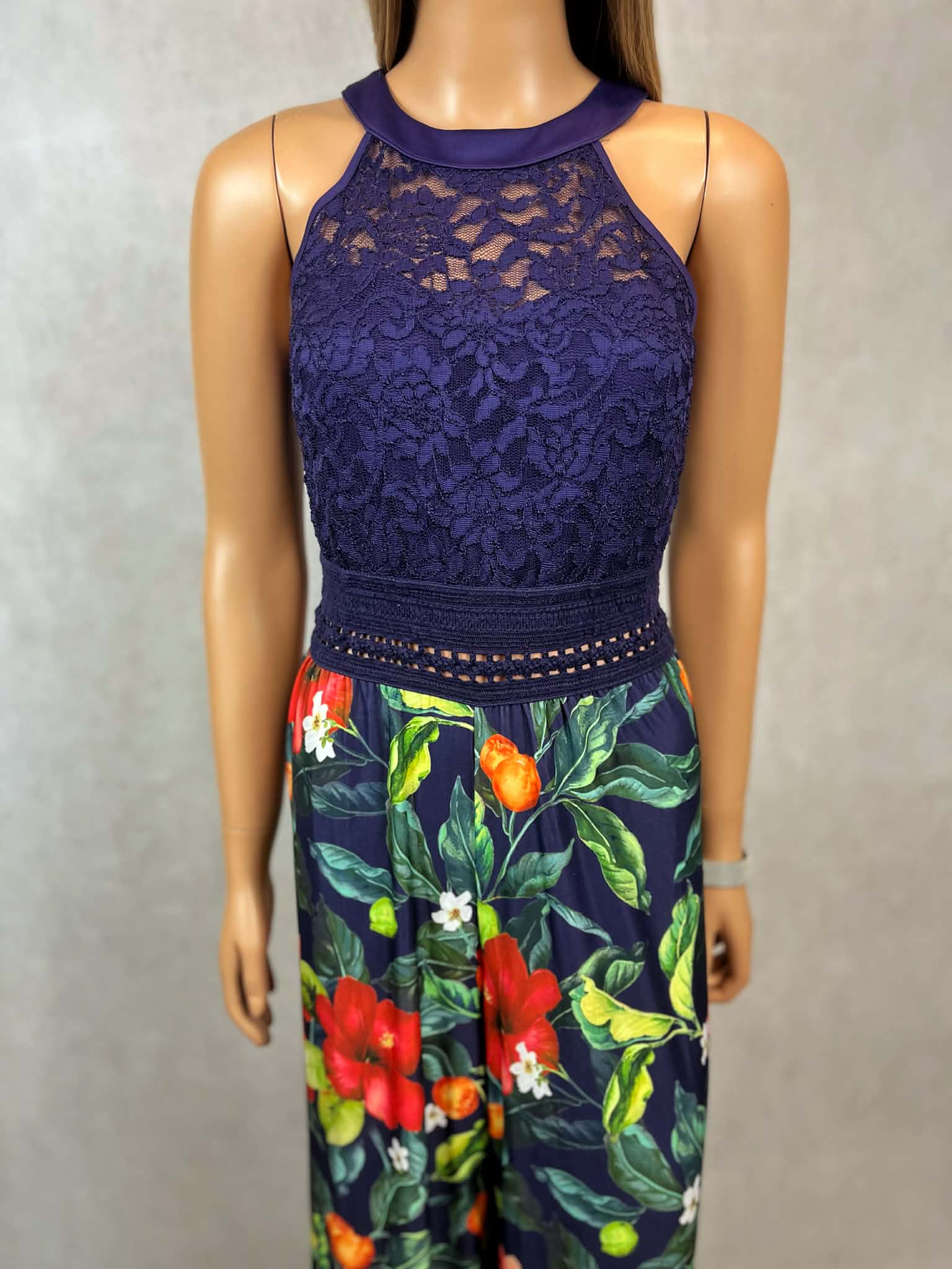 Granatowy kombinezon z koronkową górą i kwiatowym printem