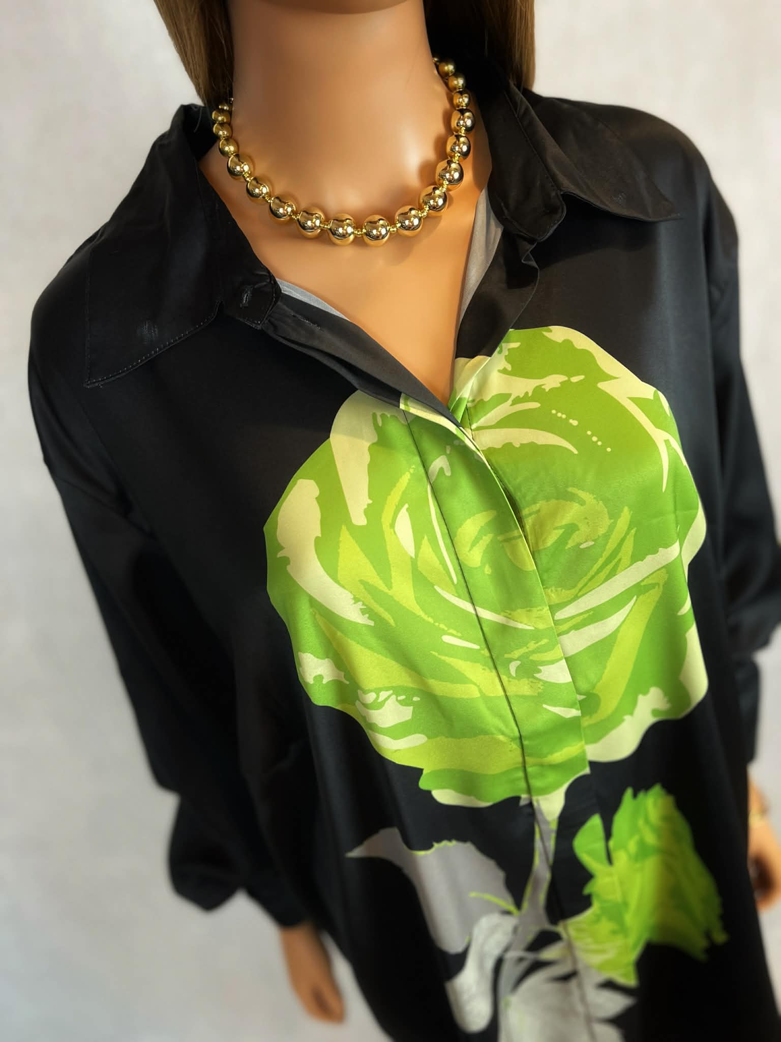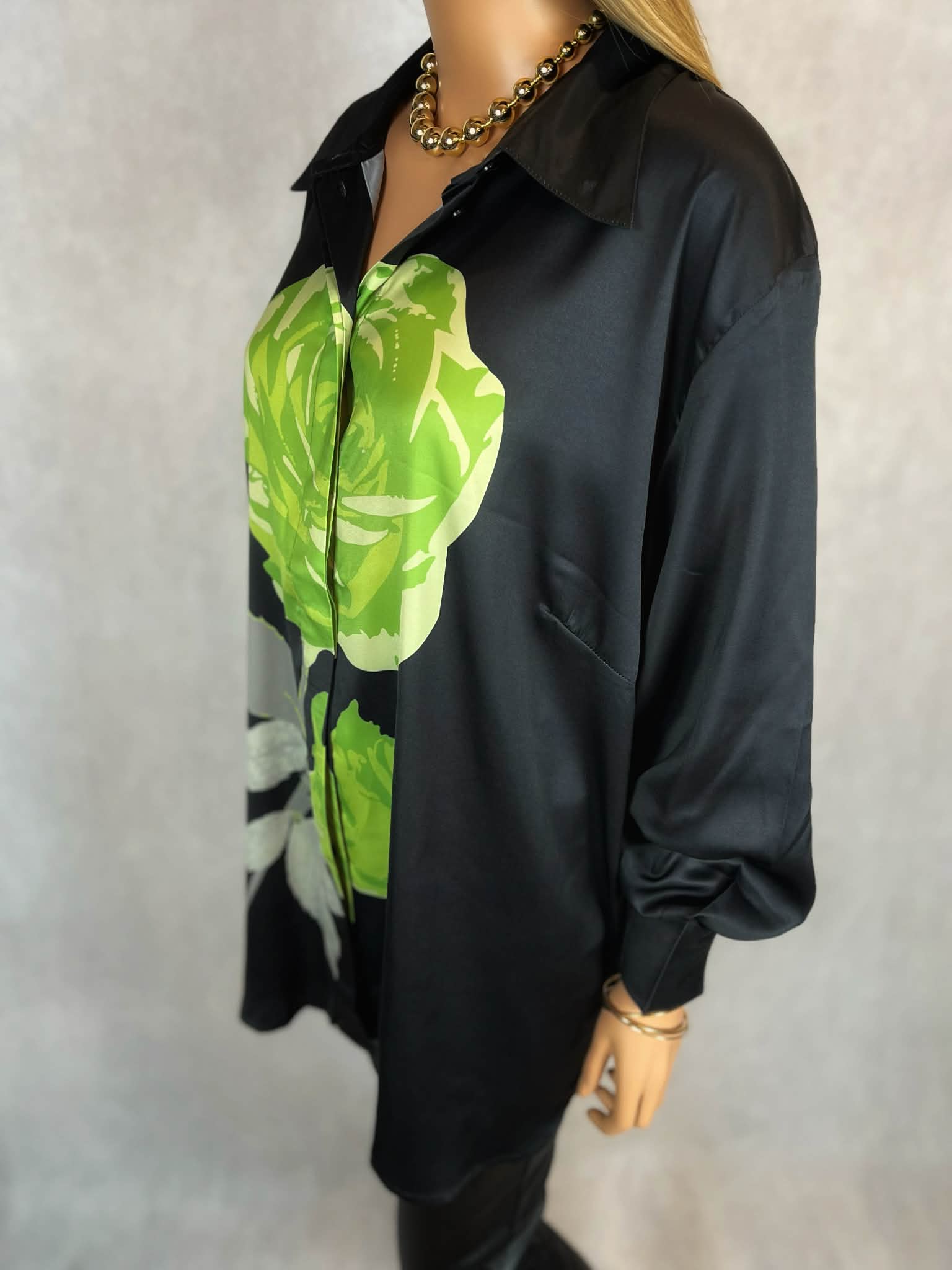 Efektowna koszula w czarnym kolorze z wyrazistym motywem dużej, zielonej róży na przodzie. Model o swobodnym kroju, który miękko układa się na sylwetce i zapewnia komfort noszenia.