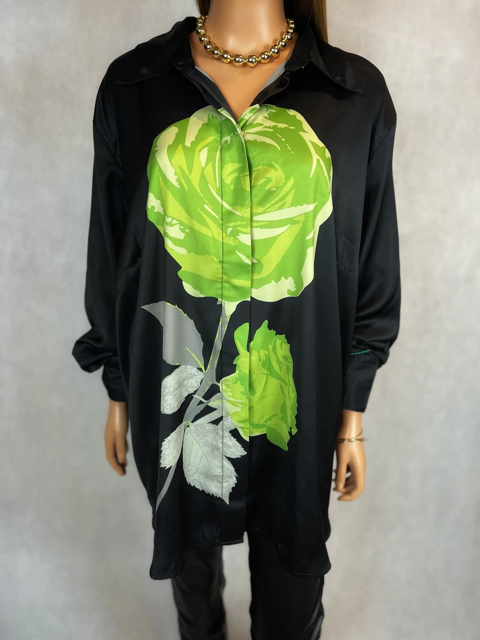 Koszula czarna z zielonym motywem róży – dłuższy fason