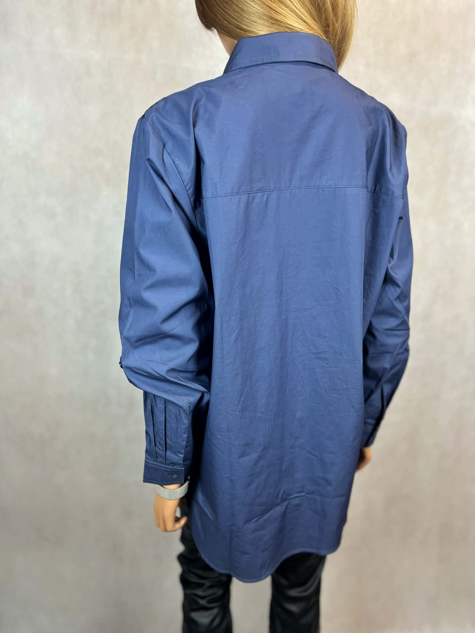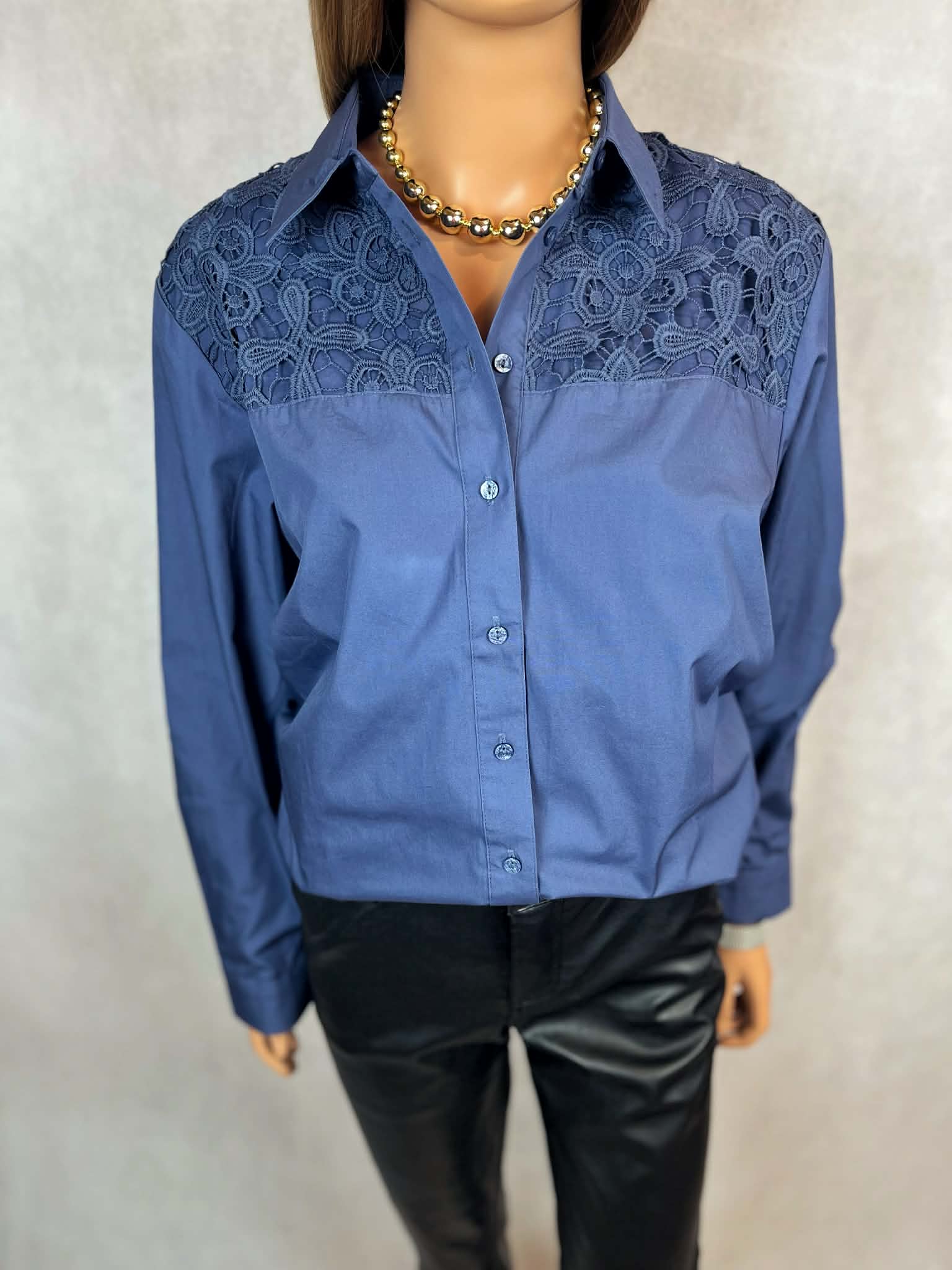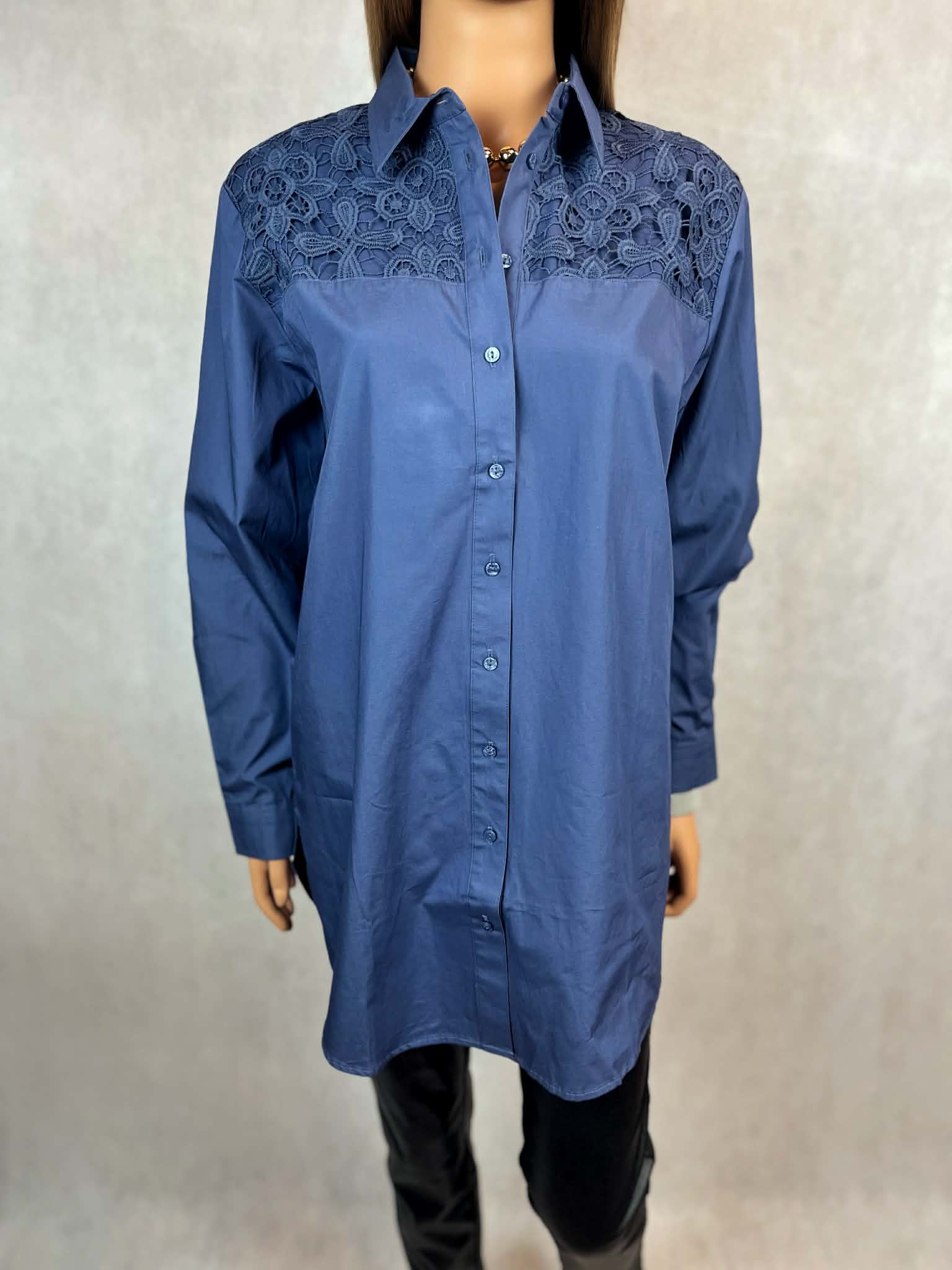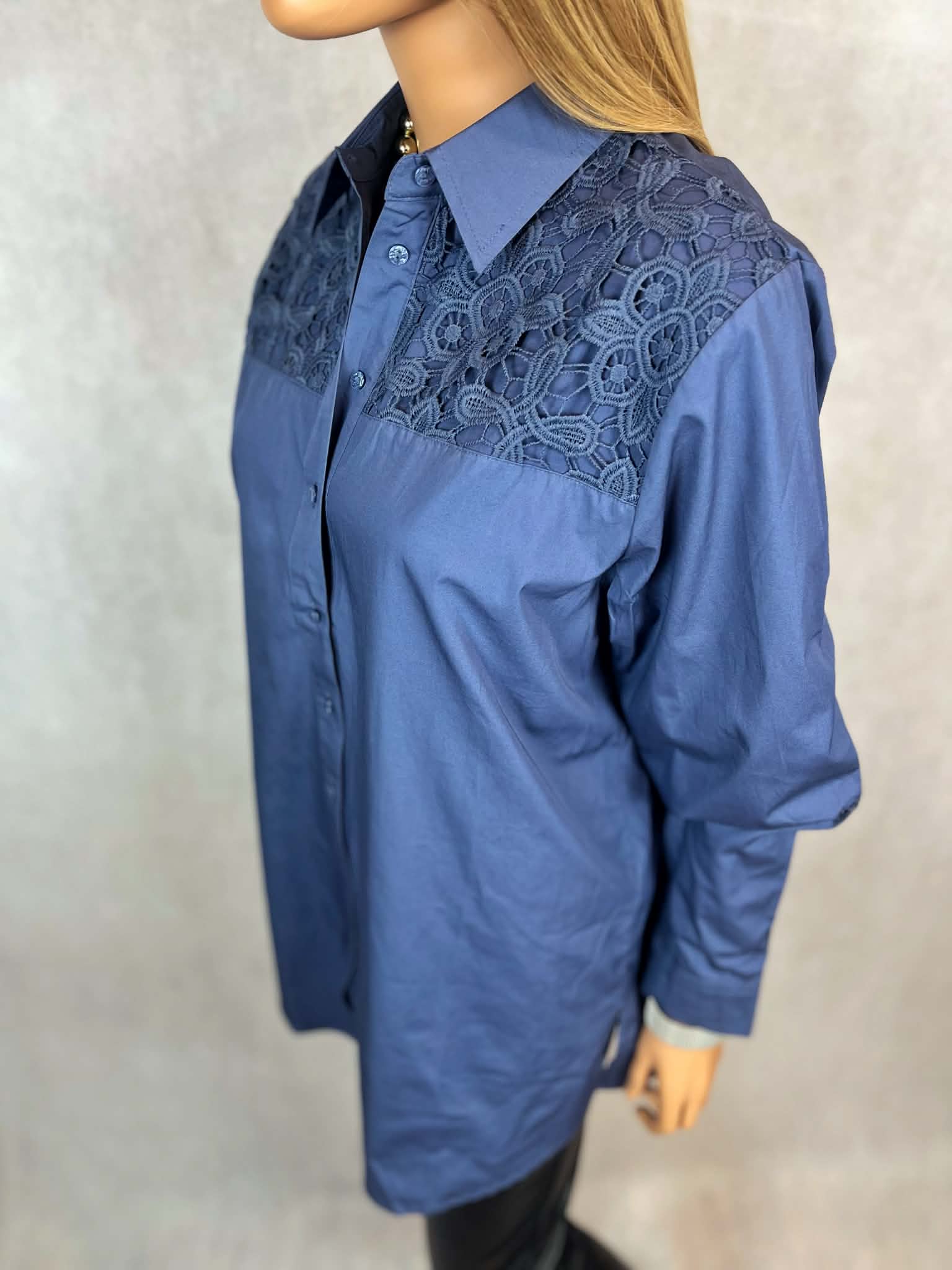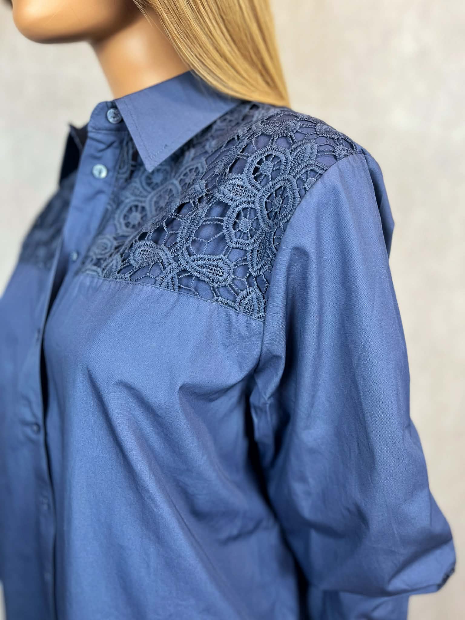 Klasyczna koszula w eleganckim, stonowanym odcieniu granatu, uzupełniona efektowną koronkową wstawką w górnej części. Ażurowy detal dodaje subtelnej kobiecości, nie odbierając jej uniwersalnego charakteru.