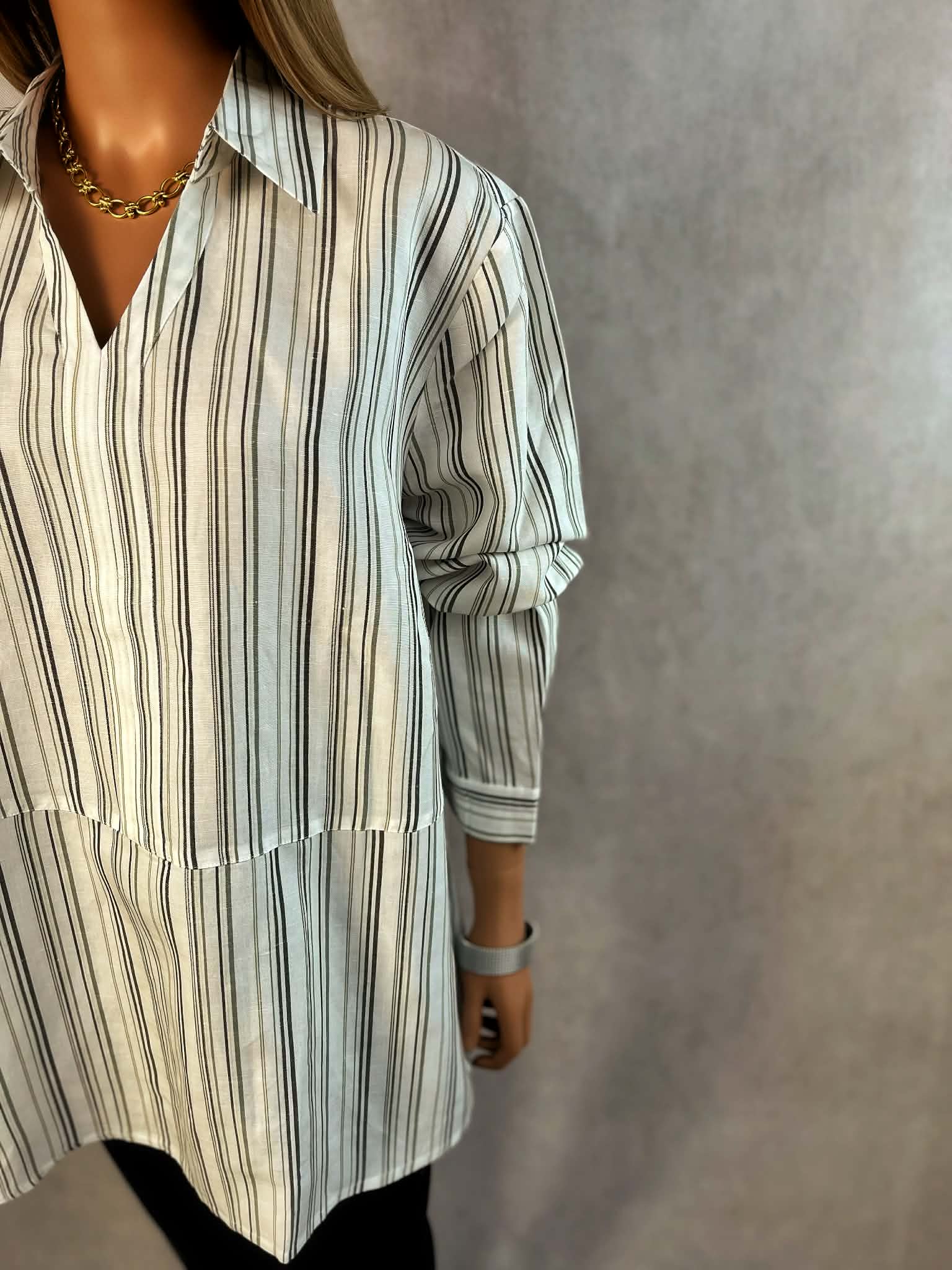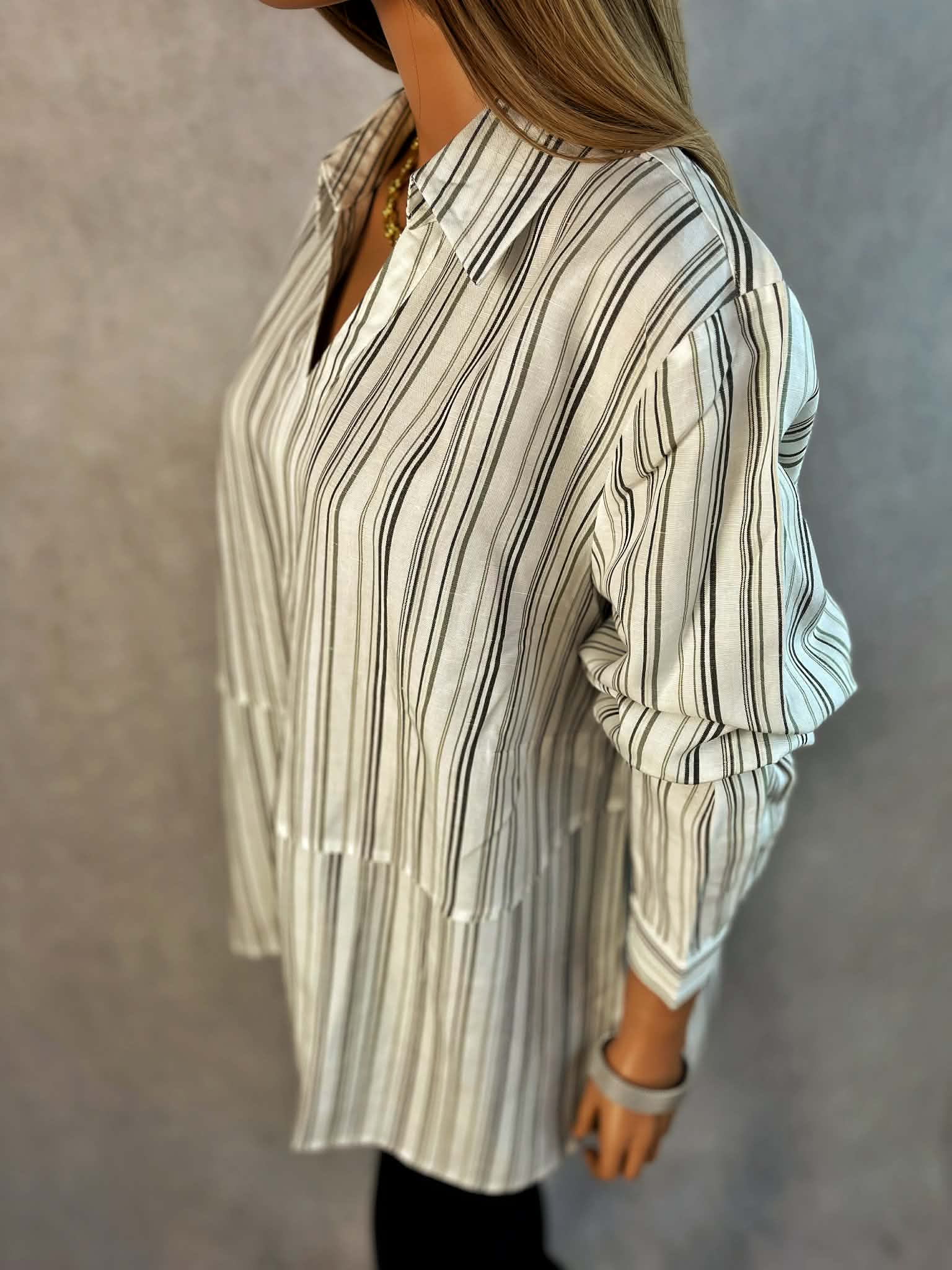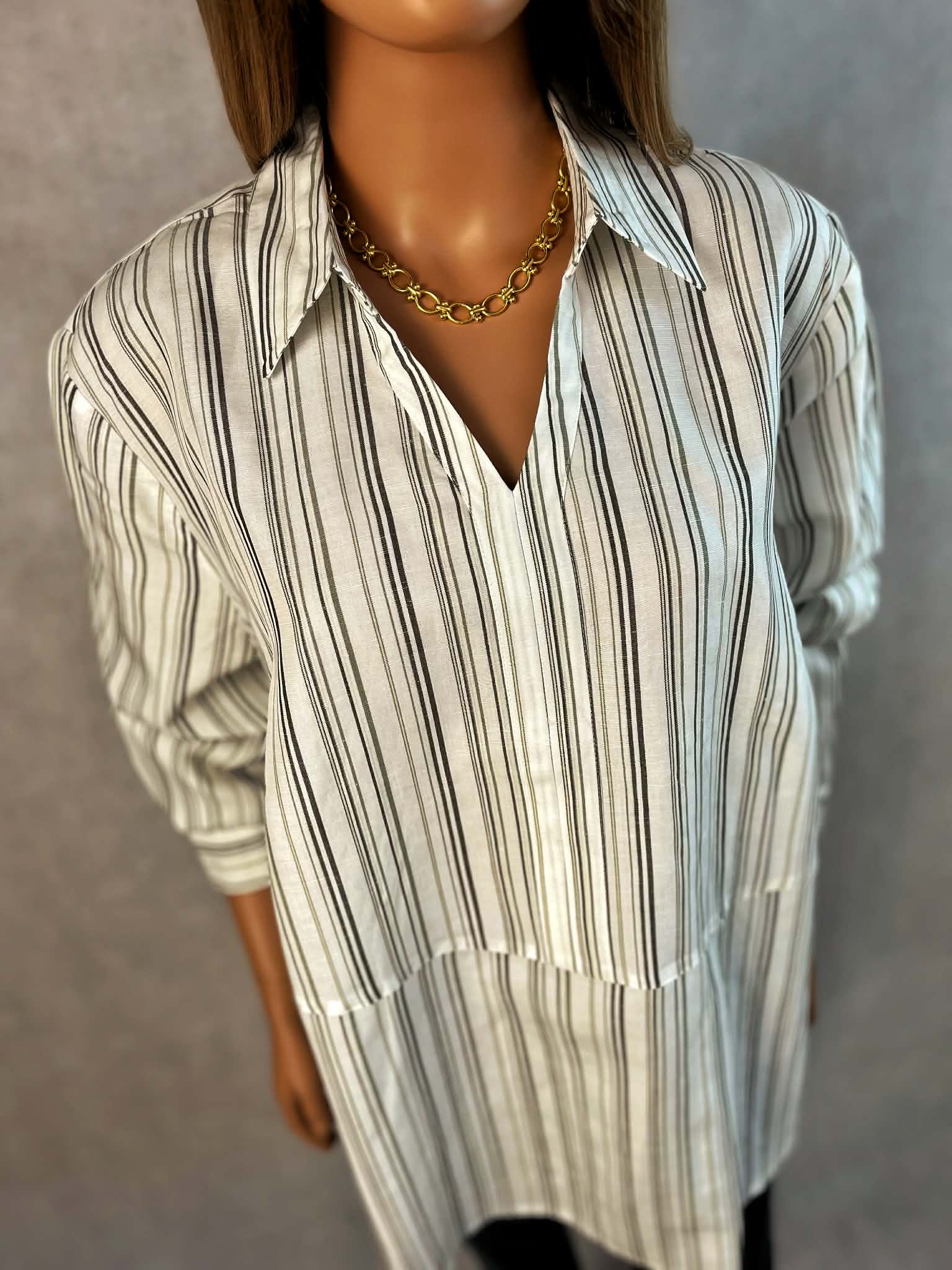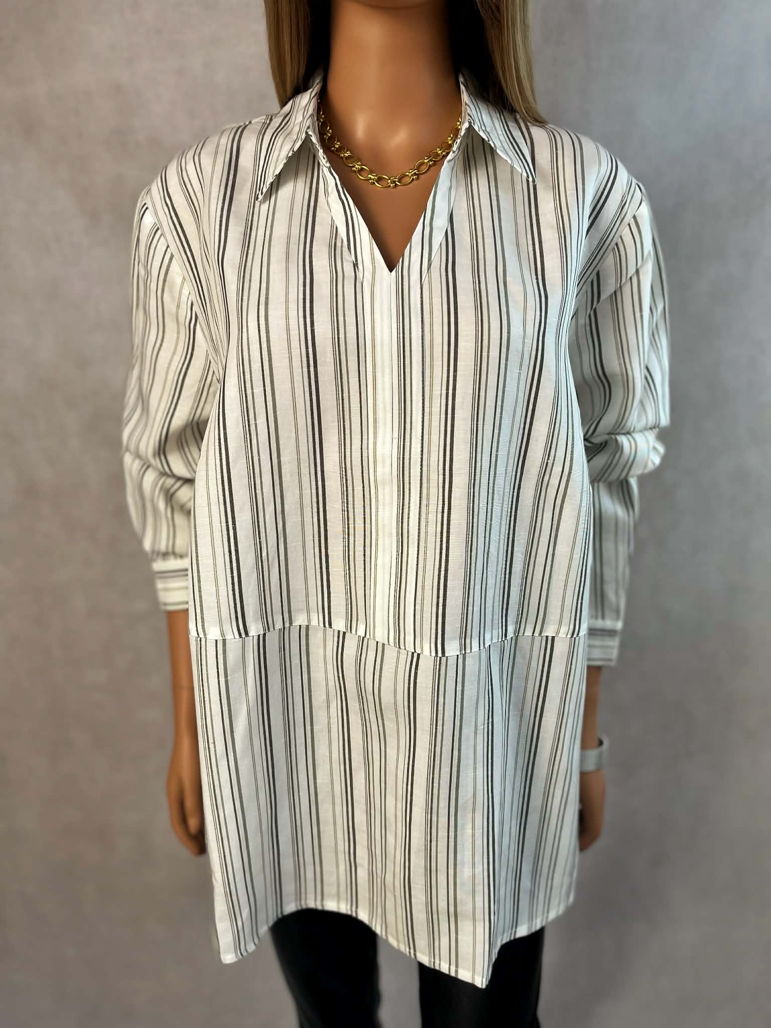 Luźny fason typu tunika sprawia, że koszula swobodnie opływa ciało, nie opina i nie podkreśla newralgicznych miejsc. Delikatne pionowe paski optycznie wysmuklają sylwetkę, a odpowiednia długość pozwala zakryć biodra i brzuch, dzięki czemu całość prezentuje się proporcjonalnie i lekko.