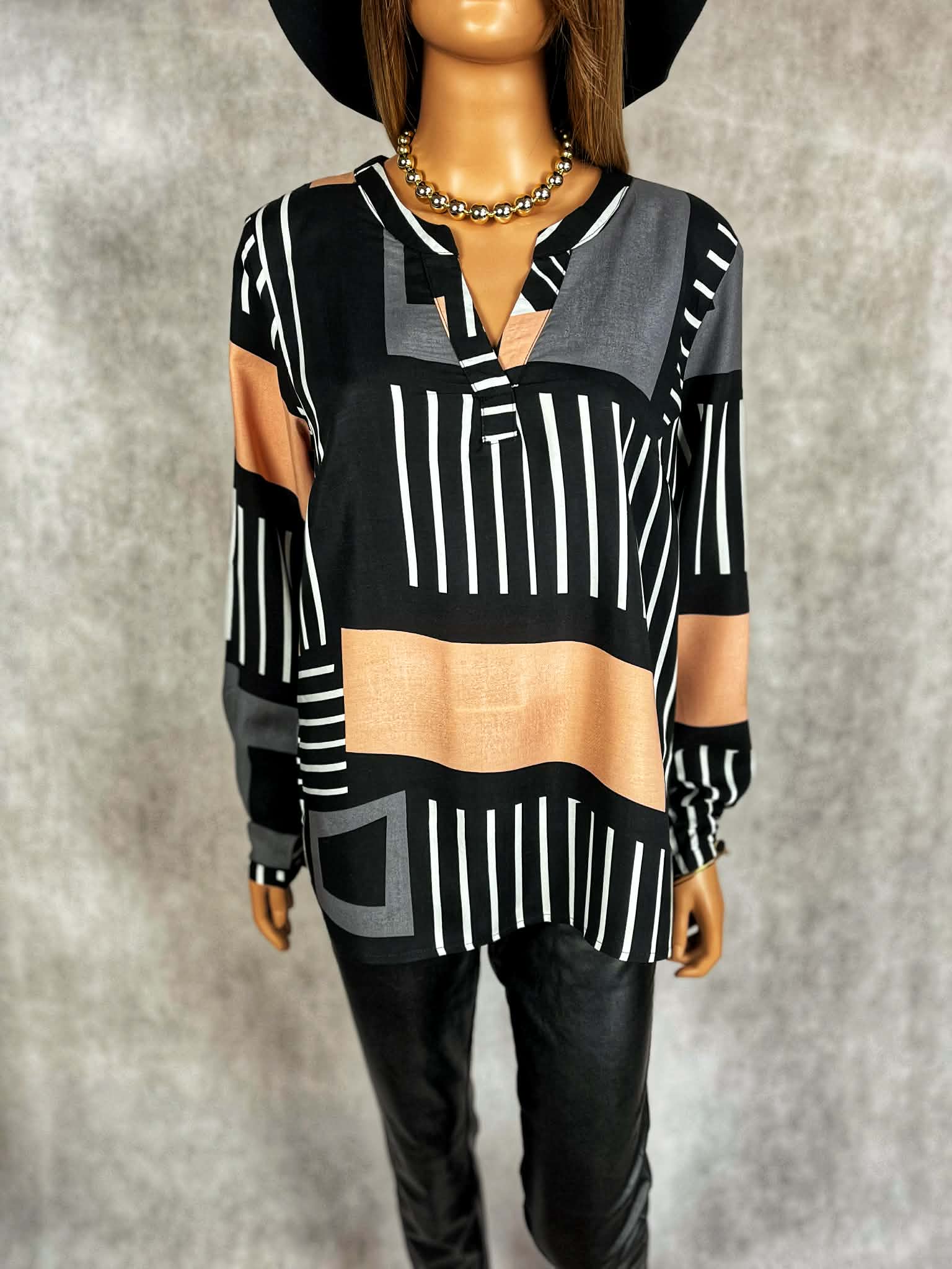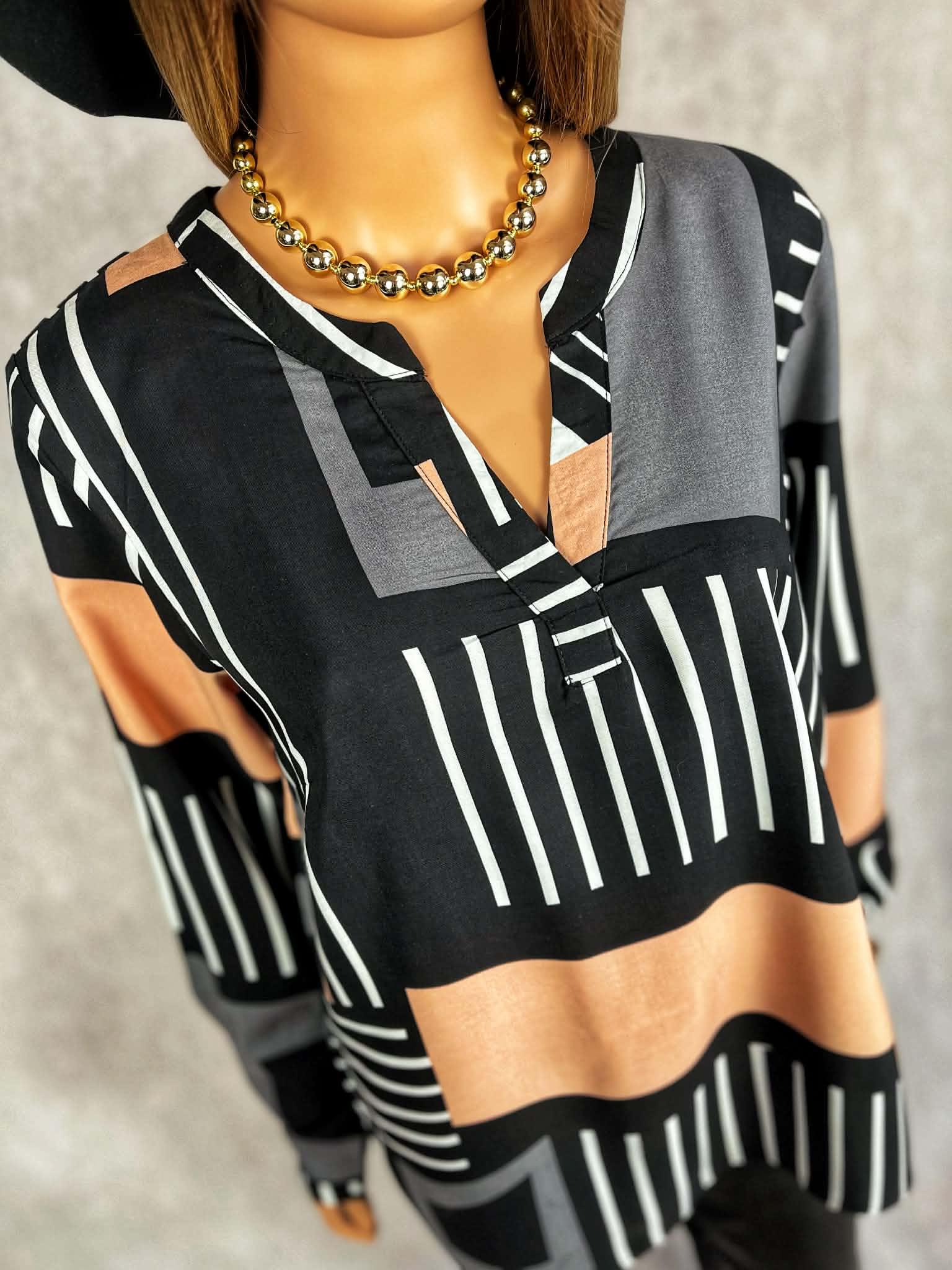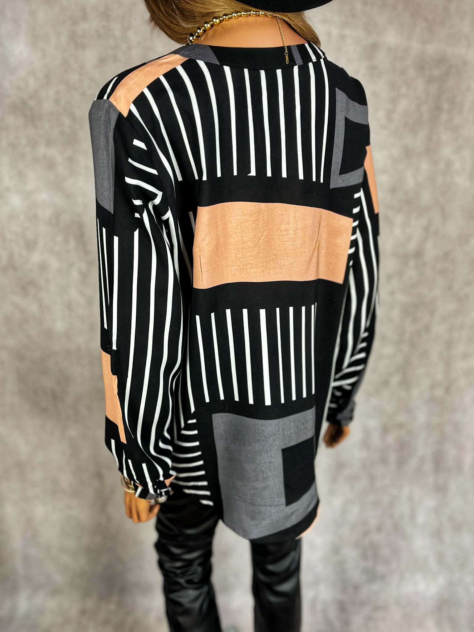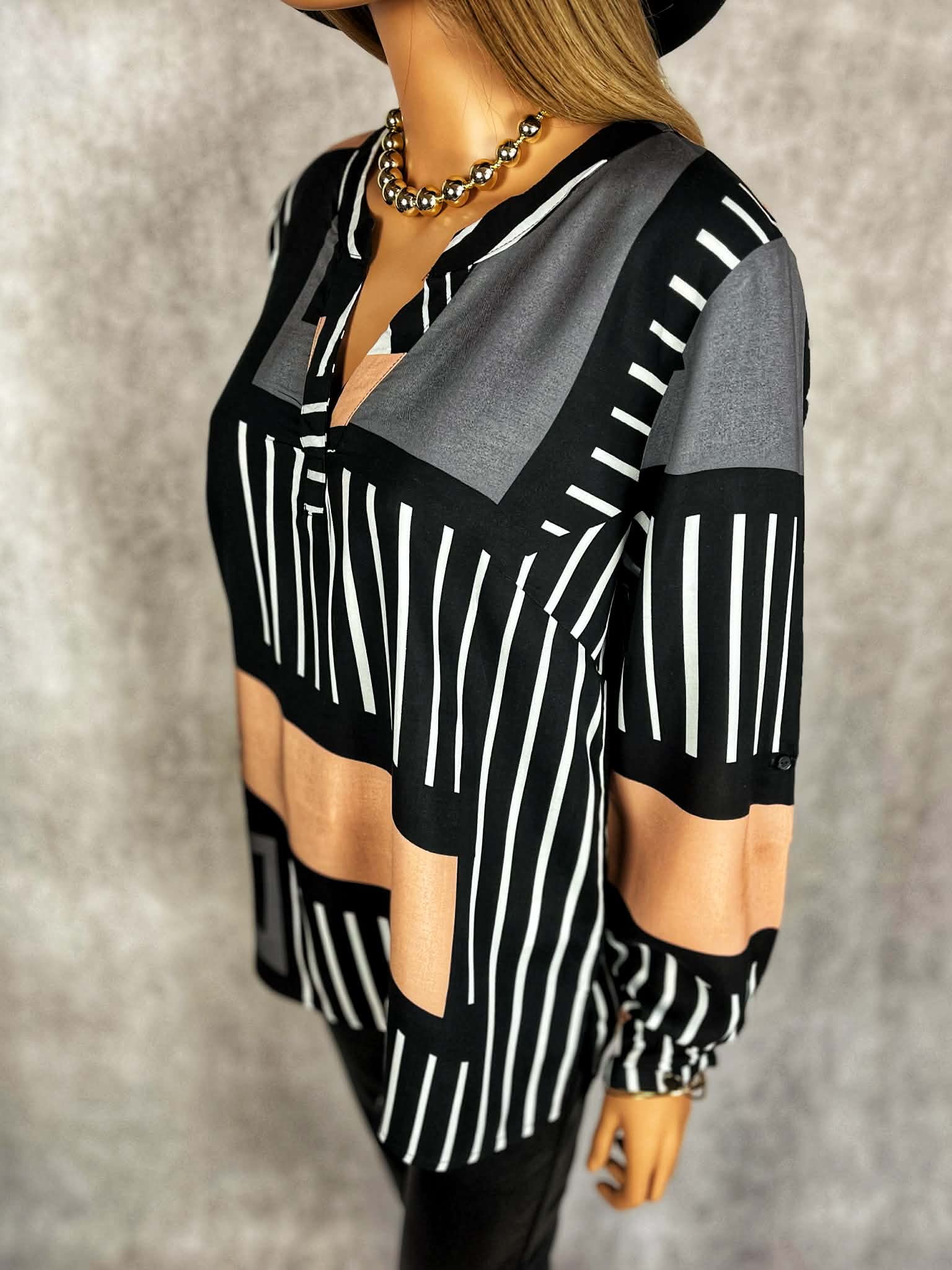 Luźna koszula/bluzka w efektowny, geometryczny wzór w odcieniach czerni, beżu i szarości. Nowoczesne zestawienie pasów i bloków kolorystycznych nadaje stylizacji wyrazisty, modowy charakter.