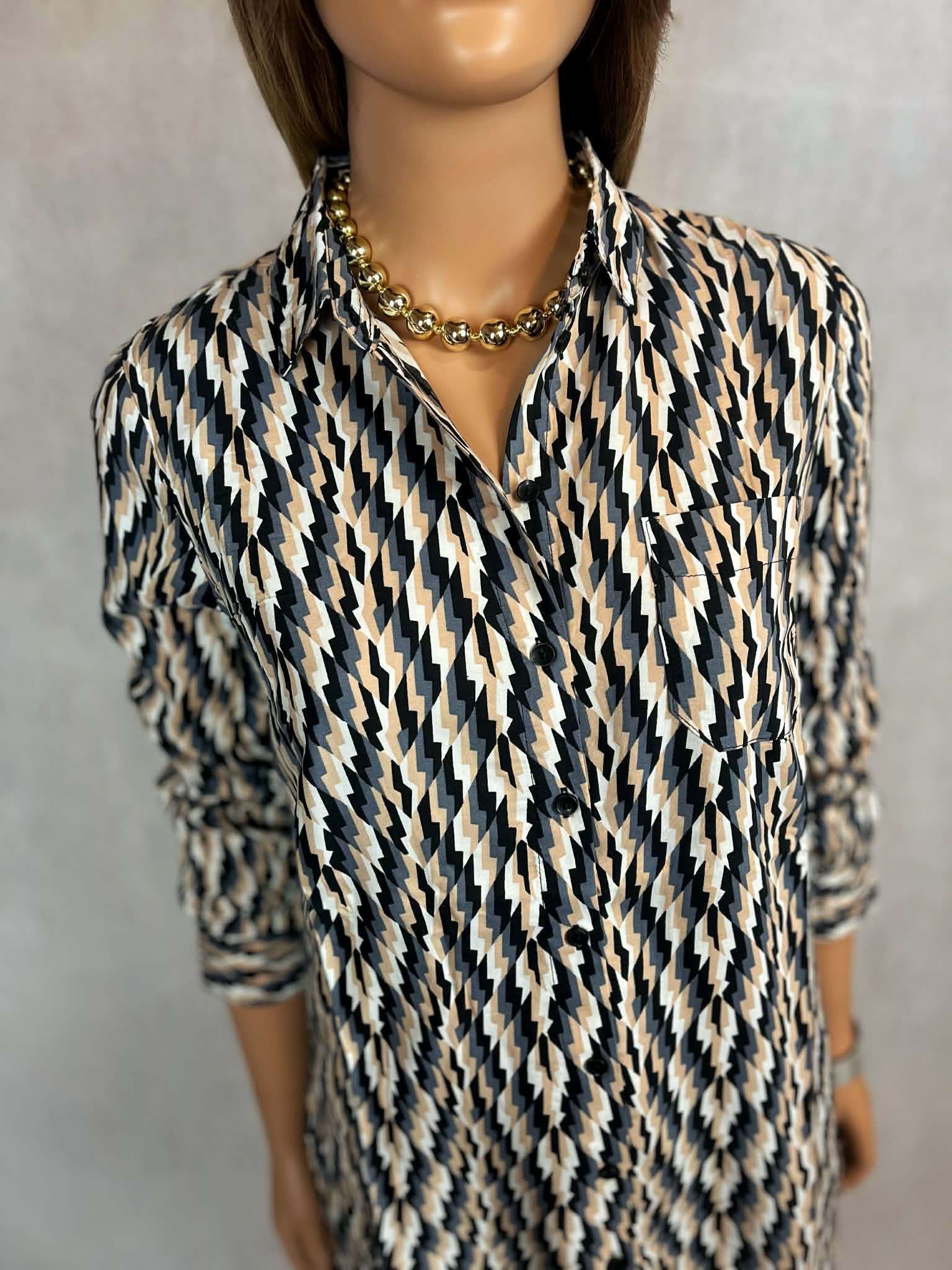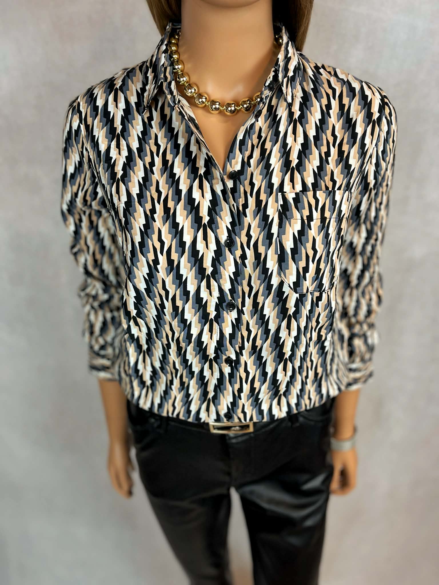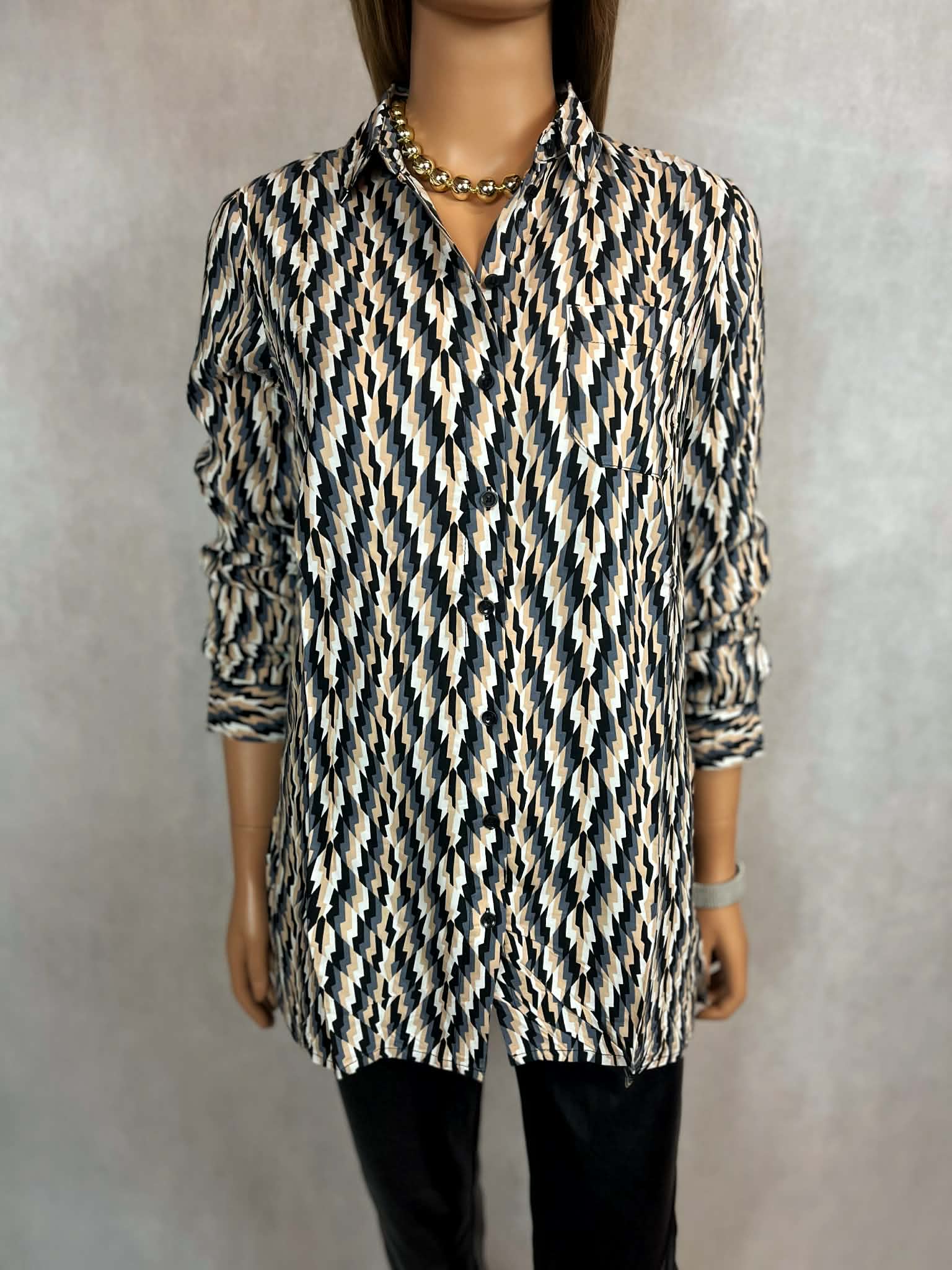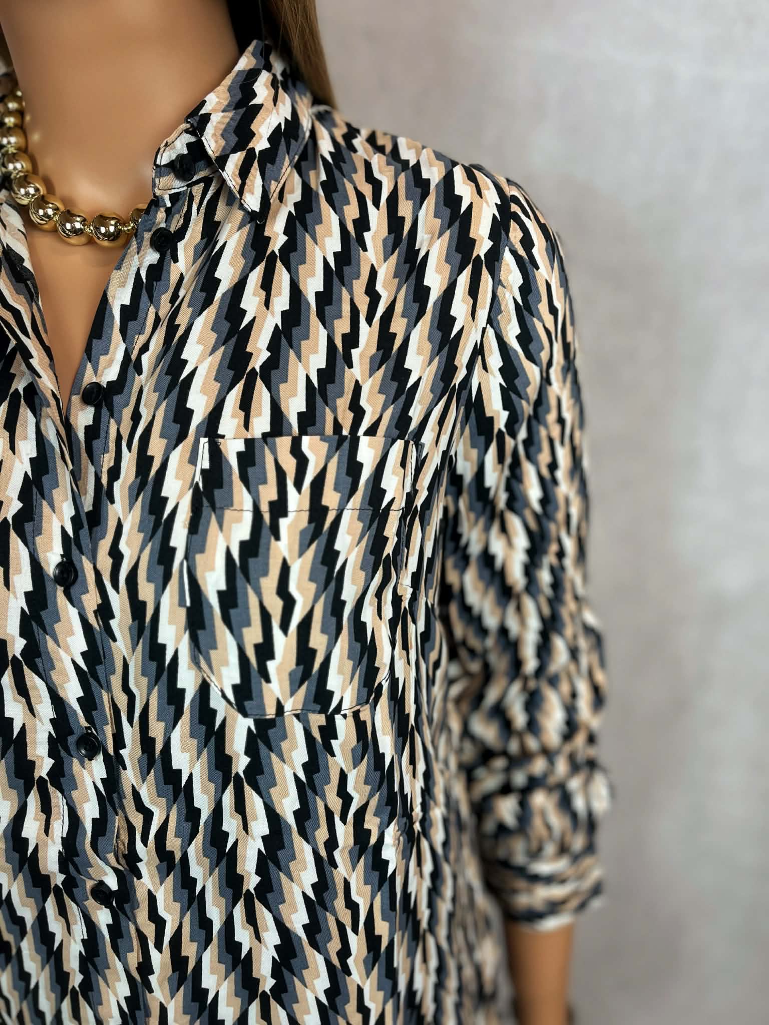 Efektowna koszula w dynamiczny, geometryczny wzór w tonacji czerni, beżu i złamanej bieli. Model zapinany na guziki, z klasycznym kołnierzykiem oraz praktyczną kieszonką na piersi.
