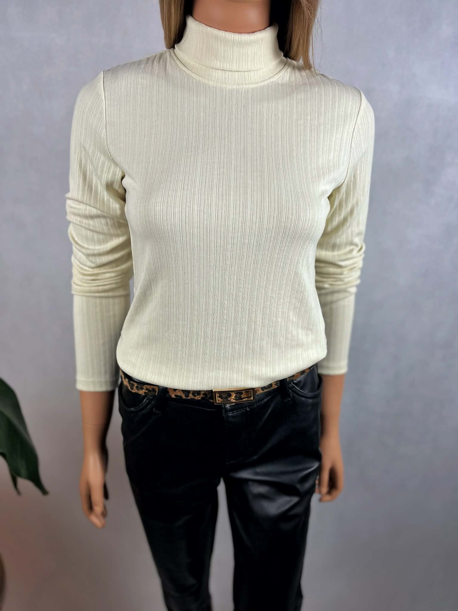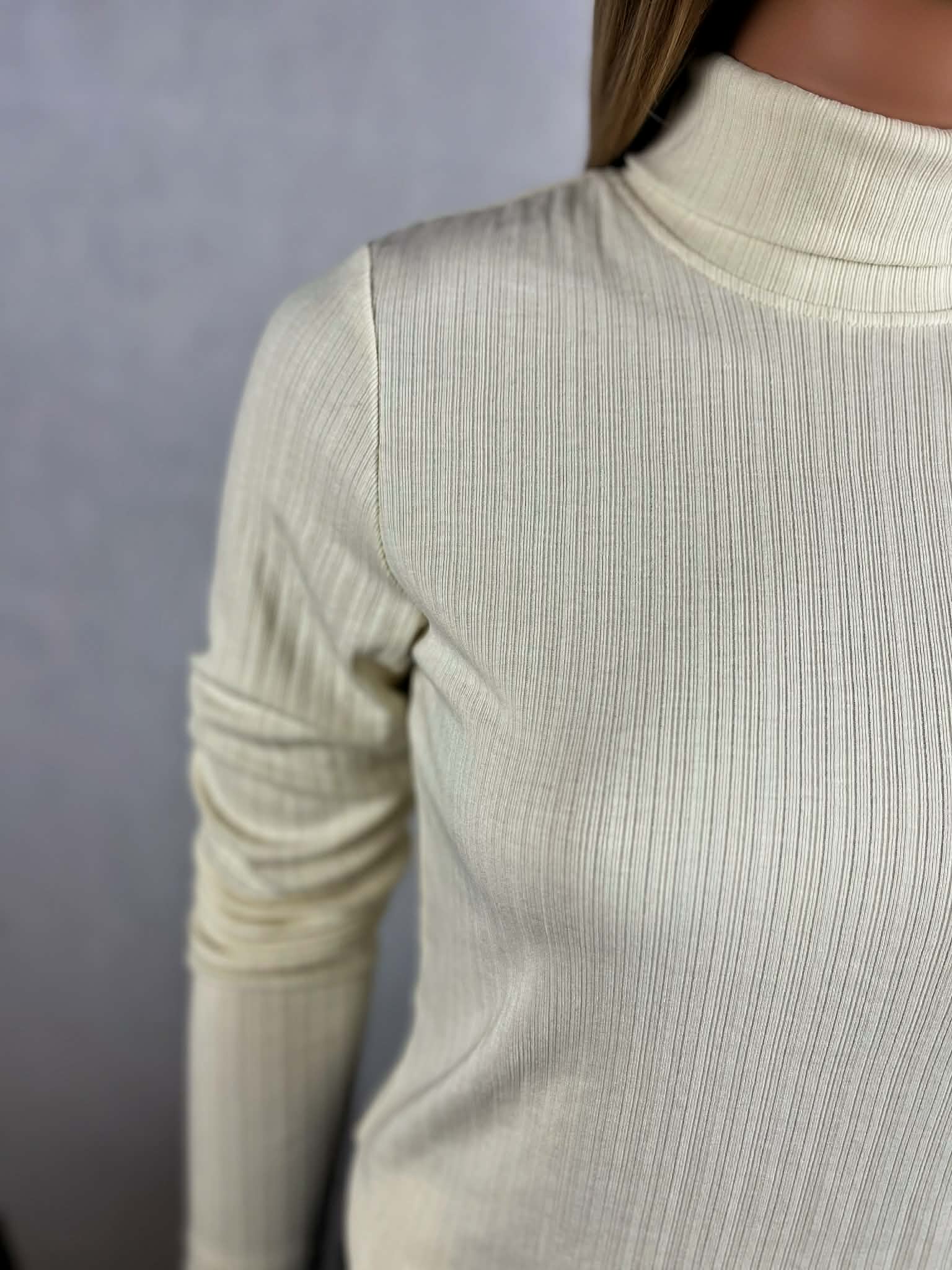 Dopasowany golf w kremowym kolorze z prążkowanej dzianiny, który podkreśla sylwetkę i pasuje do każdej stylizacji.