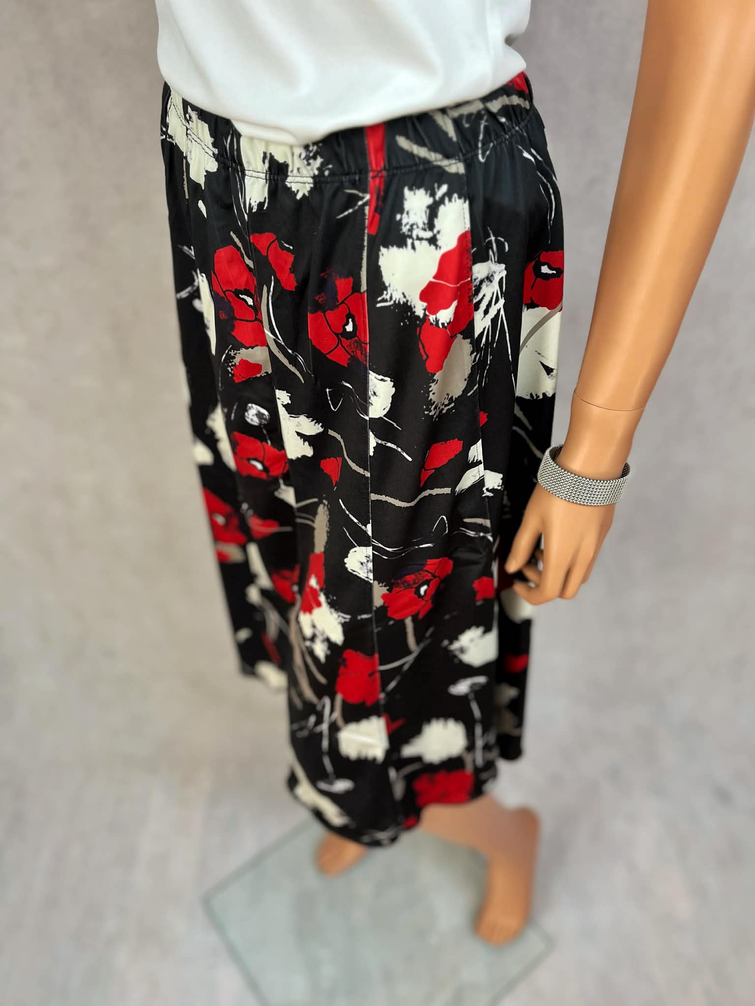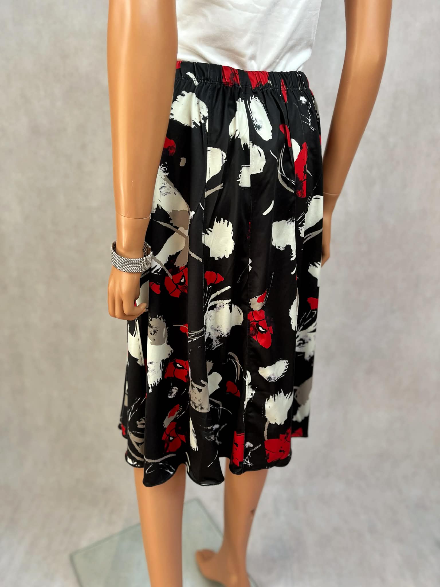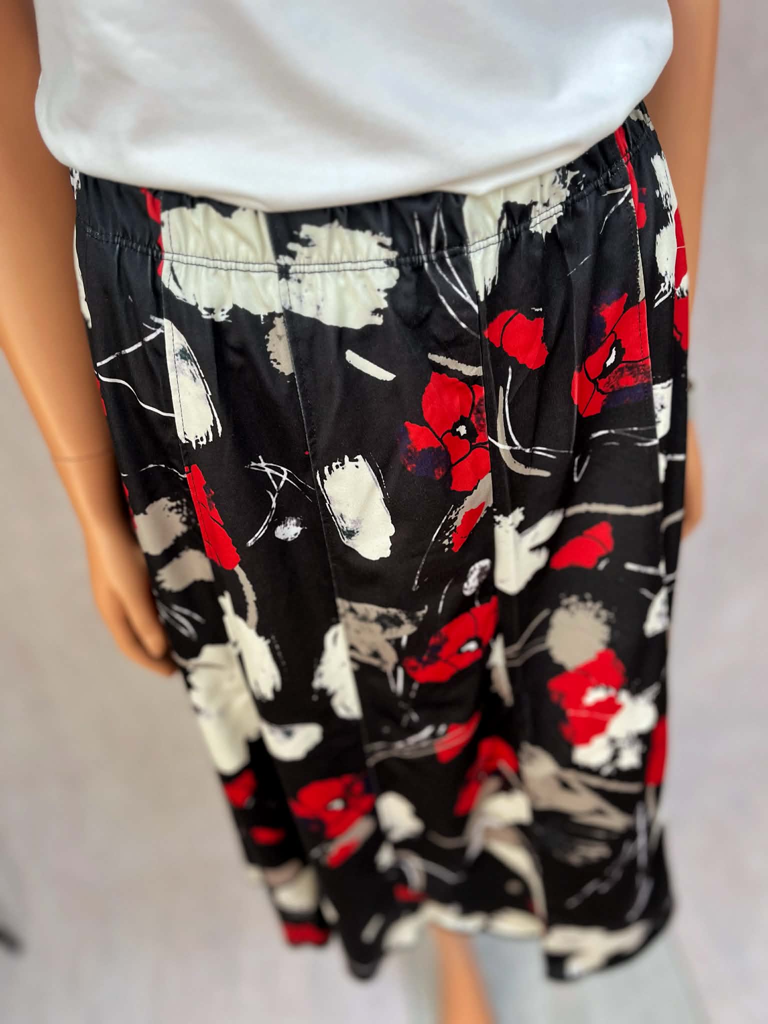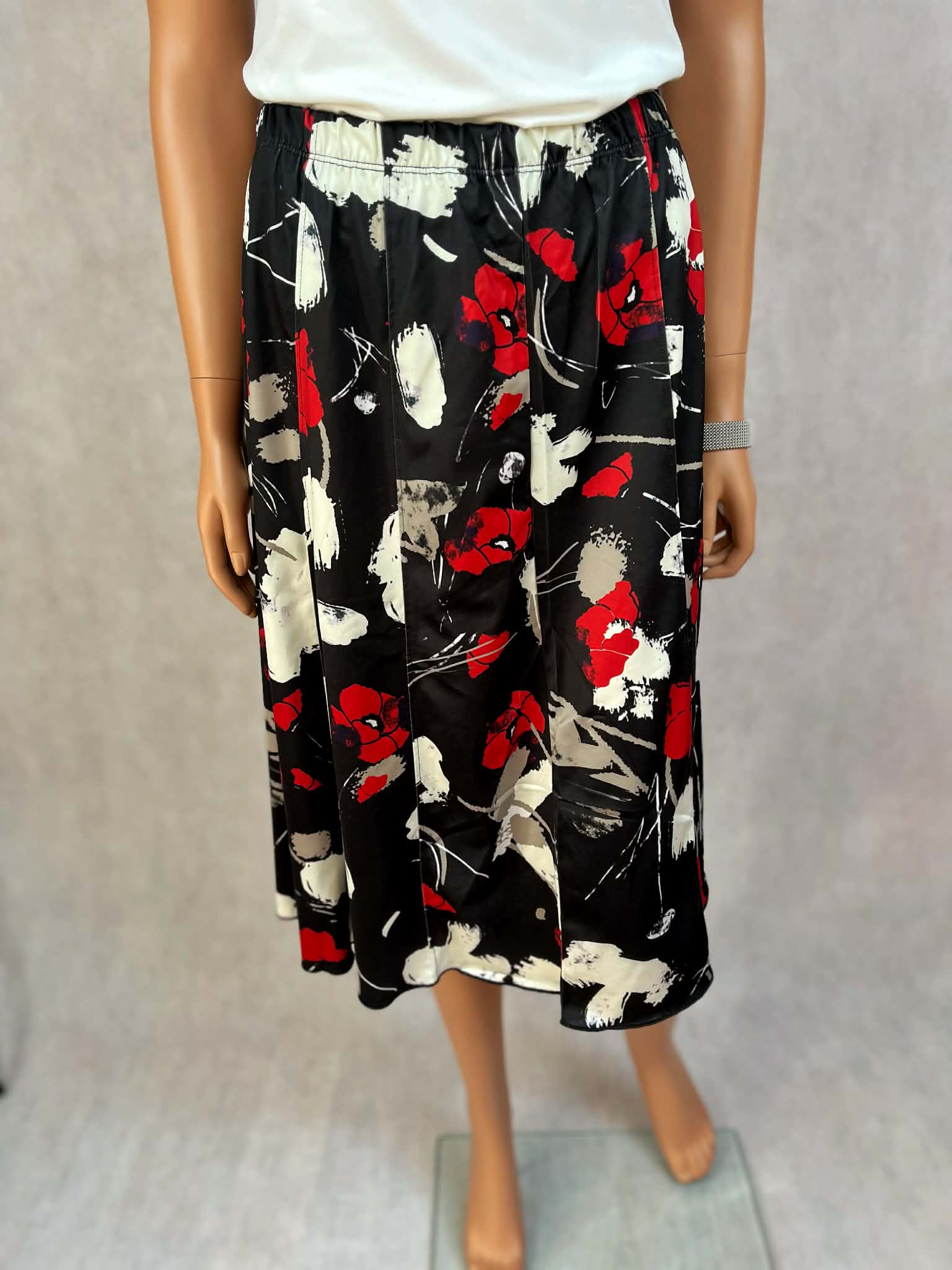 Spódnica midi w klasycznej czerni z efektownym czerwono-białym wzorem kwiatowym. Lekki, miękko układający się materiał nadaje sylwetce swobody i płynności ruchu.