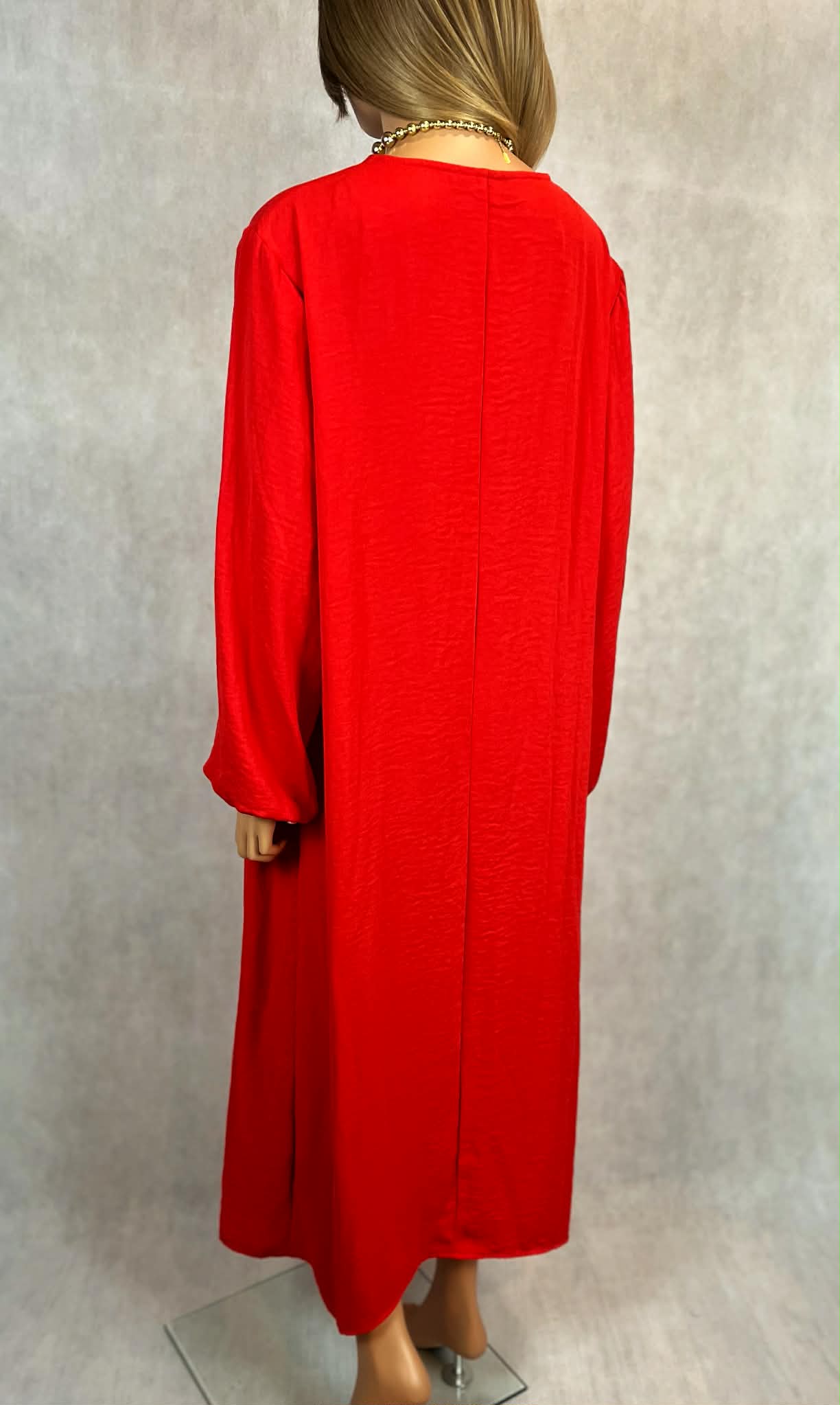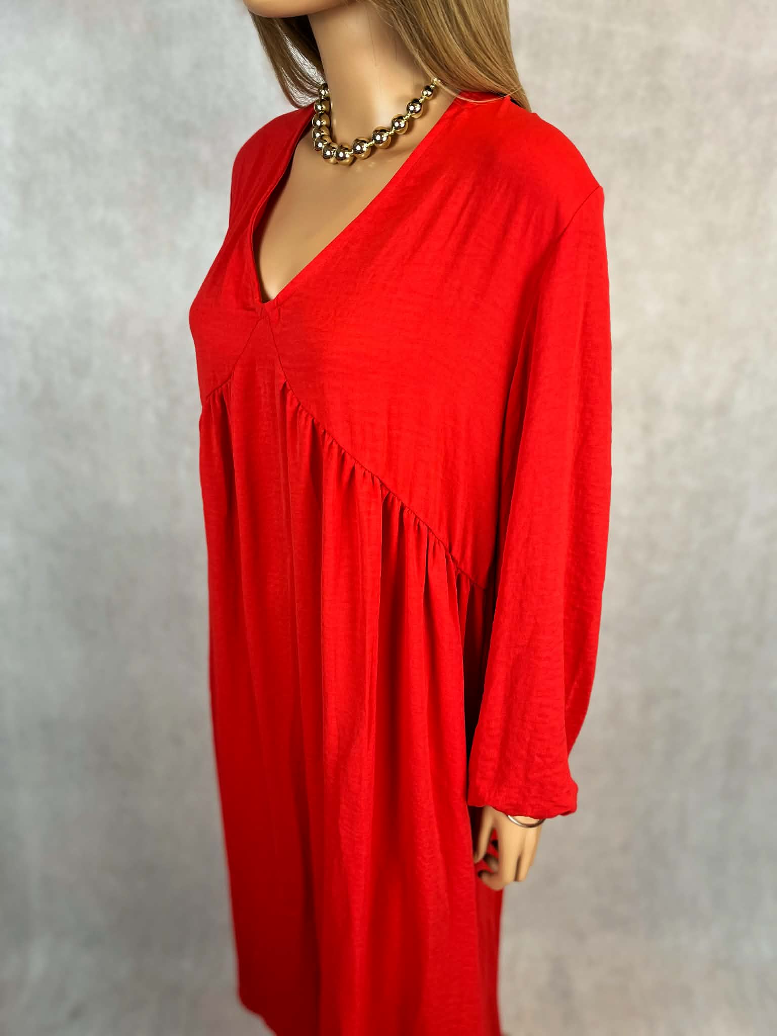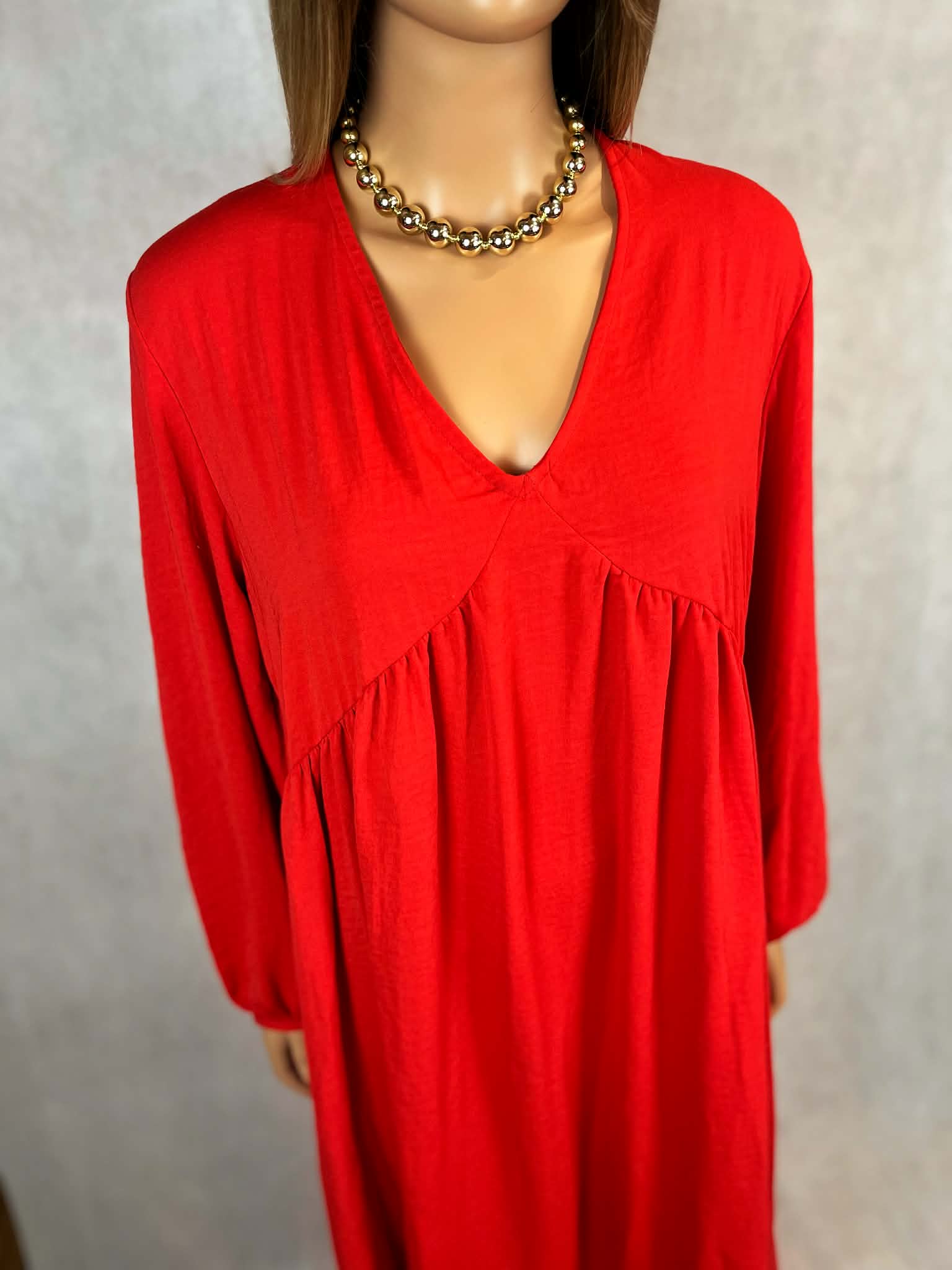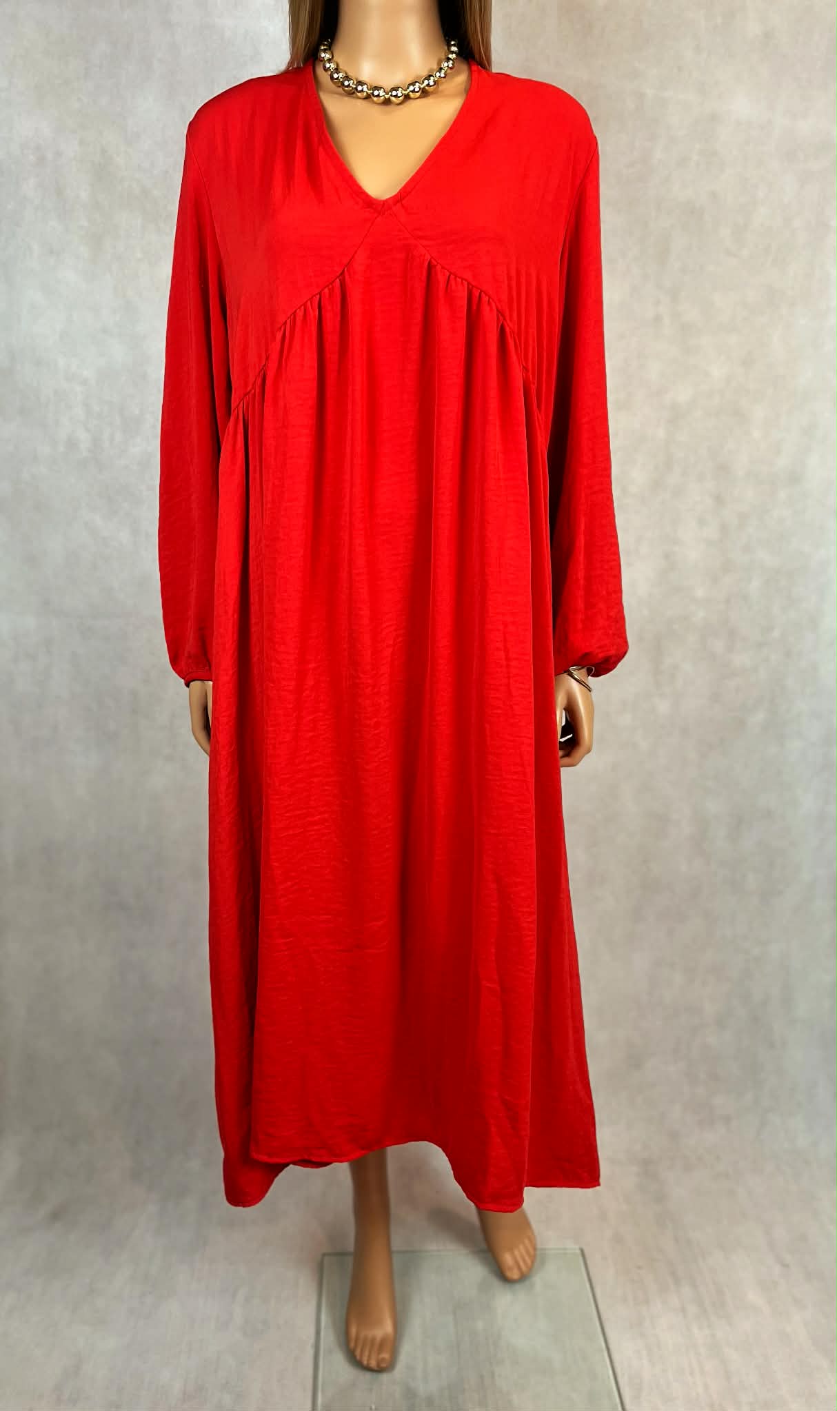 Wyrazista, długa sukienka w intensywnym odcieniu czerwieni, która przyciąga spojrzenia i podkreśla pewność siebie. Model o długości maxi z głębokim dekoltem w kształcie litery V subtelnie eksponuje górną część sylwetki, zachowując elegancki charakter.
