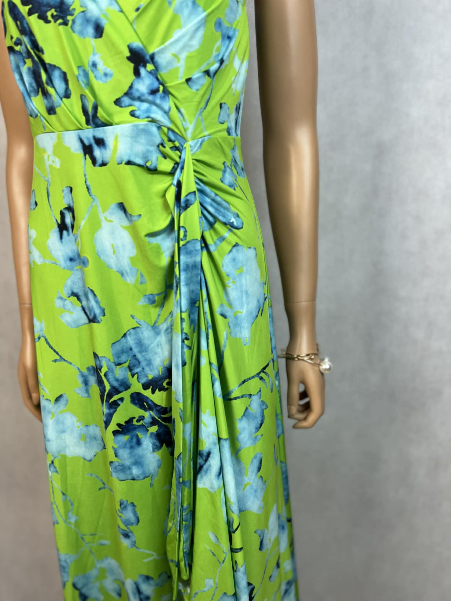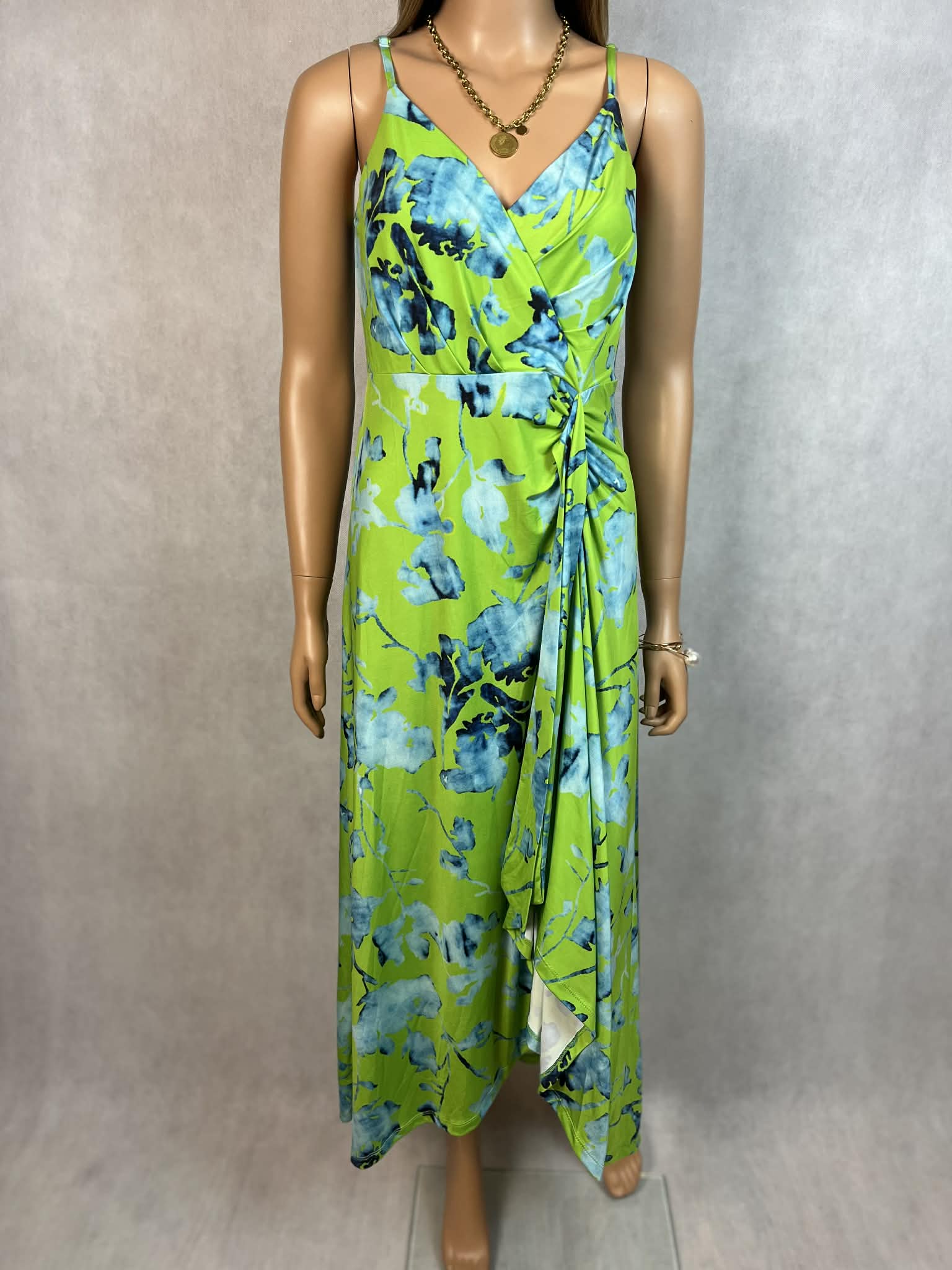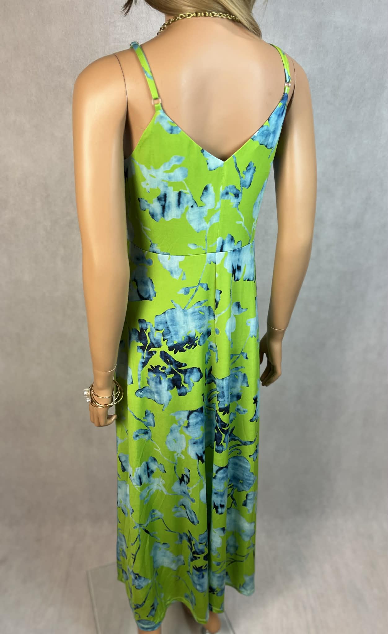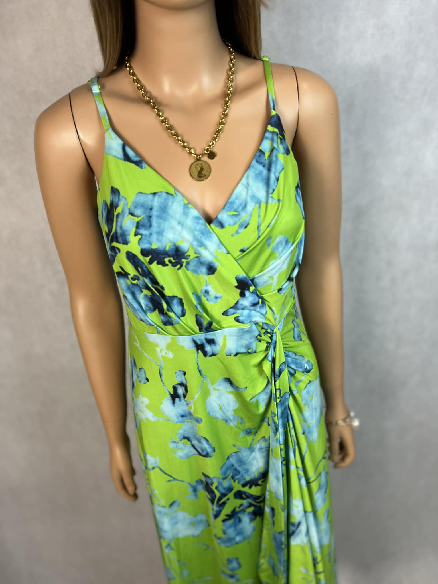 Wyrazista sukienka maxi w energetycznym odcieniu limonki z efektownym, akwarelowym printem w tonacji niebieskiej. Model na cienkich, regulowanych ramiączkach z kobiecym kopertowym dekoltem, który pięknie podkreśla linię biustu.