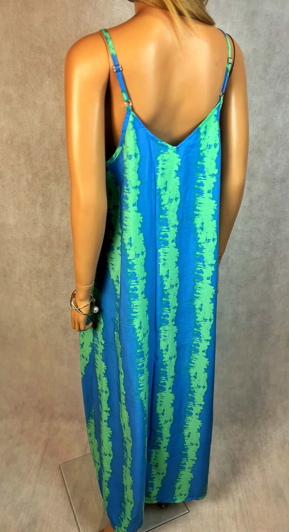 Zwiewna sukienka maxi w intensywnych odcieniach niebieskiego i zieleni. Pionowy, dynamiczny wzór optycznie wydłuża sylwetkę i nadaje całości lekkości.