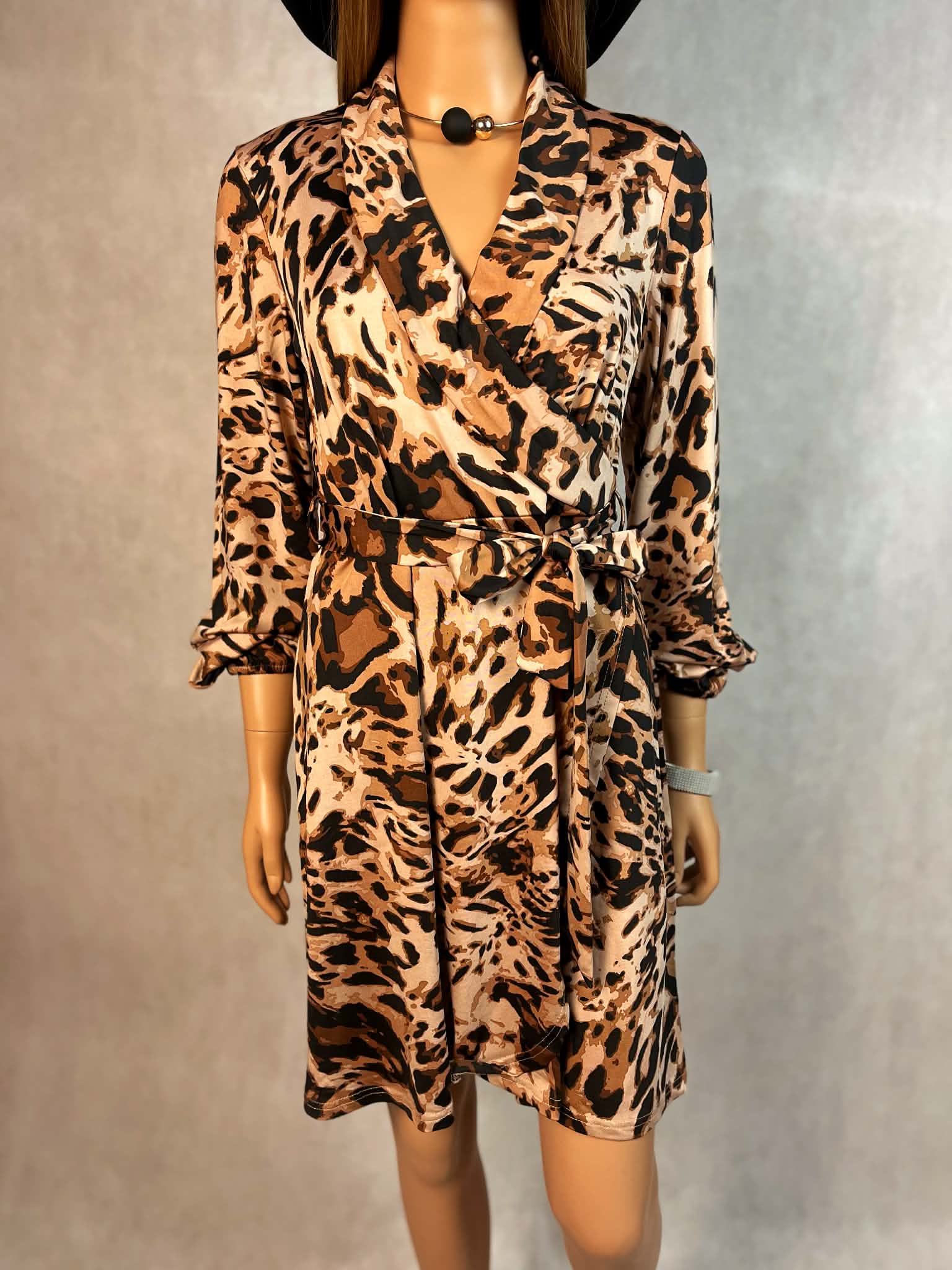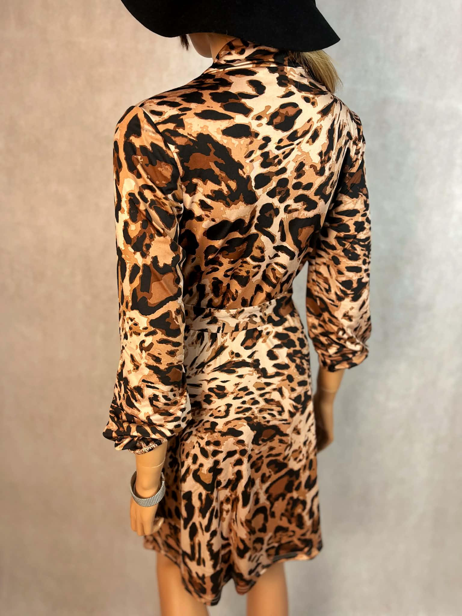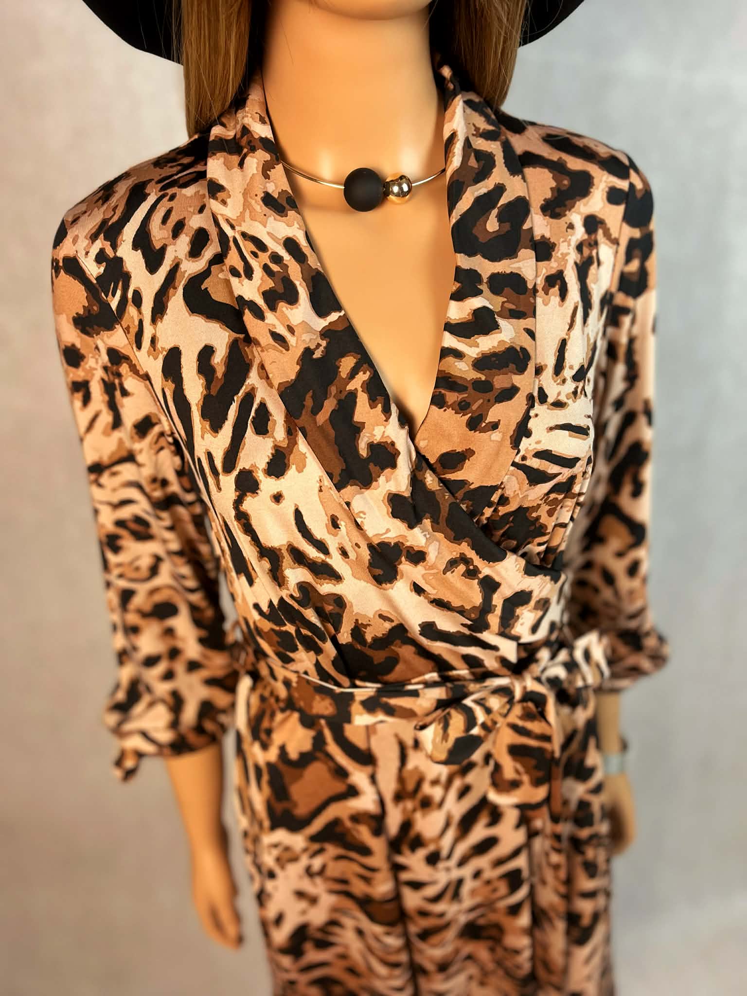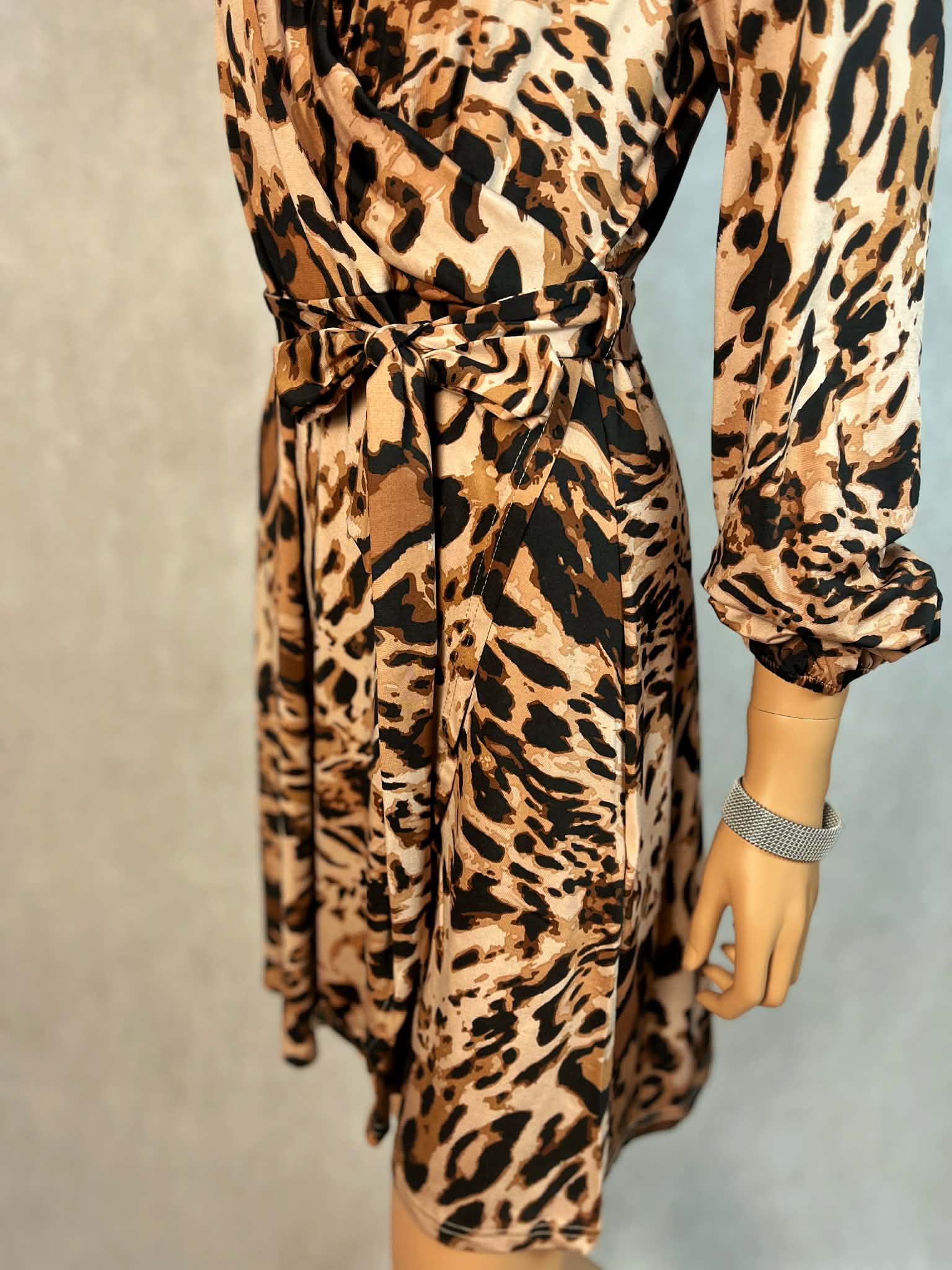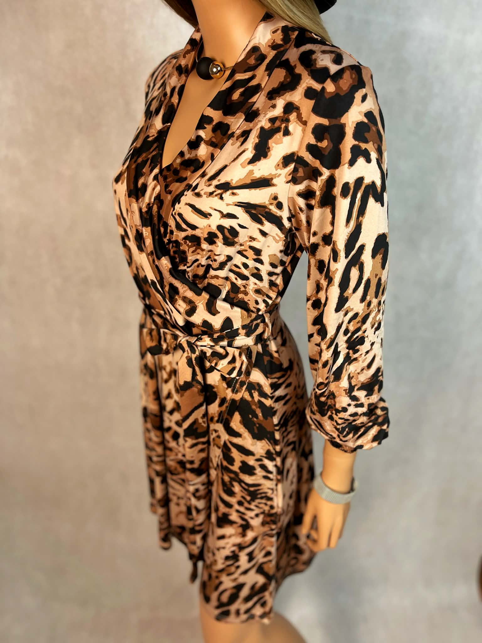Efektowna sukienka w modny print animal marki Bonprix. Model o kopertowym dekolcie pięknie podkreśla biust i optycznie wysmukla szyję. W talii wszyta guma oraz pasek z tego samego materiału, który pozwala dopasować fason do sylwetki.