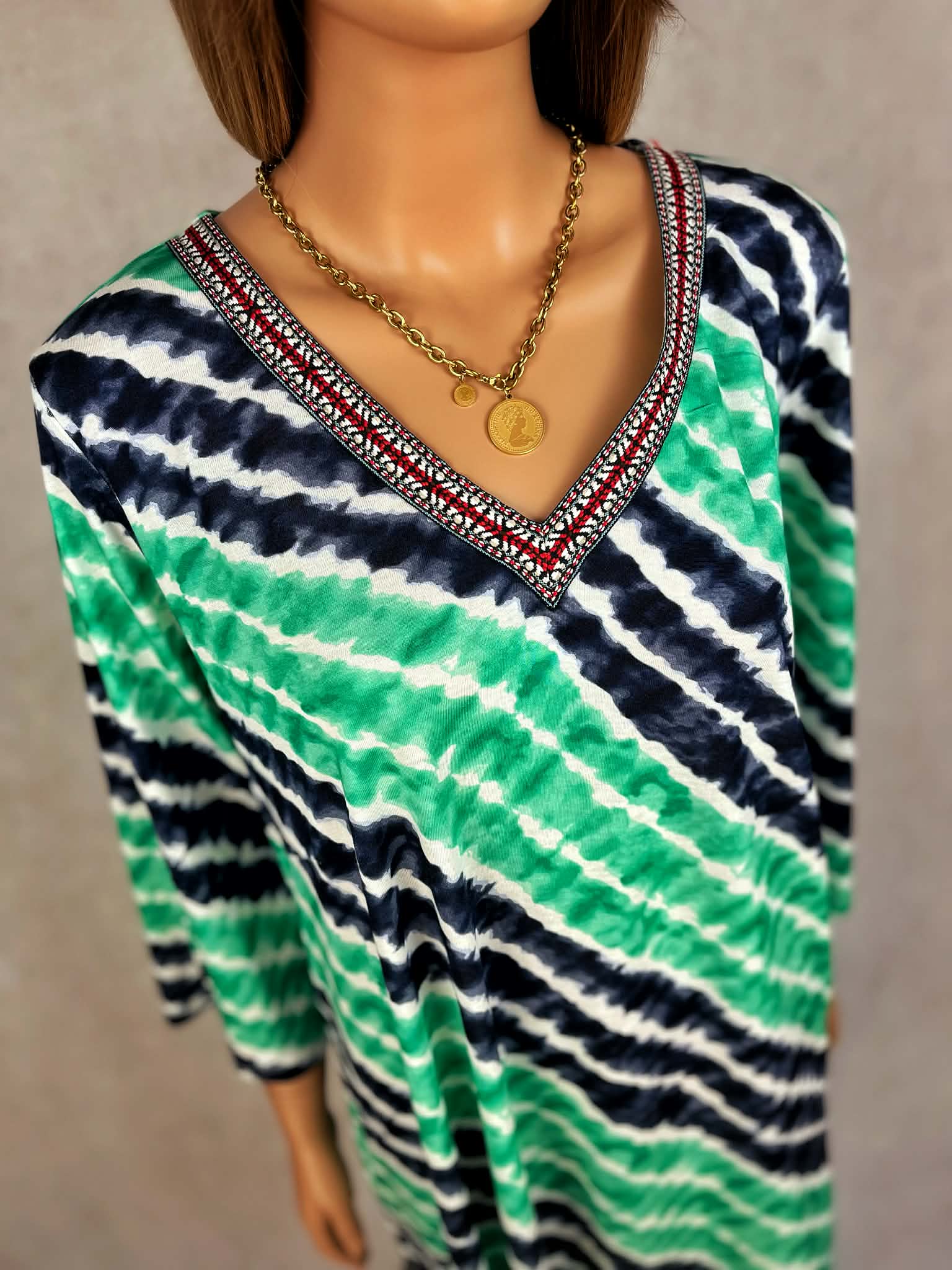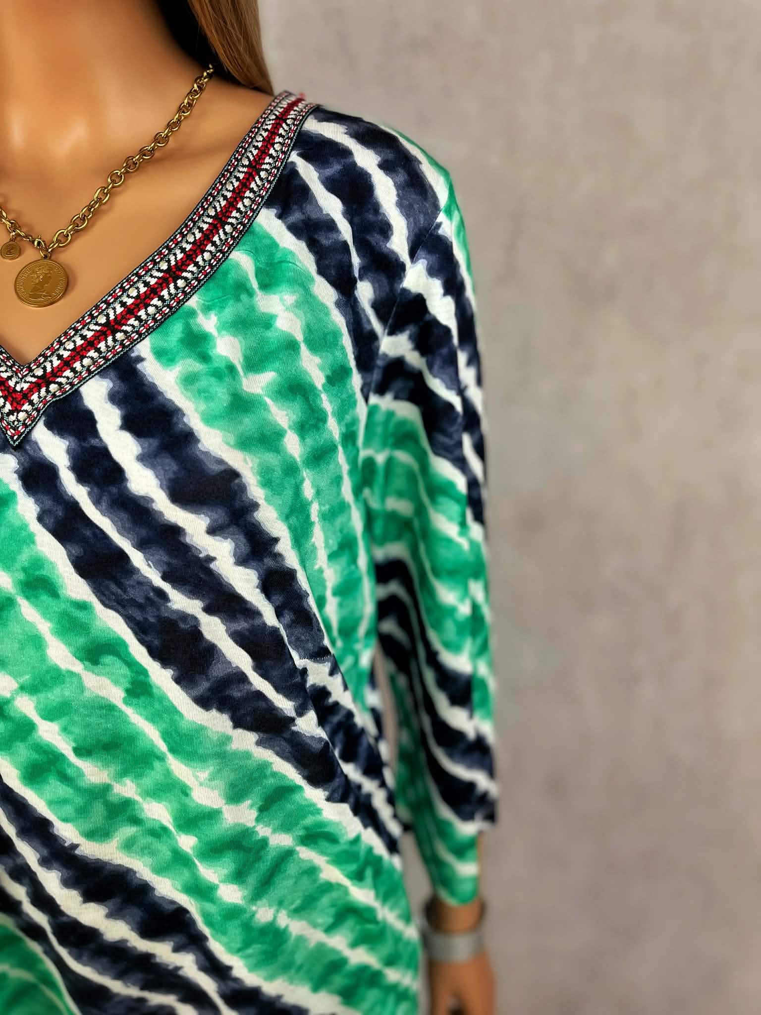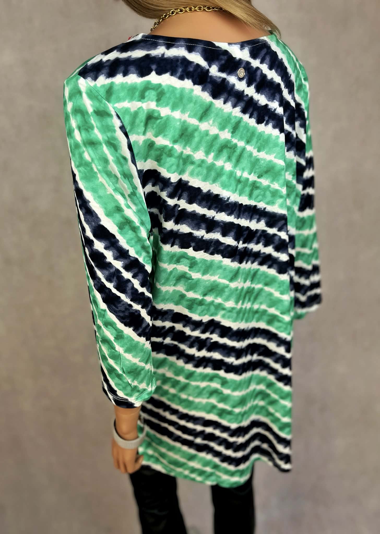 Stylowa tunika damska o swobodnym fasonie, wykonana z lekkiej, przyjemnej w dotyku tkaniny. Model w wyrazisty zielono-granatowy wzór typu tie-dye.