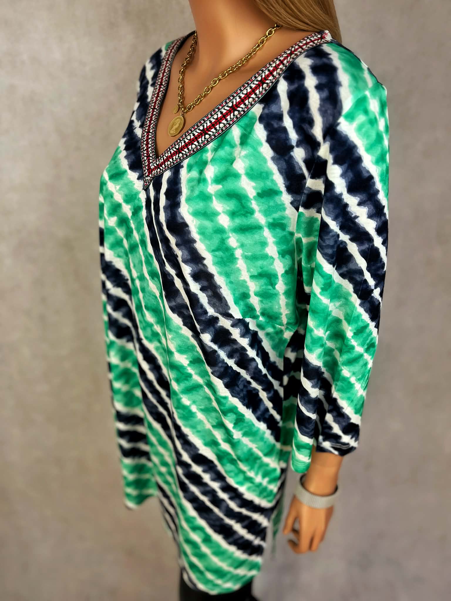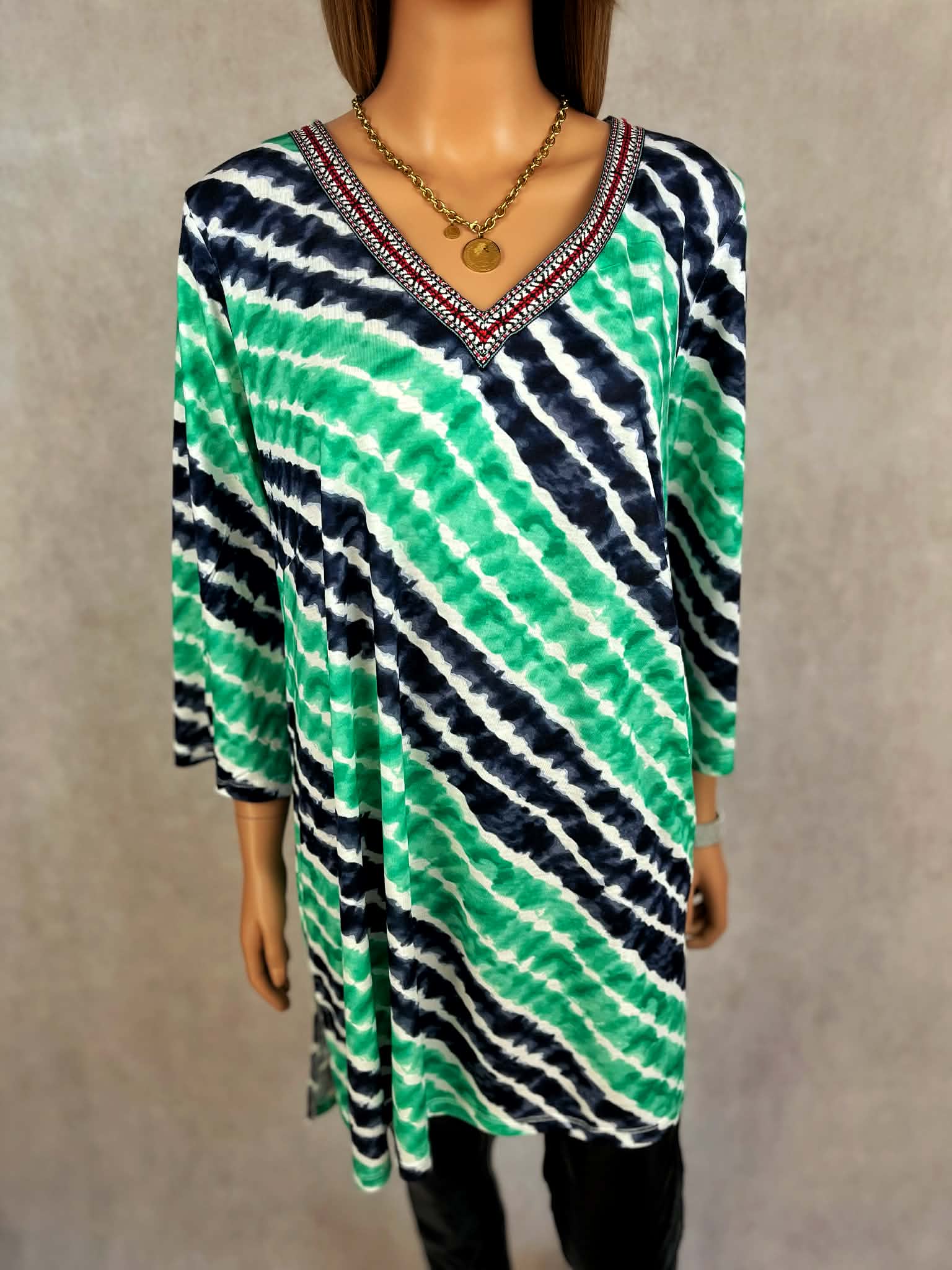 Tunika damska w zielono-granatowy wzór z dekoltem V