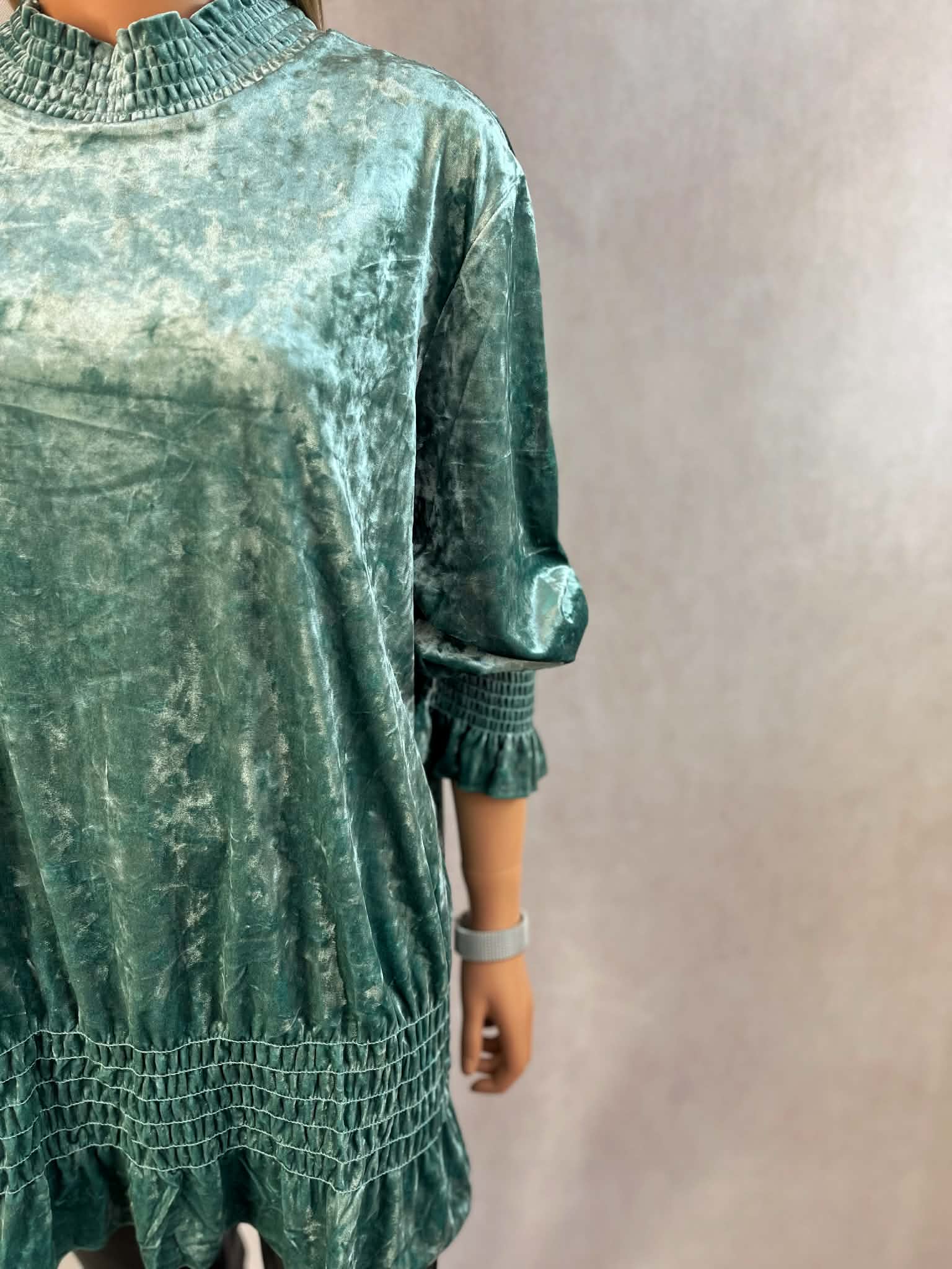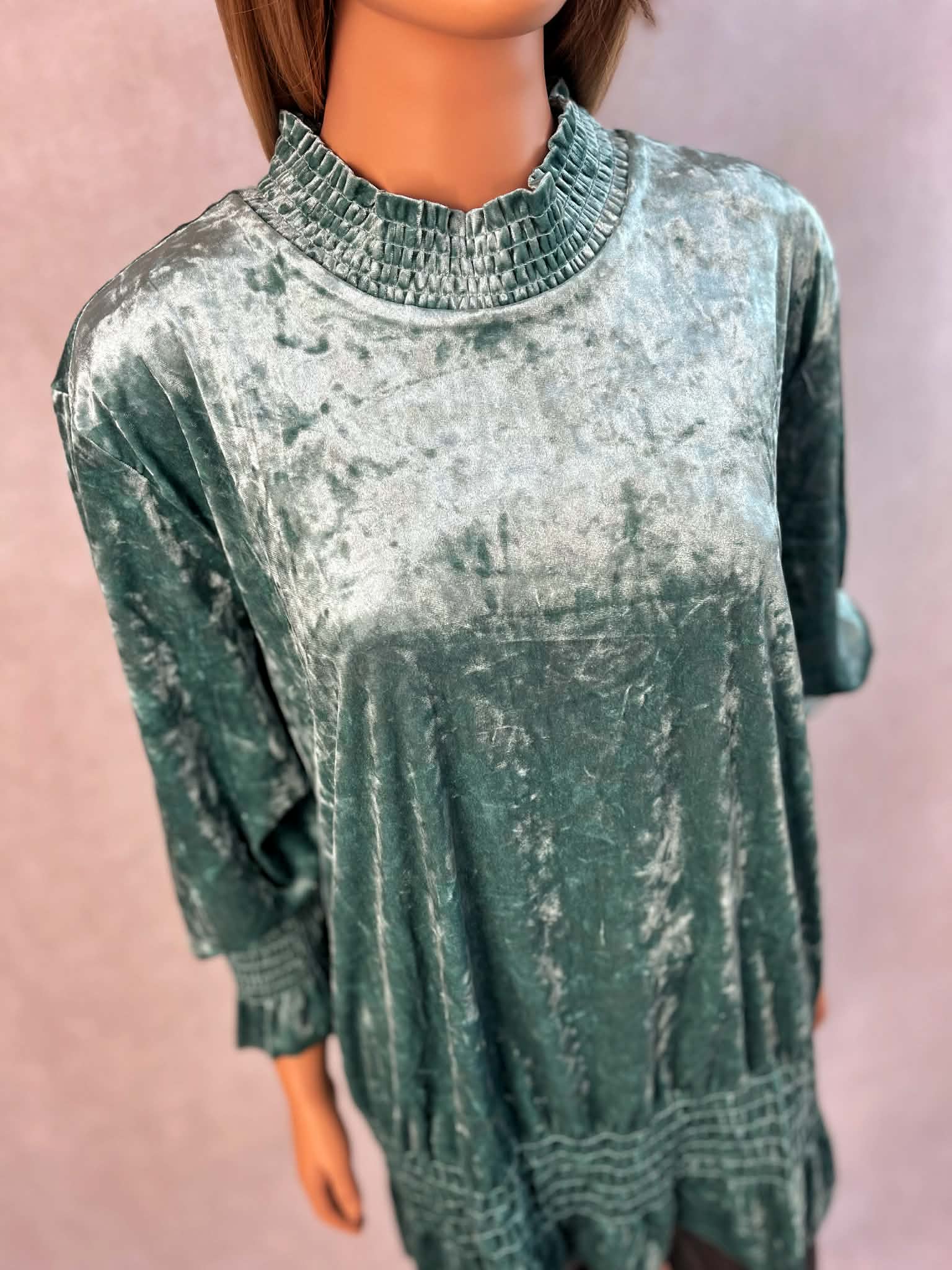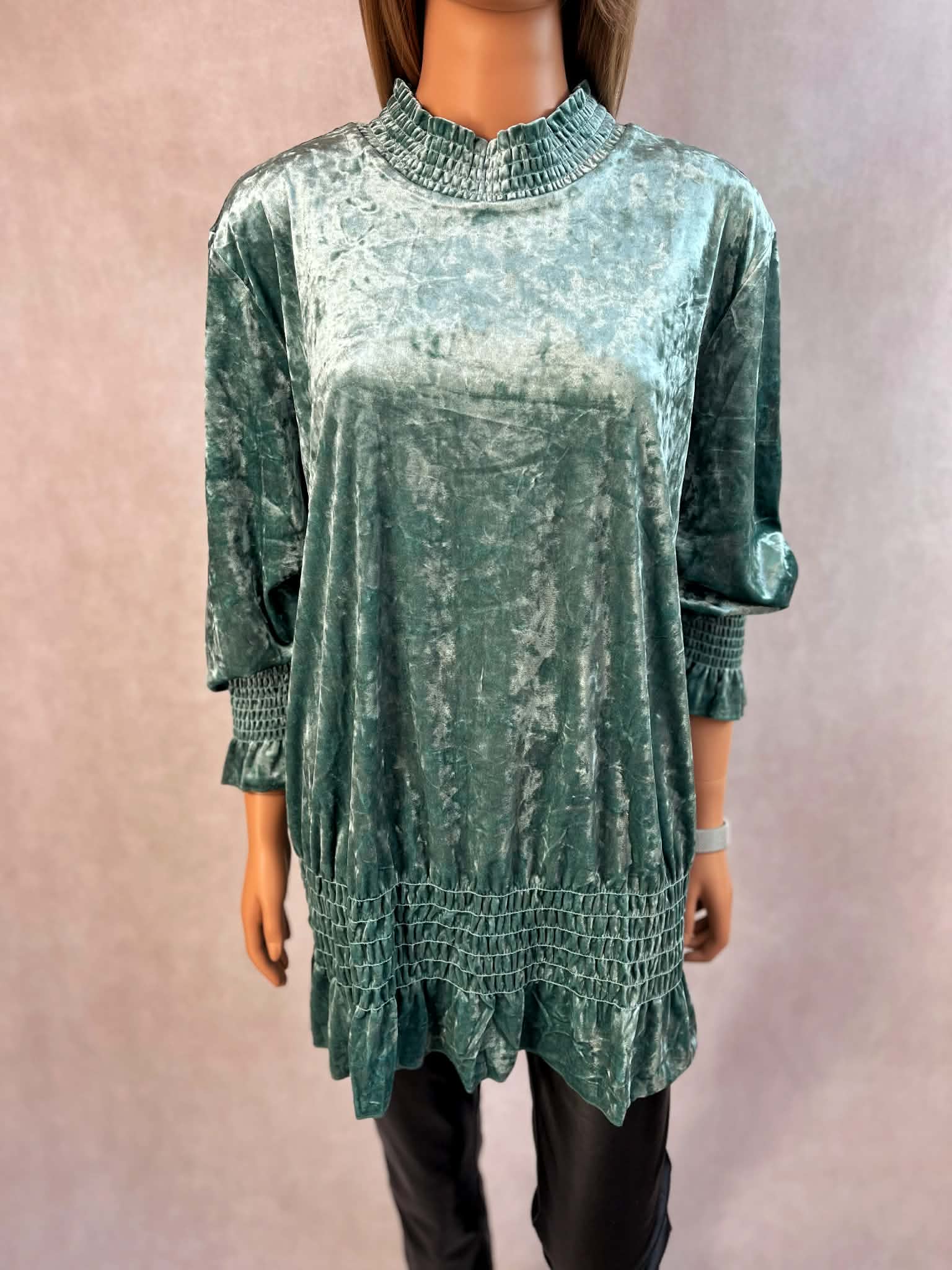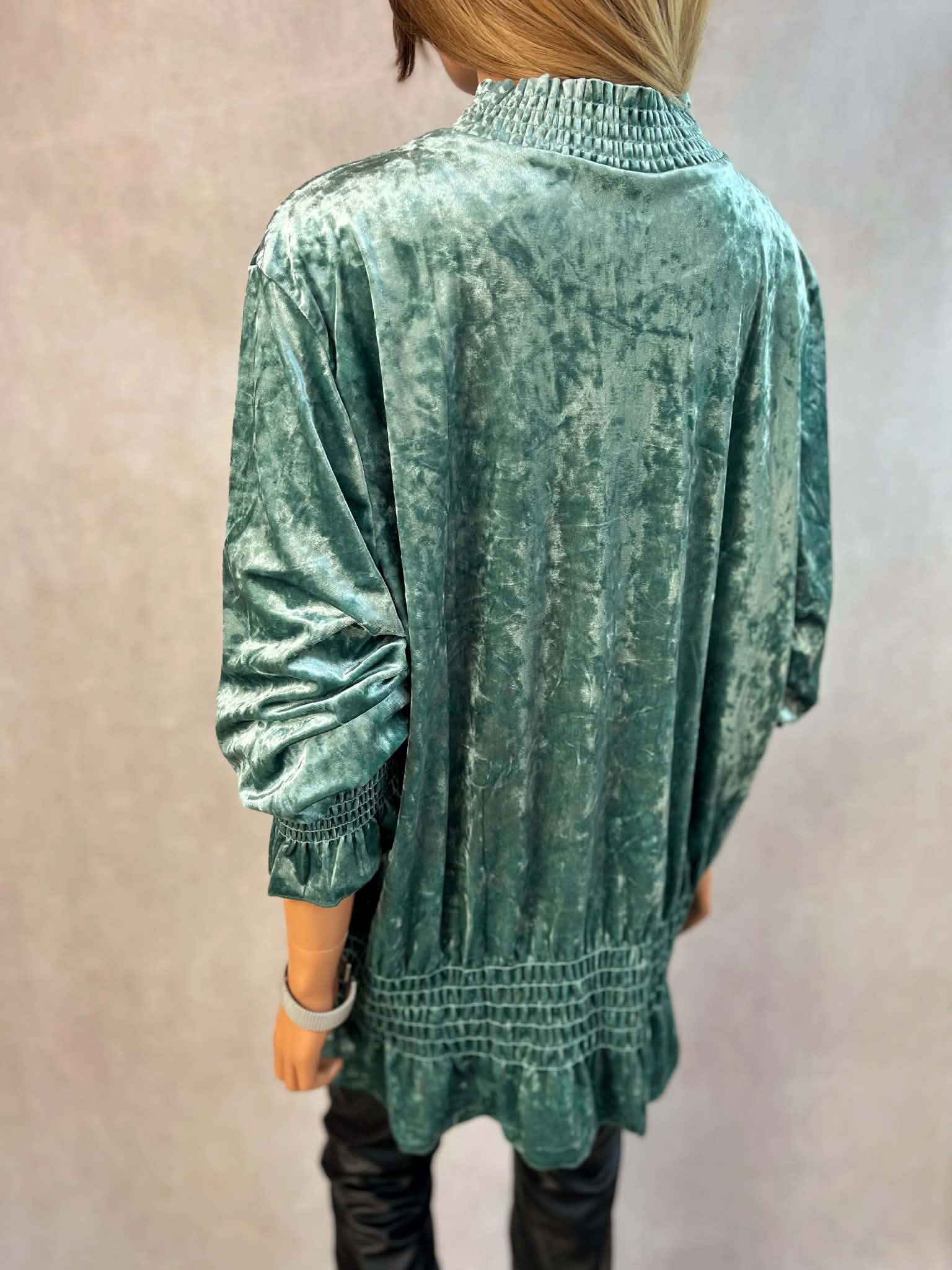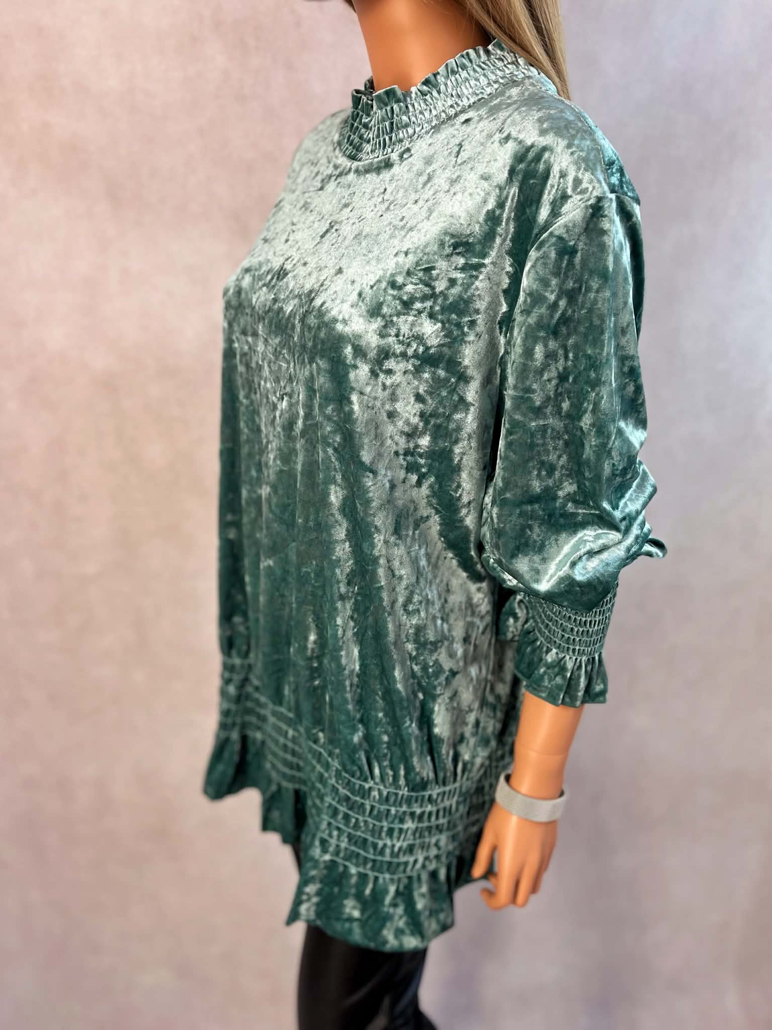 Elegancka zielona tunika damska z miękkiego welurowego materiału. Model z efektownym marszczeniem przy szyi, rękawach oraz na dole, który pięknie układa się na sylwetce. Idealna do codziennych stylizacji oraz na wyjątkowe okazje.